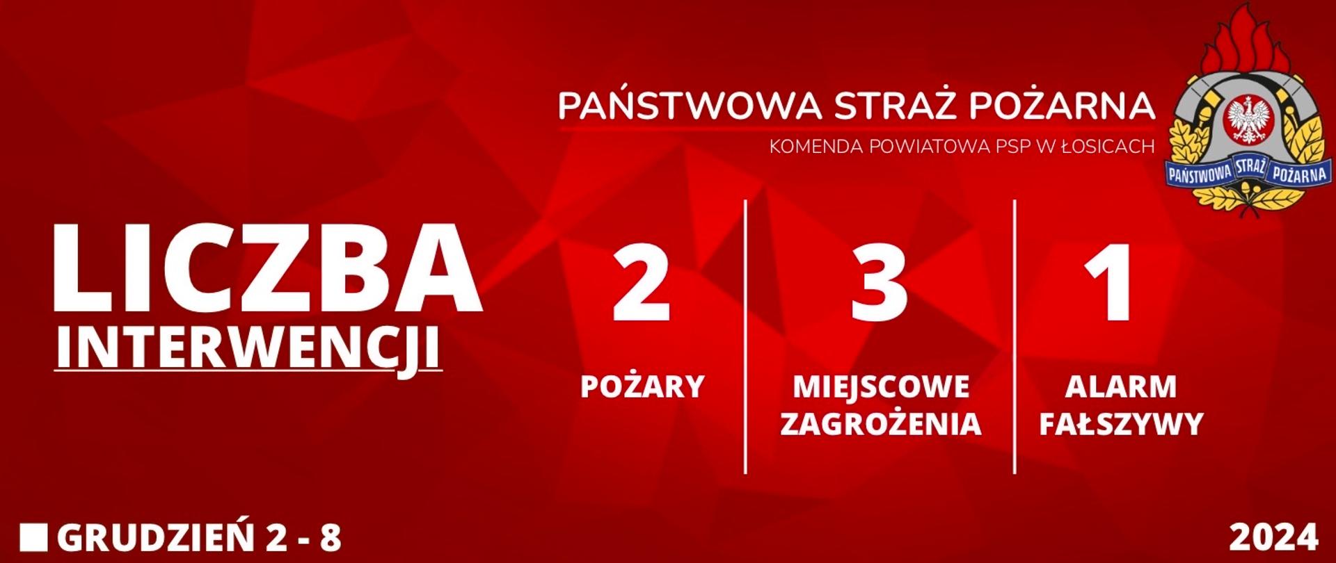 W dniach 2 - 8 grudnia 2024 roku na terenie powiatu łosickiego miały miejsce 2 pożary, 3 miejscowe zagrożenia i 1 alarm fałszywy.