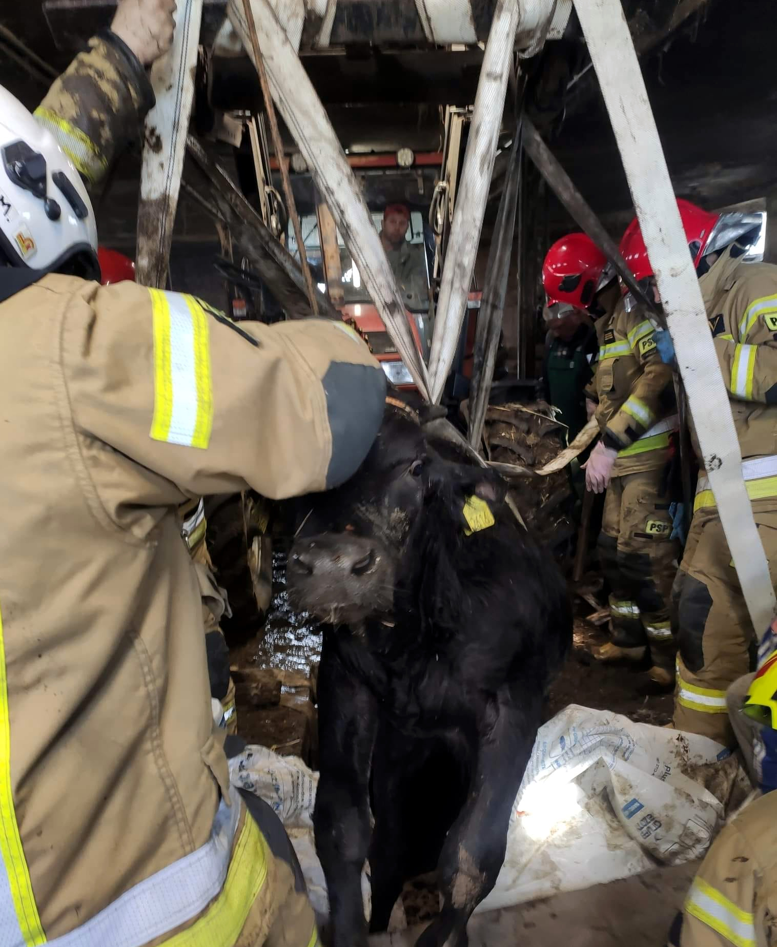 Przy pomocy pił tnących wykonano otwór w betonowym zbiorniku umożliwiający dostęp do byczka i możliwości podjęcia próby ewakuacji. Dotarcie do poszkodowanego było utrudnione ze względu na ciasny i ciemny zbiornik na nieczystości, w którym się znajdowało. Dzięki kreatywności ratowników i dostępnej na miejscu ładowarce teleskopowej stworzono swego rodzaju uprząż skonstruowaną z węży pożarniczych i ewakuowano zwierzę na powierzchnię. Byk został przekazany lekarzowi weterynarii, który przybył na miejsce zdarzenia.