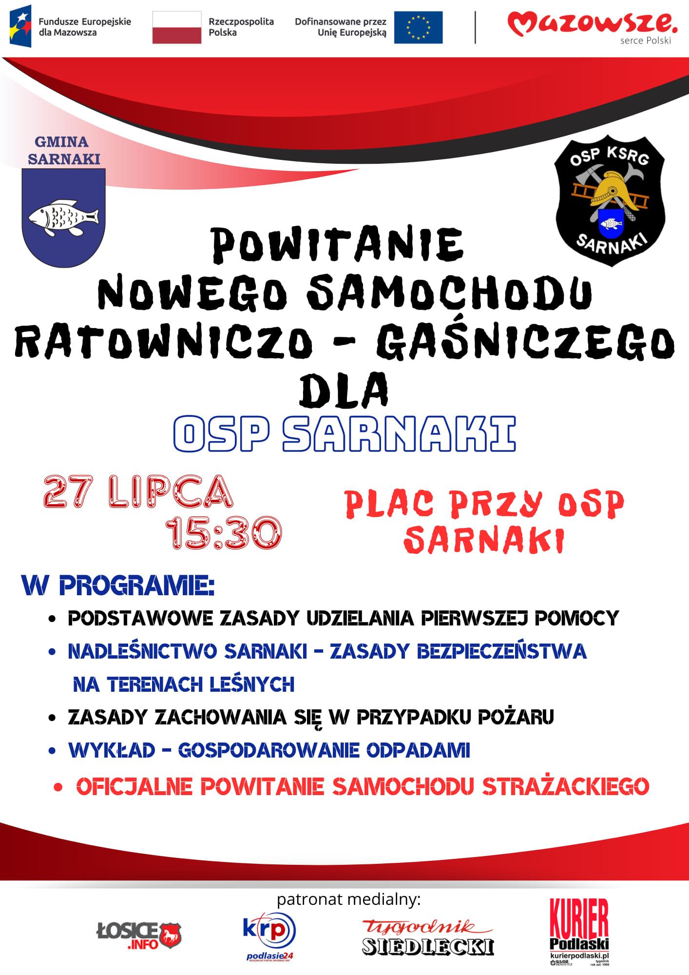 Ochotnicza Straż Pożarna w Sarnakach zaprasza wszystkich chętnych na powitanie nowego samochodu ratowniczo - gaśniczego. Wydarzenie zaplanowano na 27 lipca o godz. 15:30 przy sarnackiej remizie.