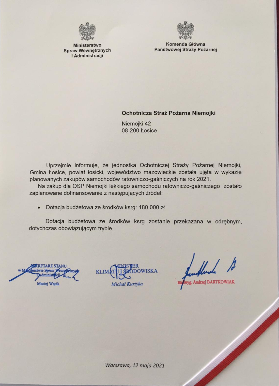 Przyznanie dotacji na zakup lekkiego samochodu ratowniczo gaśniczego dla OSP Niemojki