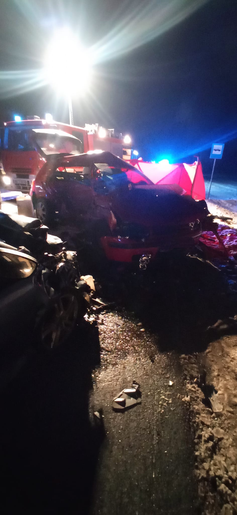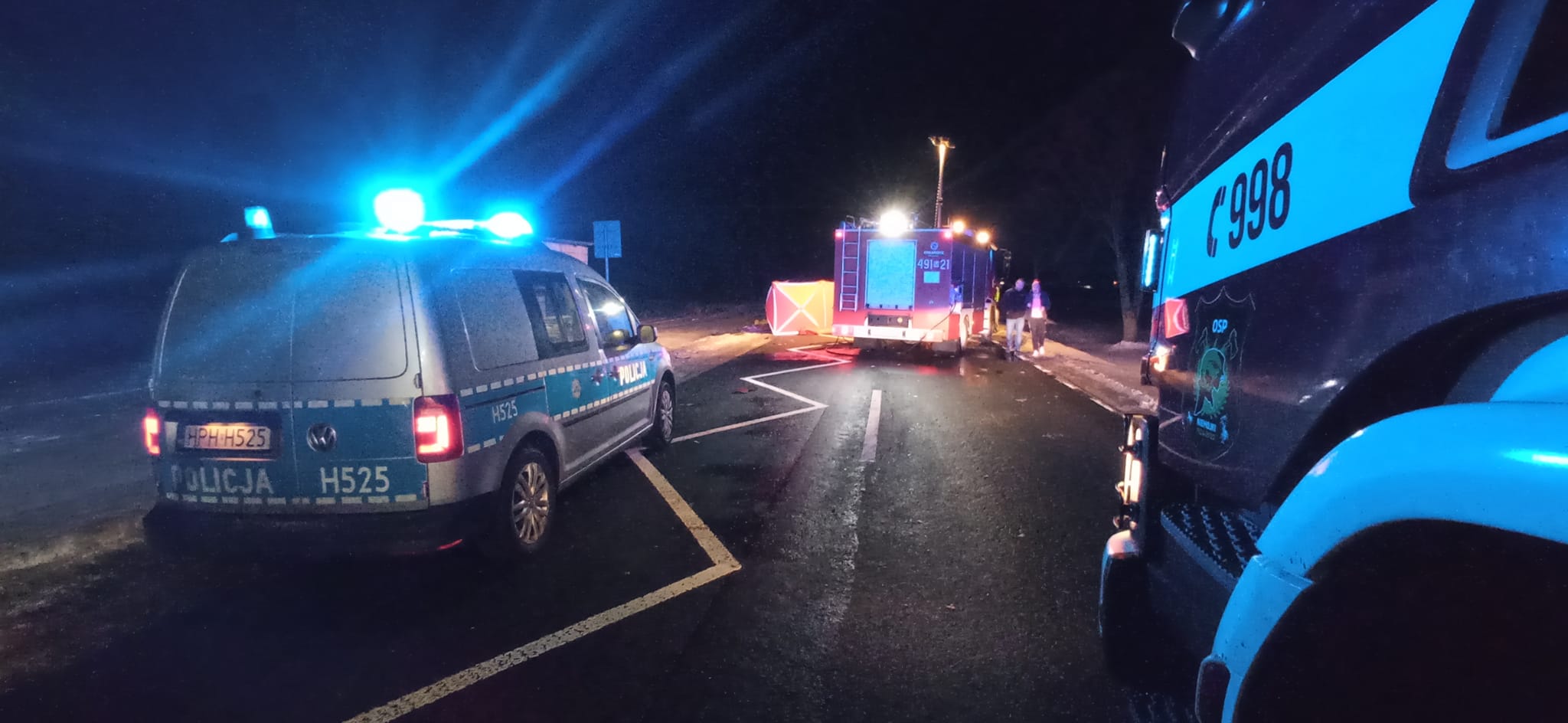 Po dojeździe na miejsce zdarzenia okazało się, że w wypadku wzięły udział 3 pojazdy - dwa samochody osobowe i ciężarówka. Samochód ciężarowy uderzył w drzewo i w całości znajdował się poza jezdnią. Na drodze znajdowały się dwa samochody osobowe. Kierowca jednego z nich znajdował się w pojeździe nieprzytomny, bez oznak życia. Strażacy zabezpieczyli miejsce zdarzenia, zablokowano ruch drogowy, równocześnie ewakuowano poszkodowanego i przekazano Zespołowi Ratownictwa Medycznego, który odstąpił od czynności resuscytacyjnych. Nie zagrażających życiu obrażeń doznał kierowca ciężarówki narodowości mołdawskiej, który został przetransportowany do szpitala. Po odpowiednim zabezpieczeniu miejsca zdarzenia na drodze wprowadzono ruch wahadłowy.