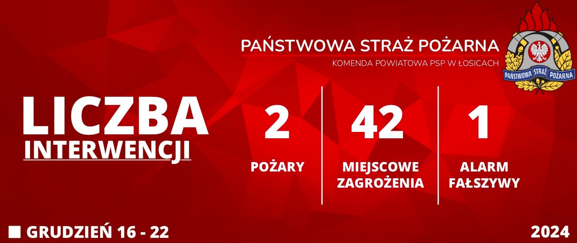 23.12.2024 KP PSP ŁosiceLiczba interwencji | 16 - 22 Grudzień 2024W dniach 16 - 22 grudnia 2024 roku na terenie powiatu łosickiego miały miejsce 2 pożary, 42 miejscowe zagrożenia i 1 alarm fałszywy.