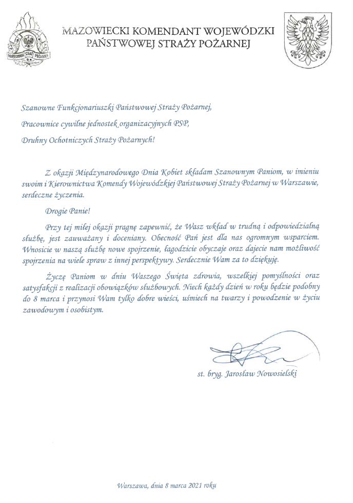 Życzenia Mazowieckiego Komendanta Wojewódzkiego PSP z okazji Dnia Kobiet 08.03.2021 Zdjęcia (1) Pokaż zdjęcie 1 z galerii.