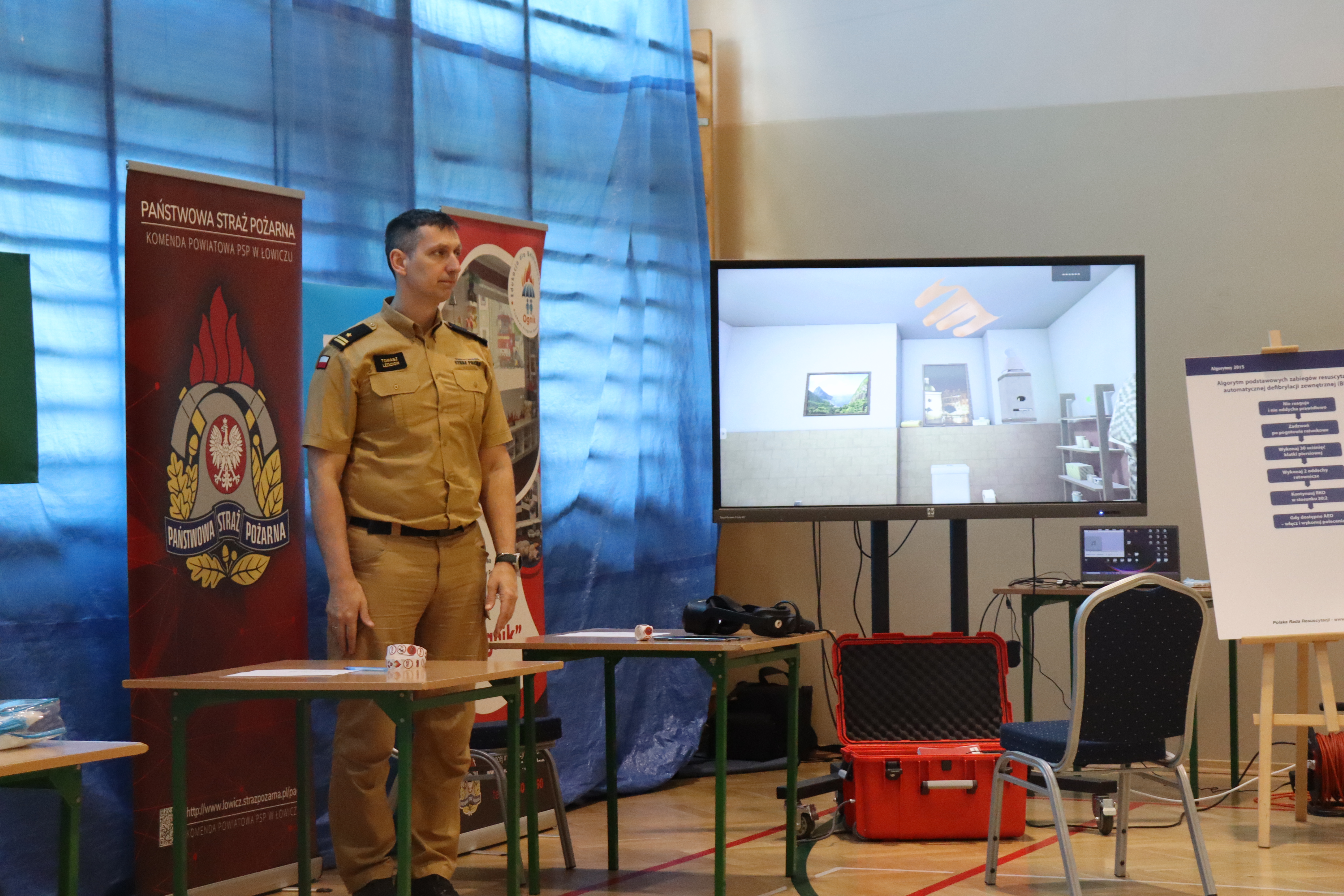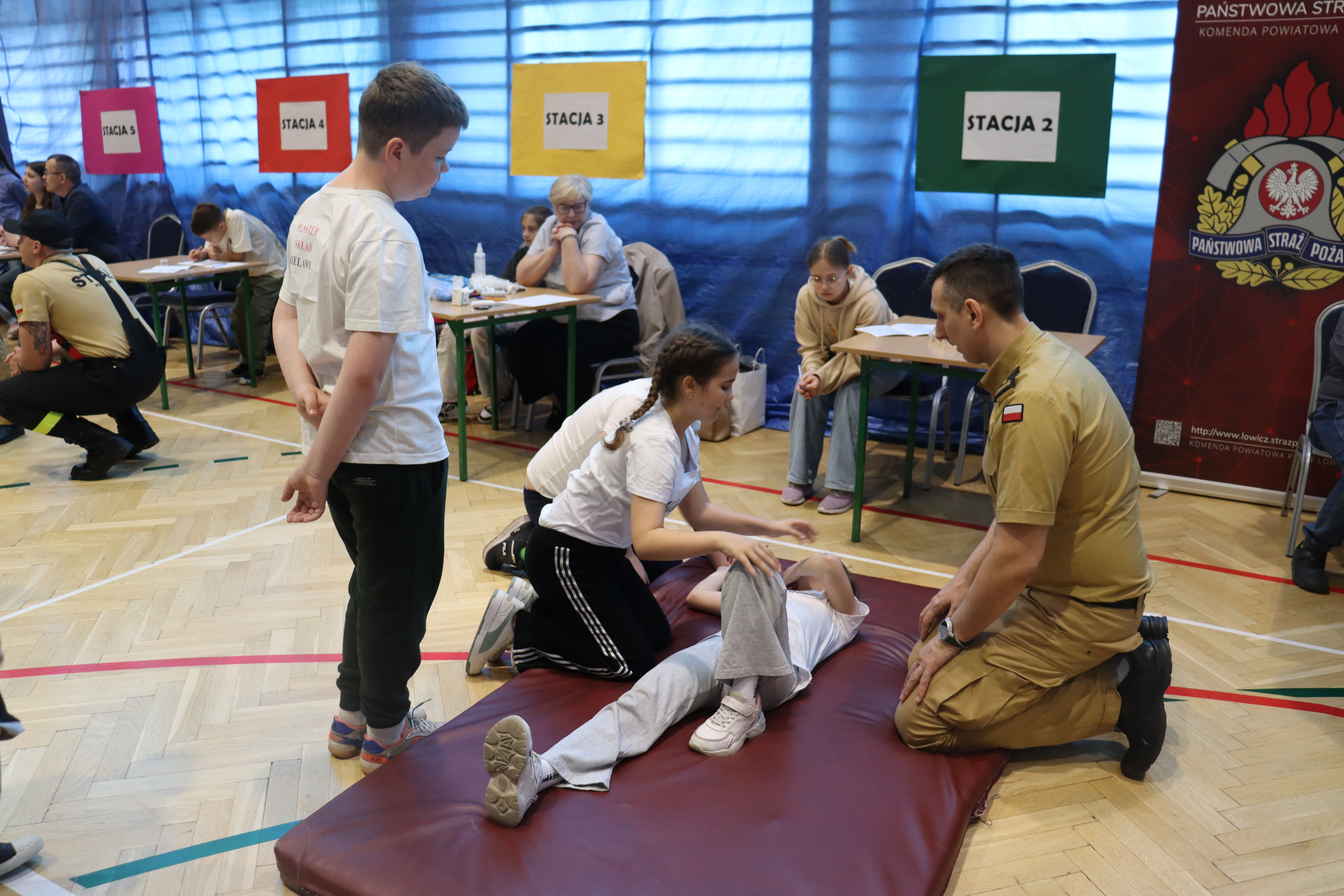 25 kwietnia 2025 funkcjonariusze Komendy Powiatowej Państwowej Straży Pożarnej w Łowiczu uczestniczyli w konkursie międzyszkolnym z pierwszej pomocy pn. „ Moc Ratowania”, który odbył się w Szkole Podstawowej im. Jana Pawła II w Domaniewicach. Celem konkursu było pogłębienie wiedzy uczestników na temat pierwszej pomocy, doskonalenie umiejętności praktycznych oraz rozbudzanie świadomości na różnorodne sytuacje zagrożenia życia. Strażacy przygotowali dwa stanowiska, na których sprawdzali umiejętności i wiedzę uczniów. Na pierwszym stanowisku uczestnicy w goglach VR mieli za zadanie znaleźć niebezpieczne przedmioty lub sytuacje w domu, natomiast na drugim stanowisku uczestnicy musieli odpowiedzieć na pytania oraz ułożyć osobę w pozycji bezpiecznej ustalonej.