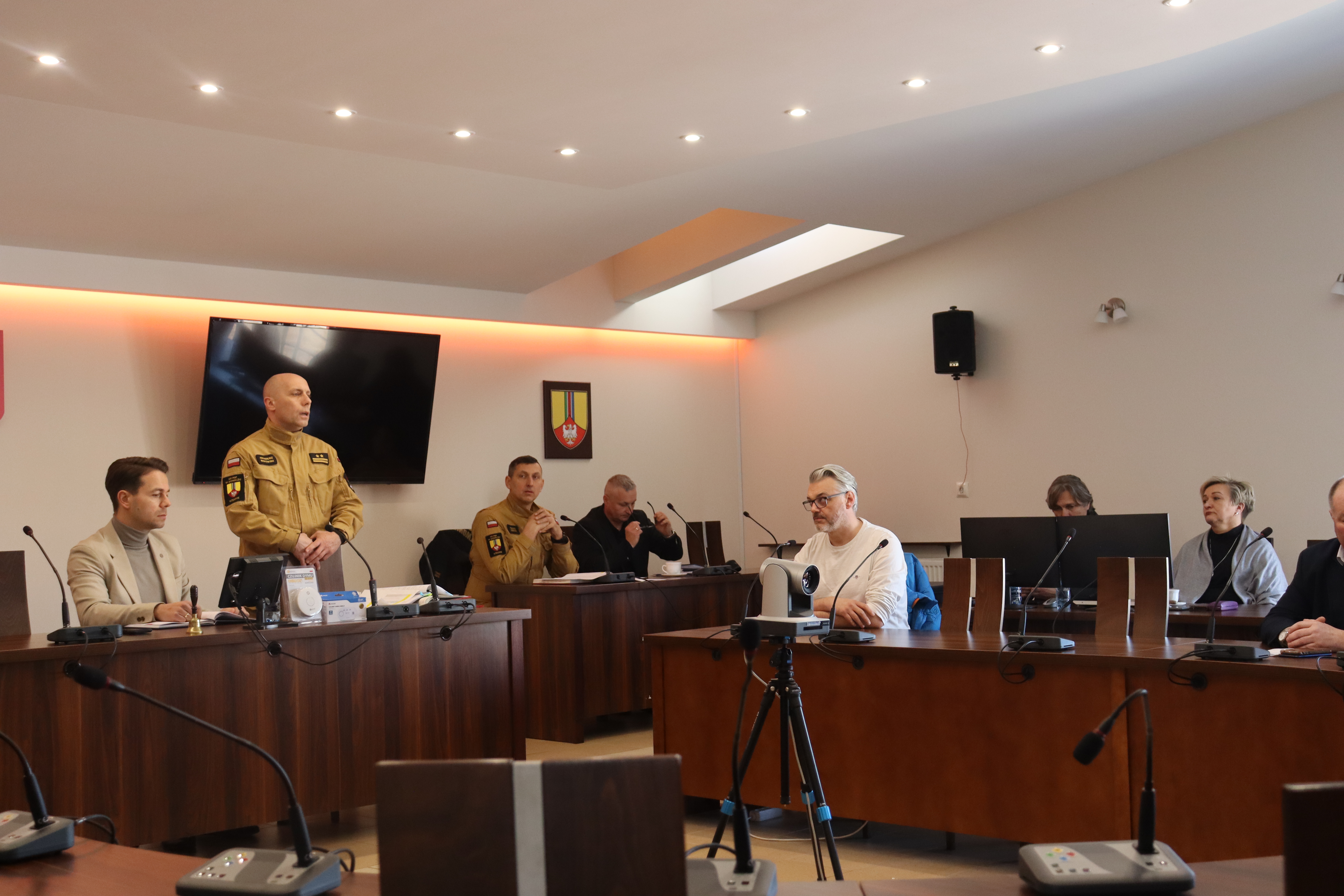 3 lutego 2026 roku w Starostwie Powiatowym w Łowiczu odbyło się spotkanie dotyczące dostosowania systemu selektywnego alarmowania jednostek OSP do celów Ochrony Ludności i Obrony Cywilnej. Podczas spotkania przedstawiciel firmy RSC Radius, Marcin Jaros, przedstawił aspekty techniczne, terminy realizacji oraz prognozowany koszt dodatkowej funkcjonalności systemu ostrzegania i alarmowania ludności o zagrożeniach na terenie danej gminy i powiatu. Druga część spotkania dotyczyła dystrybucji czujek dymu oraz tlenku węgla zakupionych przez MSWiA, które Komenda Powiatowa Państwowej Straży Pożarnej w Łowiczu wraz z PCPR w Łowiczu oraz samorządami z terenu powiatu łowickiego przekaże najbardziej potrzebującym rodzinom z terenu powiatu.
