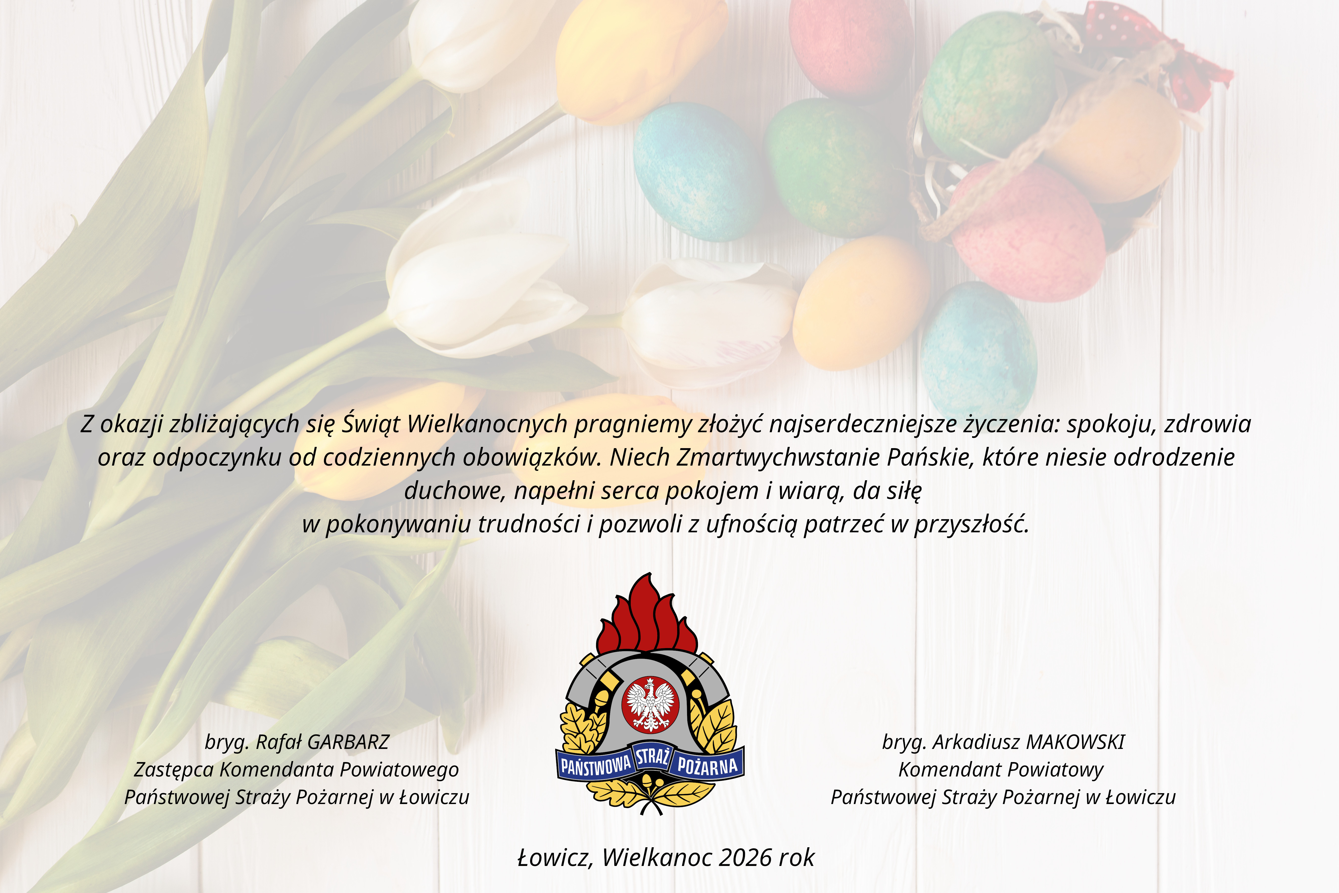 Życzenia Wielkanocne Komendanta Powiatowego Państwowej Straży Pożarnej w Łowiczu 03.04.2026 Zdjęcia (2) Pokaż zdjęcie 1 z galerii. Pokaż zdjęcie 2 z galerii.