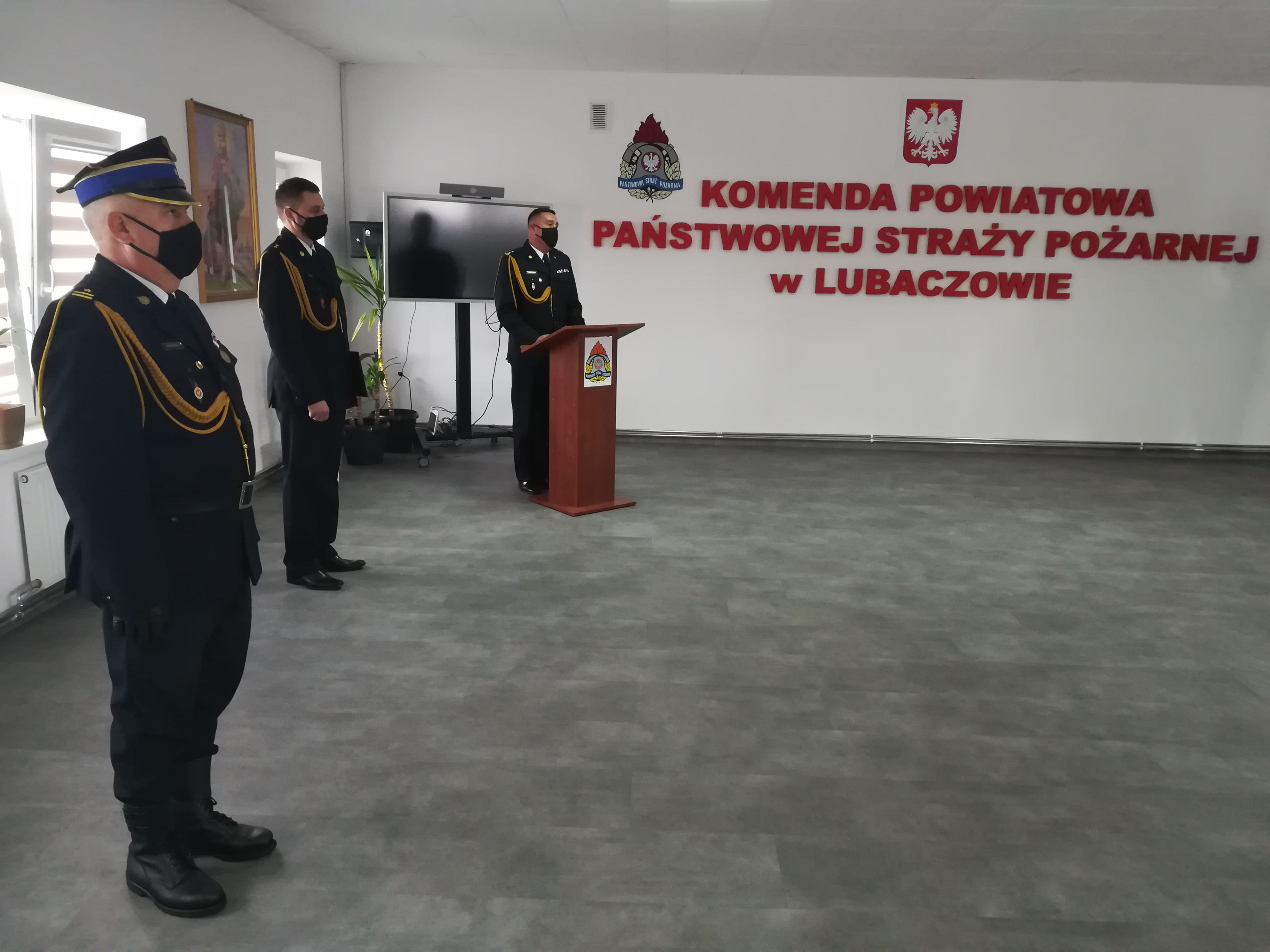 Zgodnie ze scenariuszem uroczystość rozpoczęła się od złożenia meldunku przez dowódcę uroczystości mł.bryg. Dariusza Wałczyka komendantowi powiatowemu Państwowej Straży Pożarnej w Lubaczowie bryg. Januszowi Jabłońskiemu. W dalszej części apelu komendant powiatowy przywitał wszystkich zebranych oraz podziękował za służbę i pracę, wkład włożony w funkcjonowanie ochrony przeciwpożarowej, złożył gratulacje awansowanym oraz życzył dalszych sukcesów zawodowych.
