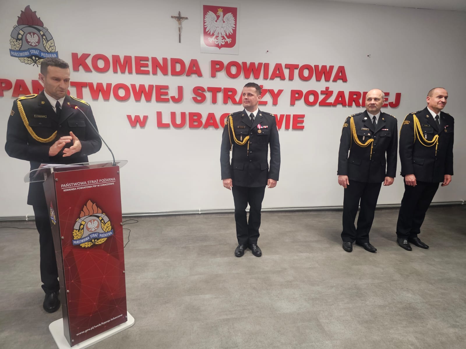 Podczas uroczystości pożegnania funkcjonariusza, która miała miejsce w świetlicy Komendy Powiatowej PSP w Lubaczowie, Komendant Powiatowy PSP w Lubaczowie – mł. bryg. Piotr Szpytma, przedstawił przebieg służby st. ogn. Krzysztofa Tymczyszyna, podziękował za zaangażowanie w codzienne obowiązki służbowe oraz złożył życzenia pomyślności na dalsze lata życia.