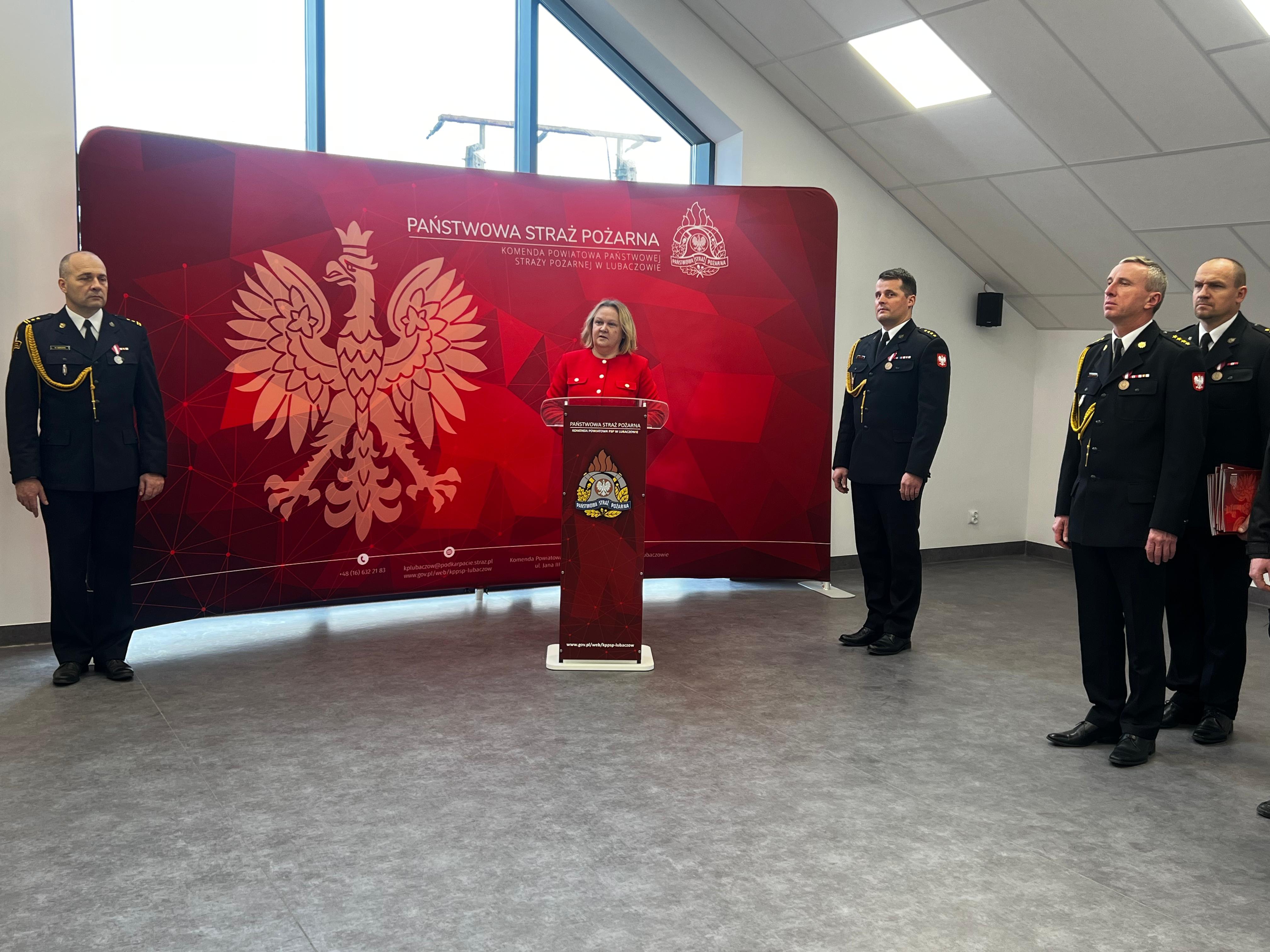 Podczas spotkania, Pani Starosta pogratulowała sukcesu dziękując tym samym za godne reprezentowanie powiatu lubaczowskiego, a także korzystając z możliwości złożyła na ręce Komendanta Powiatowego PSP w Lubaczowie st. kpt. Piotra Szpytmy, życzenia z okazji zbliżających się Świąt Bożego Narodzenia.