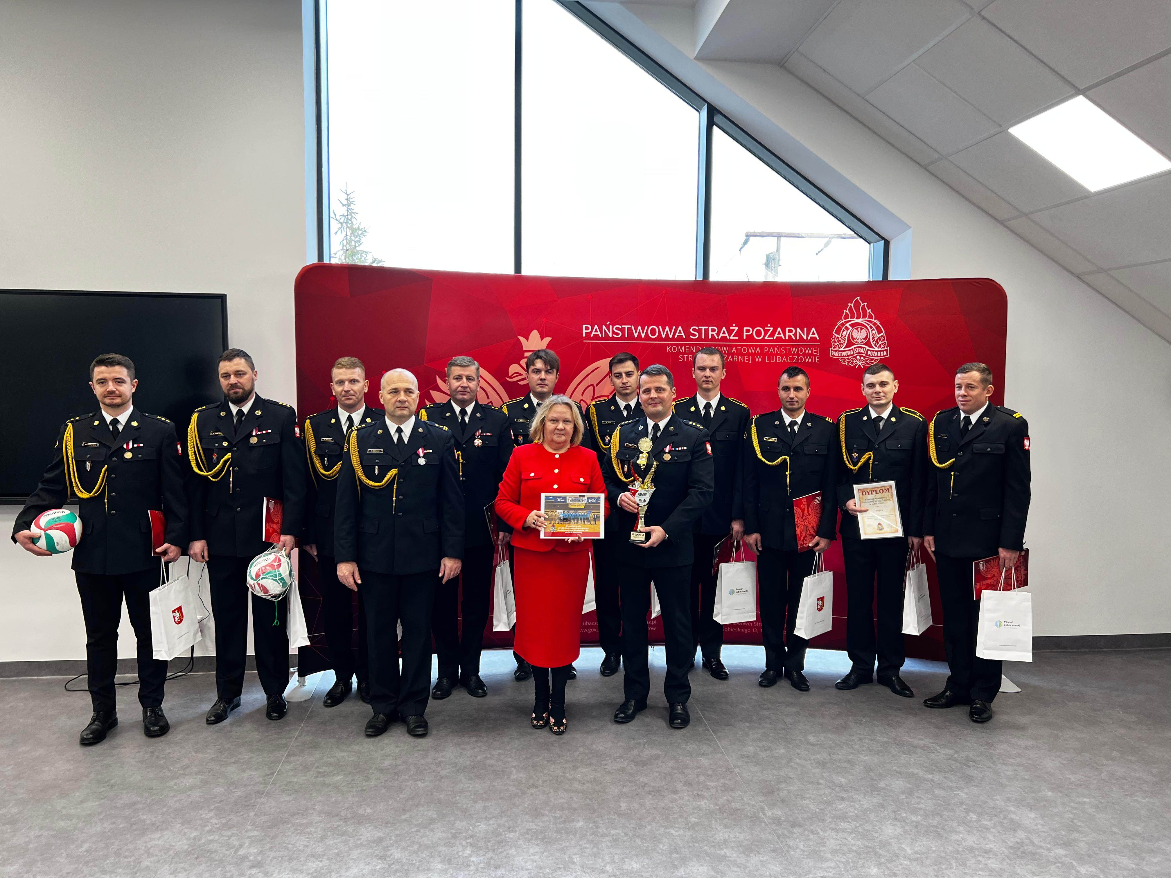 18 grudnia 2024 r. w Komendzie Powiatowej Państwowej Straży Pożarnej w Lubaczowie odbyła się zbiórka funkcjonariuszy KP PSP w Lubaczowie, którzy w tym roku zdobyli wicemistrzostwo Województwa Podkarpackiego Strażaków w Piłce Siatkowej, z Starostą powiatu lubaczowskiego Panią Barbarą Broź.