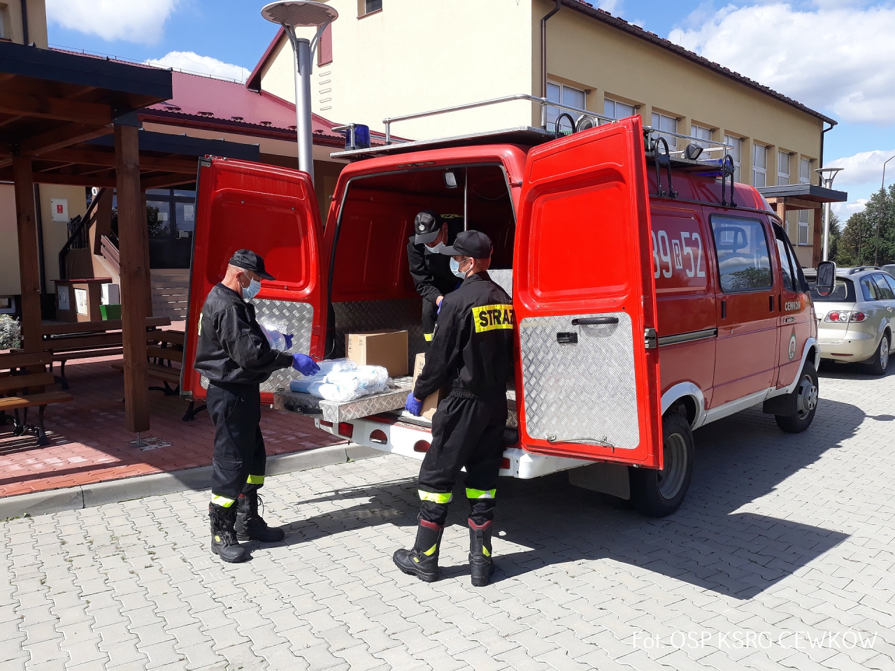 Strażacy z jednostek ochotniczych straży pożarnych i Państwowej Straży Pożarnej łącznie przekazali 960 opakowań (5 litrowego) płynu do dezynfekcji oraz 19550 sztuk maseczek.