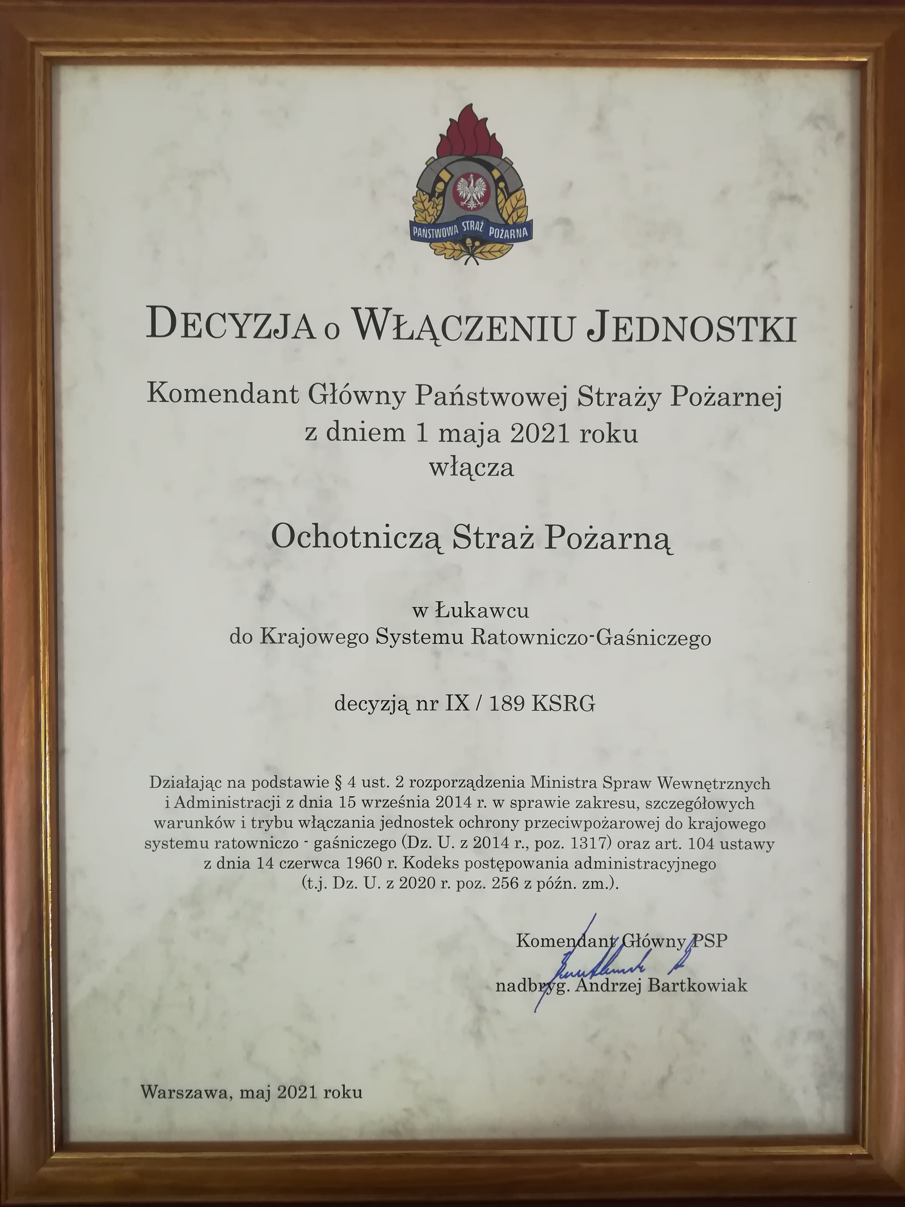 14 maja 2021 r. w świetlicy komendy powiatowej Państwowej Straży Pożarnej w Lubaczowie nastąpiło wręczenie decyzji o włączeniu jednostki Ochotniczej Straży Pożarnej w Łukawcu do Krajowego Sytemu Ratowniczo-Gaśniczego.