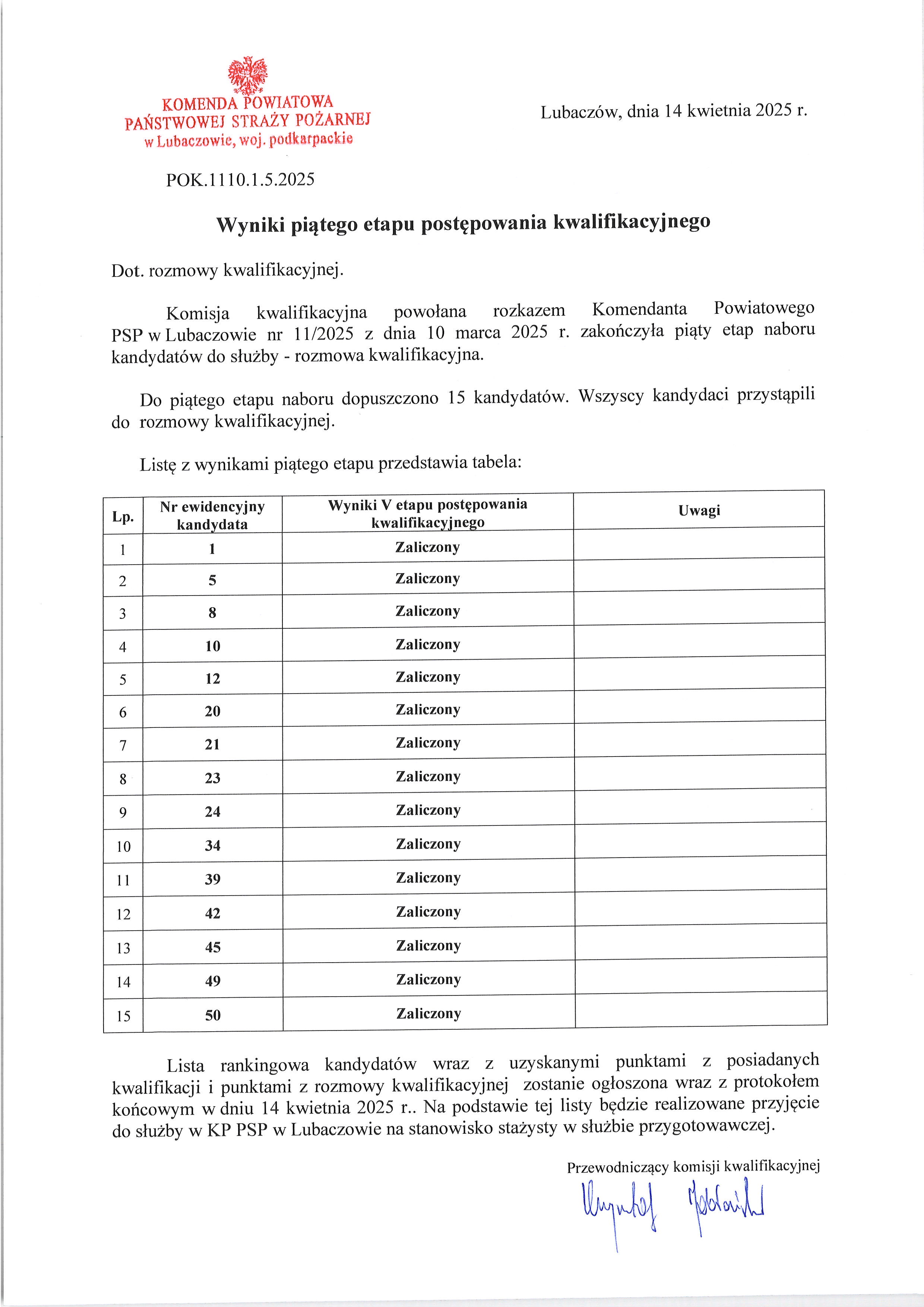 Wyniki V etapu postępowania kwalifikacyjnego