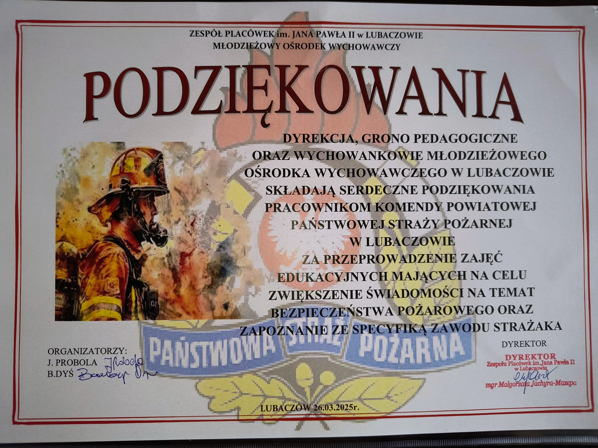 W dniu 26 marca 2025 roku strażacy z JRG Lubaczów na terenie Zespołu Placówek im. Jana Pawła II w Lubaczowie przeprowadzili zajęcia edukacyjne dla wychowanków Młodzieżowego Ośrodka Wychowawczego. Młodzież zapoznano ze specyfiką zawodu strażaka, przeprowadzono pokaz oraz prezentację sprzętu ratowniczego.