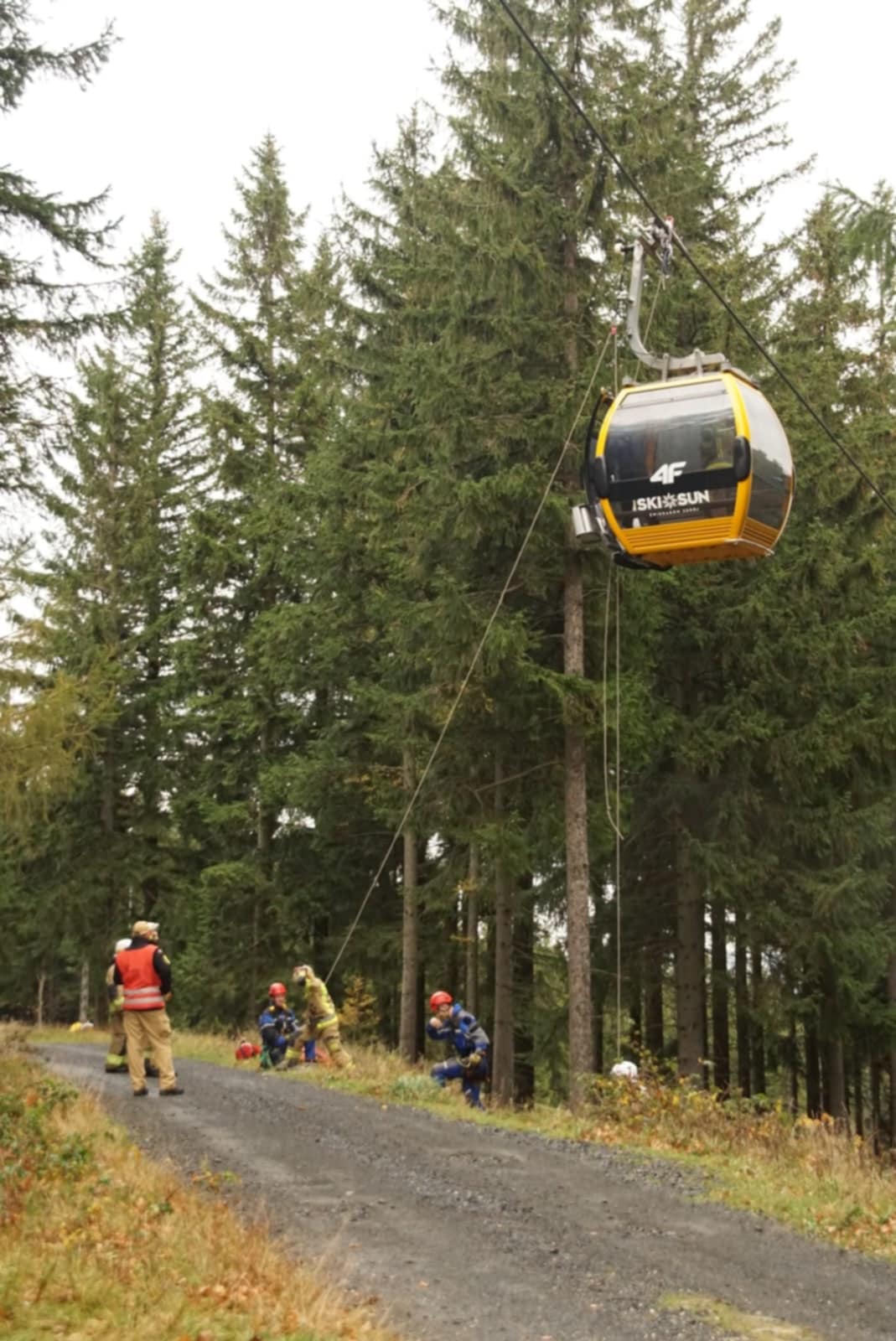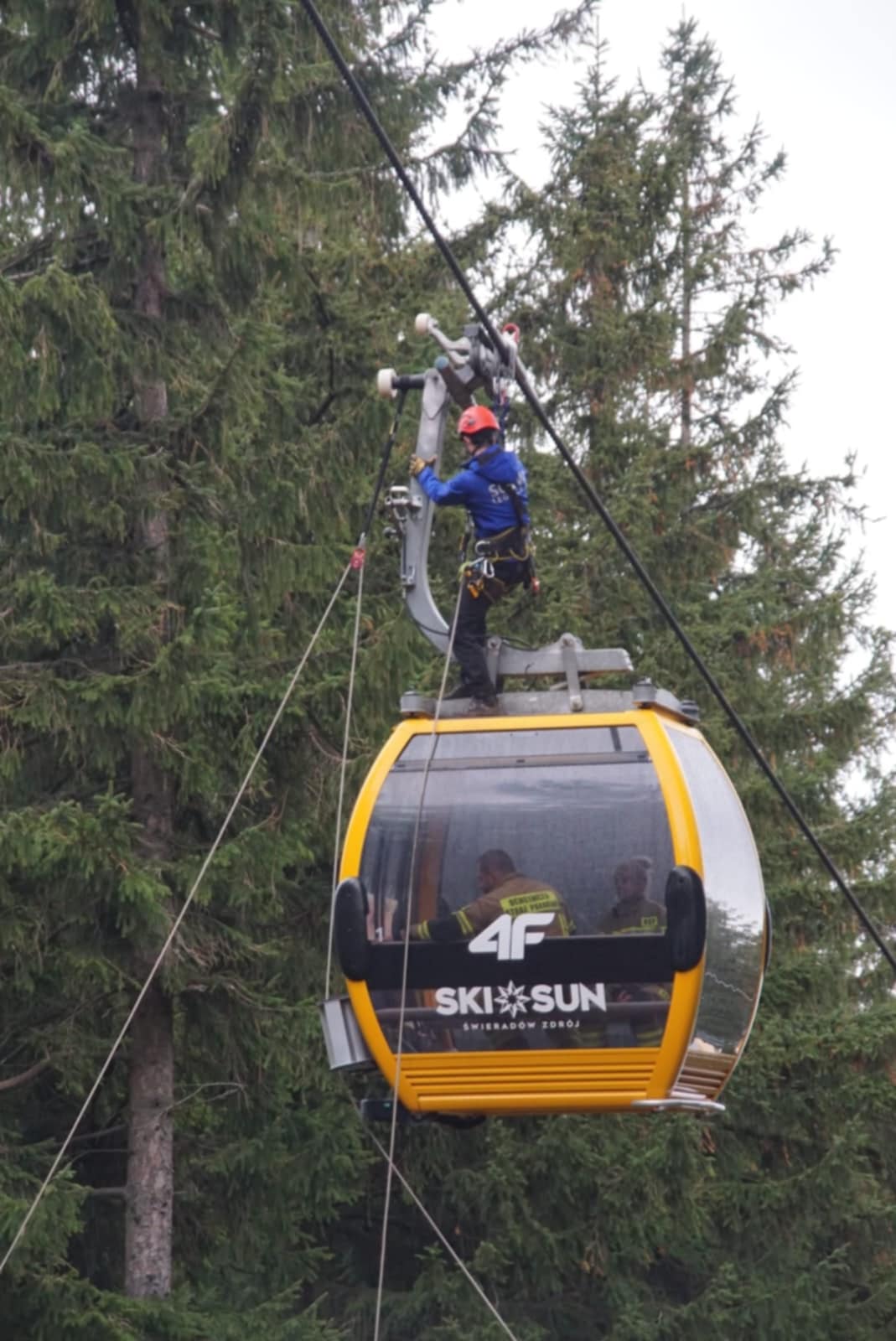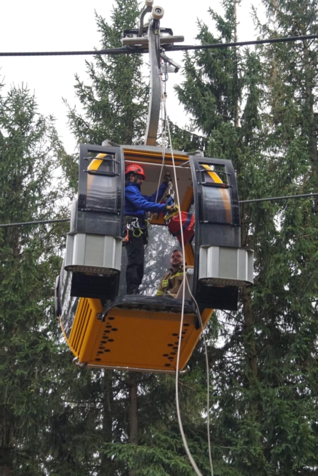 W drugim epizodzie obsługa stacji zgłosiła, że z powodu skutków pożaru nie można uruchomić zatrzymanej kolejki a w kabinach znajdują się turyści wymagający ewakuacji. Tutaj zaangażowano do działań trzy grupy wysokościowe: SGRWys „Legnica 3” (Specjalistyczna Grupa Ratownictwa Wysokościowego utworzona przez przeszkolonych strażaków z JRG w Chojnowie), grupa wysokościowa z GOPR i grupa wysokościowa zarządcy kolejki gondolowej. Za pomocą technik linowych sprawnie ewakuowano osoby z kabin do poziomu gruntu, gdzie były podejmowane przez strażaków i odtransportowane do zaimprowizowanego punktu medycznego. Utworzono go na bazie Kompanii Logistycznej „Dolny Śląsk”, której część biorąca udział w ćwiczeniach, to również strażacy z JRG Lubań. Pozwoliło to na sprawną segregację poszkodowanych i udzielenie pomocy medycznej w komfortowych warunkach.