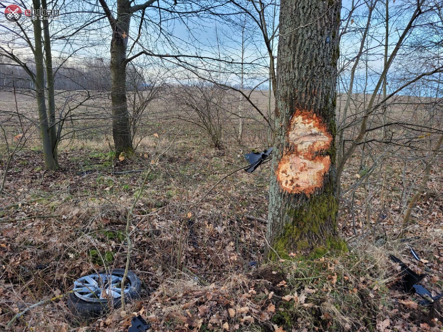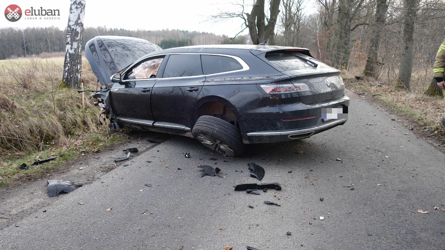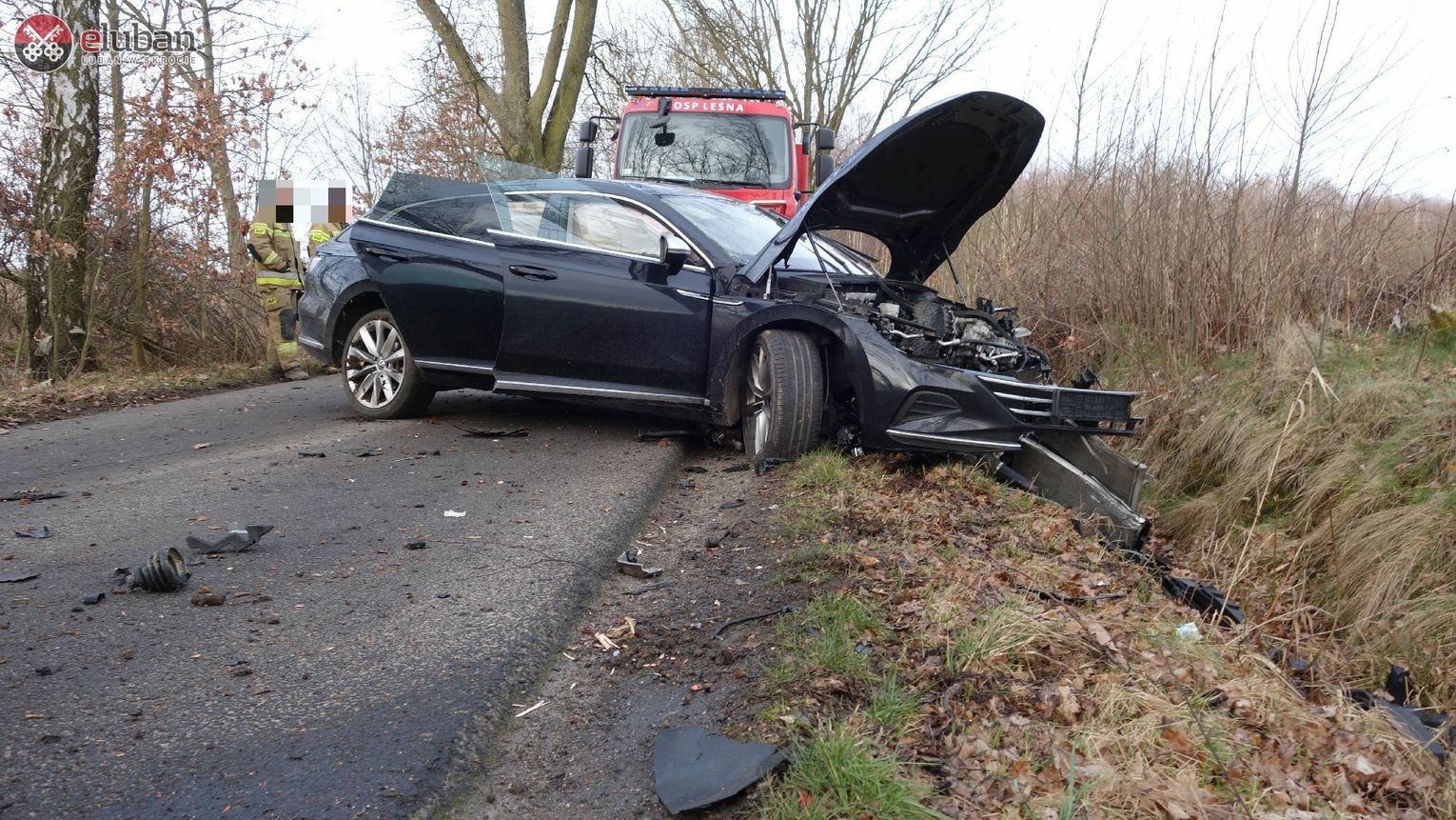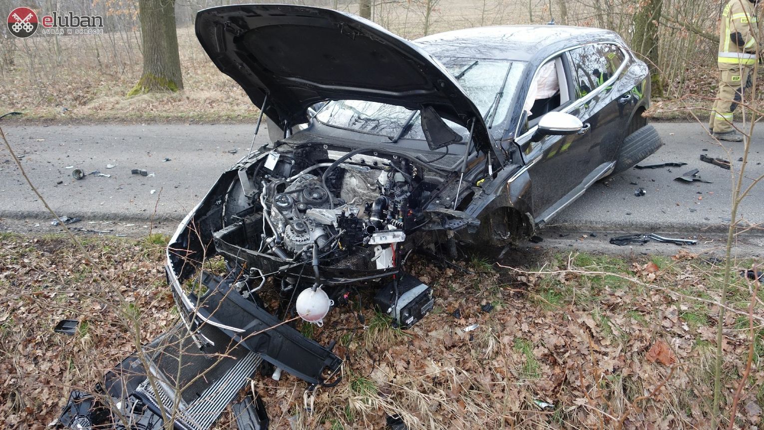 Okazało się, że samochód, po uderzeniu w drzewo, uległ znacznemu zniszczeniu – nawet akumulator oderwał się od pojazdu ! Działania zastępów polegały na udzieleniu pomocy medycznej jednej osobie poszkodowanej i przekazaniu jej ratownikom ZRM. W tym samym czasie zabezpieczono miejsce zdarzenia, usunięto niewielkie wycieki płynów eksploatacyjnych z samochodu. Na miejscu zdarzenia współpracował także przedstawiciel zarządcy drogi.
