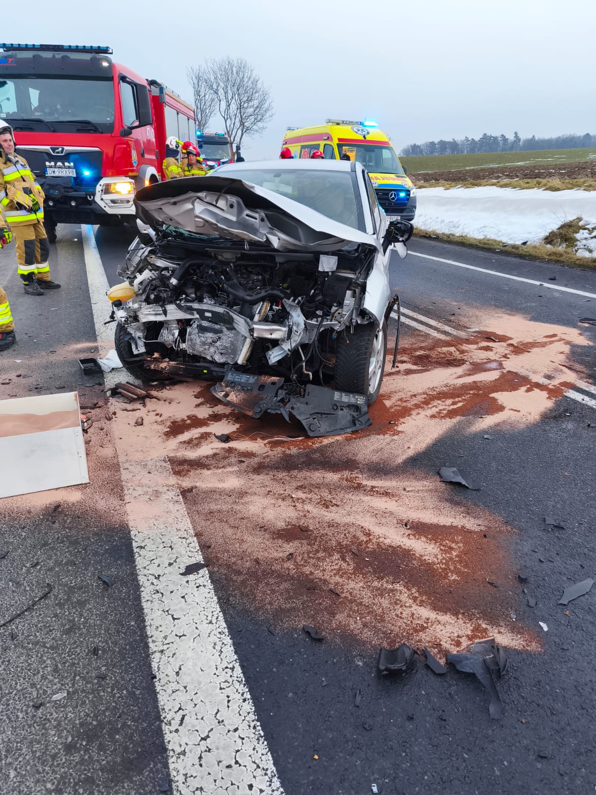 Na miejsce jako jeden z pierwszych dotarł będący po służbie asp. Daniel Bryłkowski pełniący obowiązki zastępcy Dowódcy JRG w Lubaniu, który po zabezpieczeniu miejsca zdarzenia natychmiast przystąpił do udzielenia pomocy poszkodowanym. Powiadomił dyżurnego Stanowiska Kierowania Komendanta Powiatowego PSP w Lubaniu. Strażak po udzieleniu pomocy wspierał psychicznie uczestników zdarzenia, uspokajając ich do czasu przyjazdu zastępów JRG Lubań.