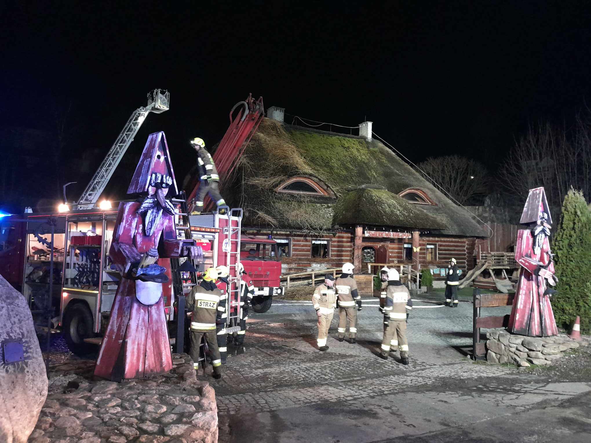 Natychmiast zadysponowano zastępy z JRG Lubań (3 zastępy), OSP Świeradów Zdrój (2), OSP Pobiedna, OSP Świecie i OSP Leśna. Na miejscu pożaru okazało się, że pali się strzecha restauracji. Pracownicy restauracji podjęli próbę gaszenia przed przyjazdem straży pożarnych. Podano prądy wody działając z zewnątrz i wewnątrz budynku. Pożar rozwijał się w głąb strzechy. Konieczne było zdemontowanie części pokrycia, by ugasić wszystkie zarzewia ognia. W trakcie działań strażakom pomogli energetycy i gazownicy odłączając media od budynku. Patrol policji zabezpieczał drogę w trakcie dojazdu zastępów i prowadzenia działań. W kulminacyjnym momencie w działaniach uczestniczył taki sprzęt, jak drabina mechaniczna SCD-40 (JRG Lubań), podnośnik hydrauliczny SH-18 (4 zastęp z OSP Świeradów Zdrój). Podawano 5 prądów wody. Trudna i męcząca praca strażaków trwała praktycznie ponad 4 godziny. W tym czasie zastęp OSP Pisarzowice zabezpieczał rejon Lubania. Ze względu na możliwość ponownego rozpalenia się strzechy zastęp z OSP Świeradów Zdrój pozostał na miejscu pożaru do północy.