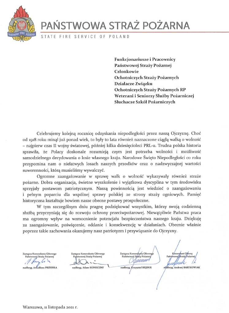 List kierownictwa Państwowej Straży Pożarnej z okazji Święta Niepodległości.