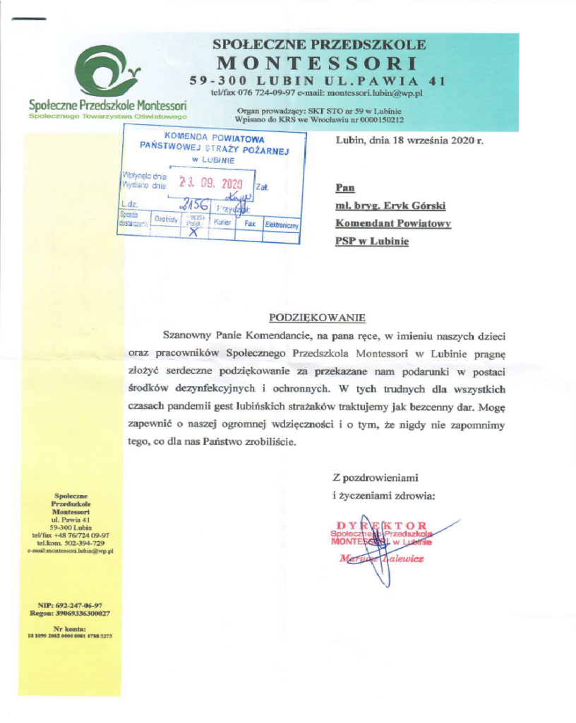 W związku z obecną sytuacją epidemiologiczną panującą na terenie kraju oraz rozpoczęciem roku szkolnego w miesiącu sierpniu i wrześniu 2020 roku na terenie Komendy Powiatowej Państwowej Straży Pożarnej w Lubinie odbyła się dystrybucja środków ochrony indywidualnej. Dystrybucja została dokonana na mocy uzgodnień międzyresortowych pomiędzy Ministerstwem Zdrowia i Ministerstwem Spraw Wewnętrznych i Administracji. Agencja Rezerw Materiałowych odpowiedzialna była za dostarczenie płynów dezynfekcyjnych oraz maseczek do magazynów dystrybucyjnych zorganizowanych na terenie obiektów Państwowej Straży Pożarnej. Łącznie do szkół i przedszkoli z terenu powiatu lubińskiego wydanych zostało 16 830 litrów płynu dezynfekcyjnego oraz 54 000 szt. maseczek.