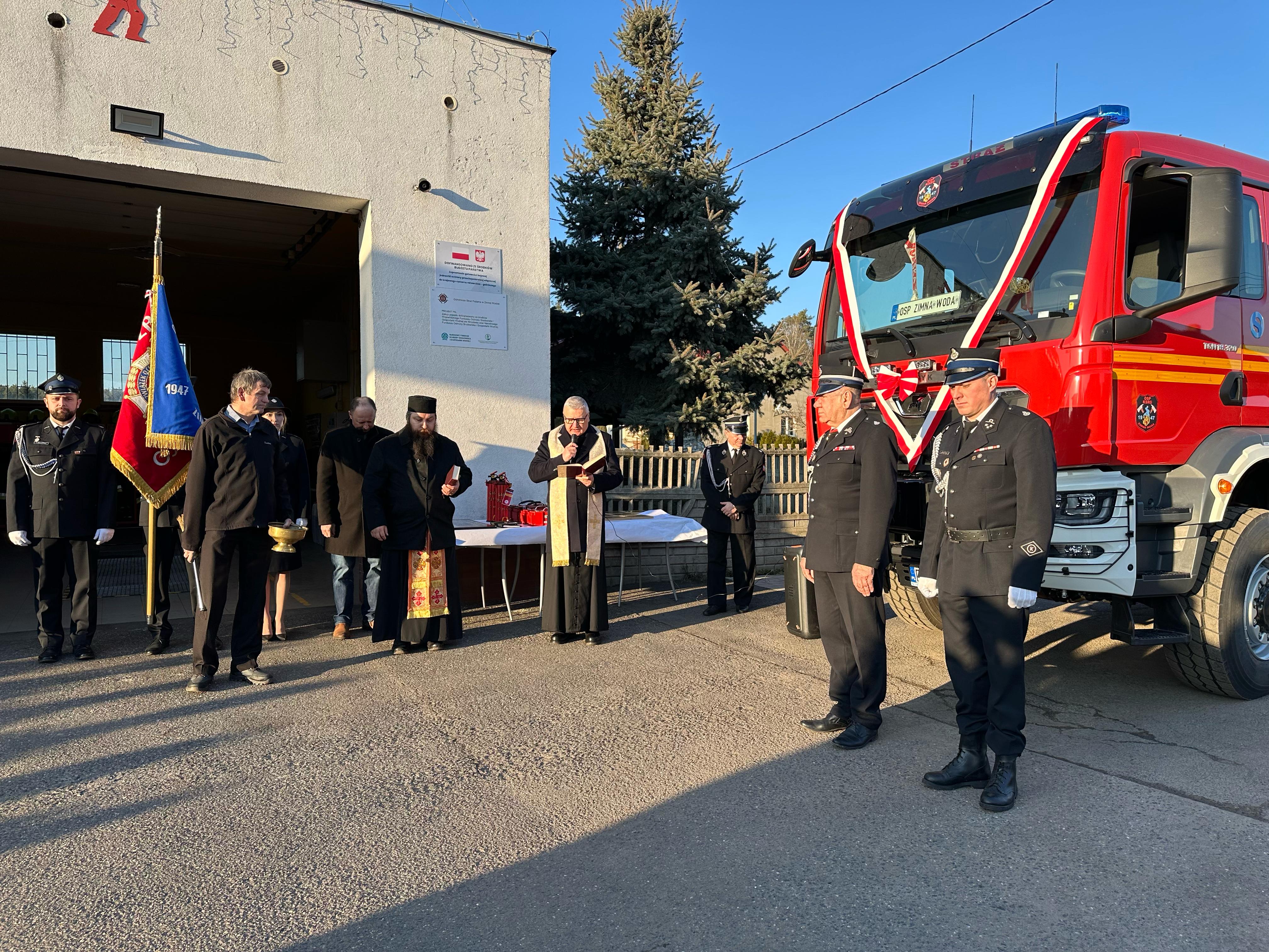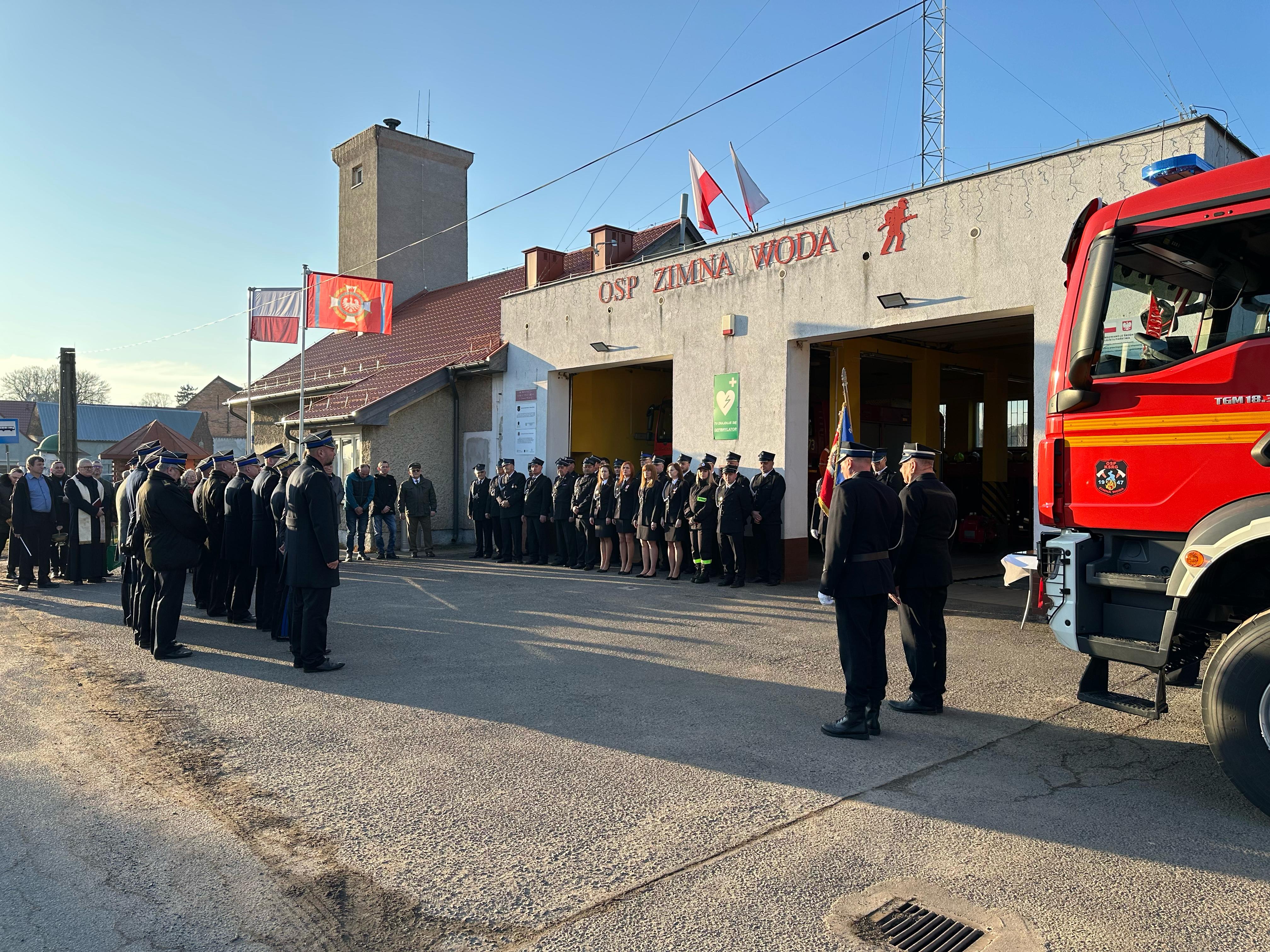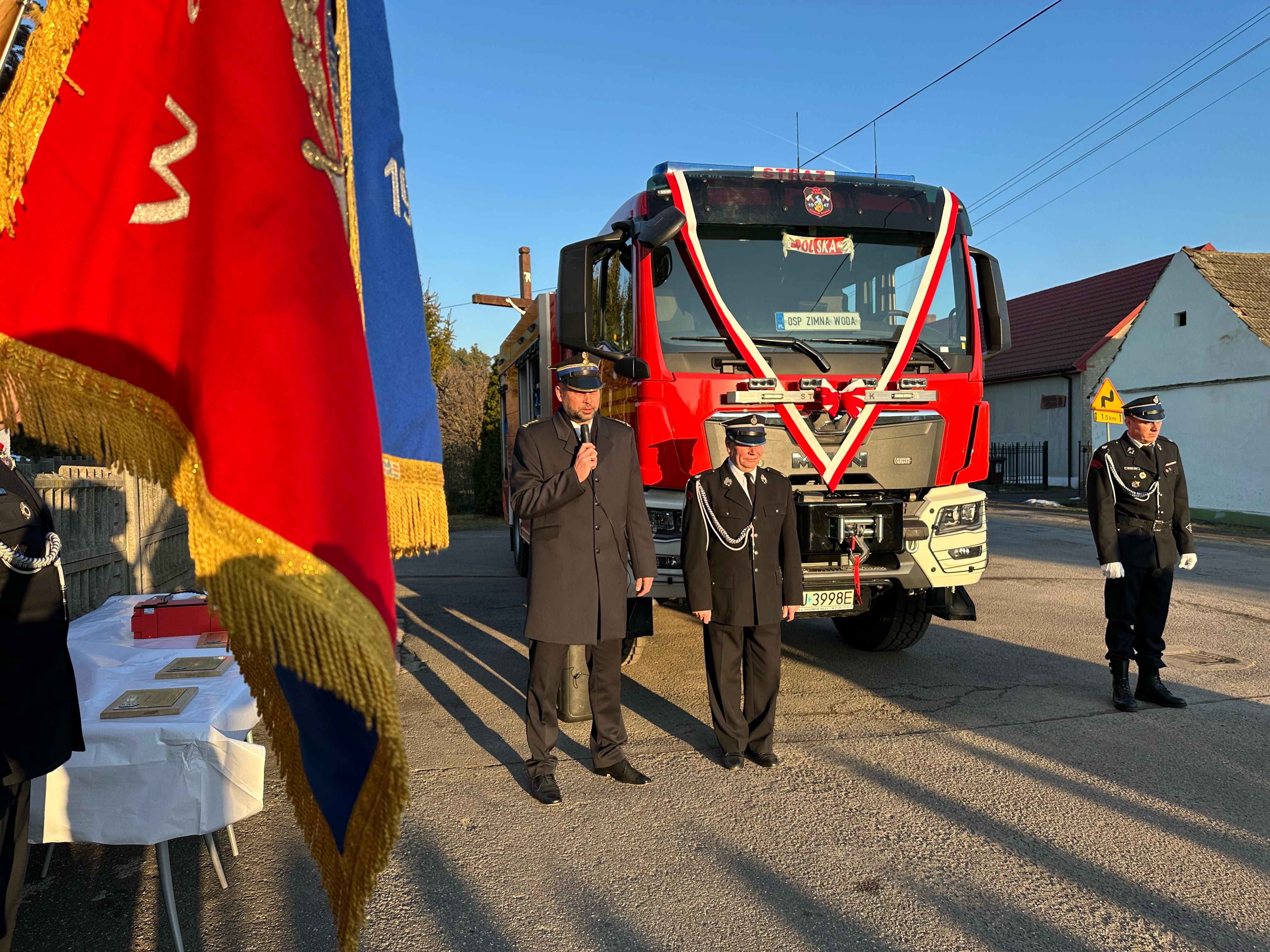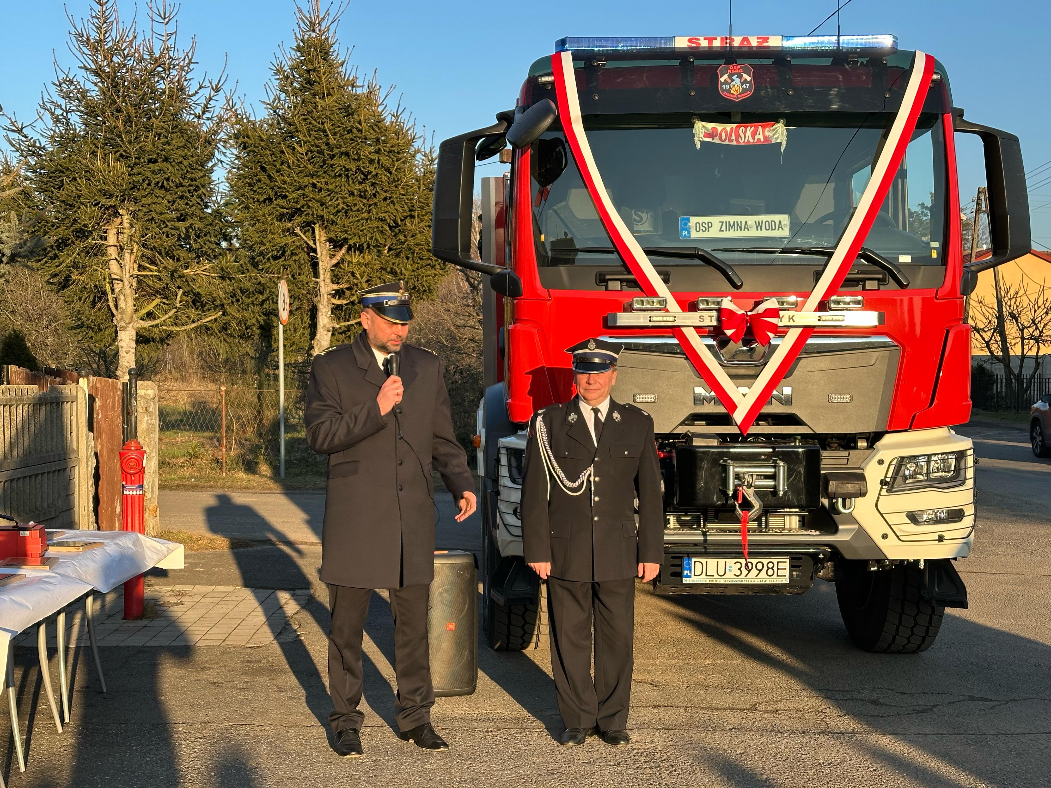 Przekazanie ciężkiego samochodu ratowniczo-gaśniczego GCBA 6/32 marki MAN TGM 18.320 dla Ochotniczej Straży Pożarnej w Zimnej Wodzie. Nowo nabyty pojazd ratowniczo-gaśniczy został zakupiony w ramach ogólnopolskiego programu finansowania służb ratowniczych.