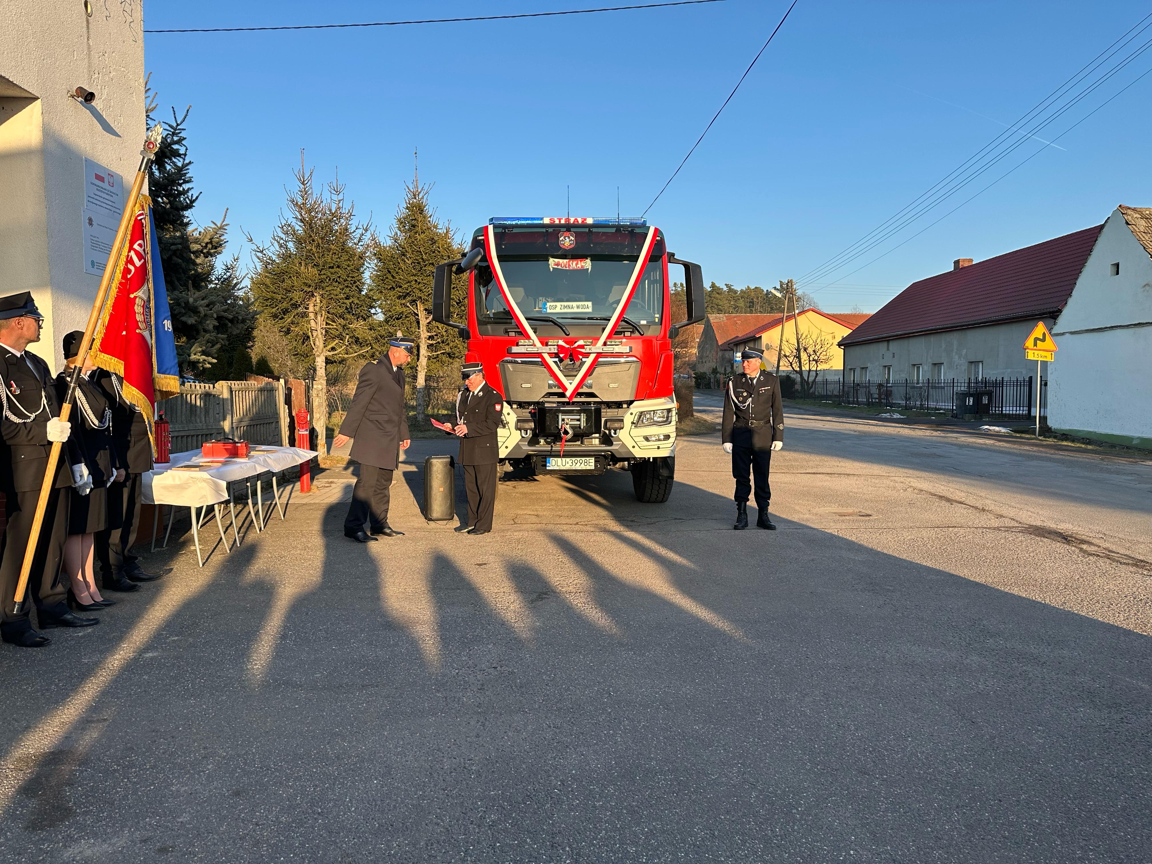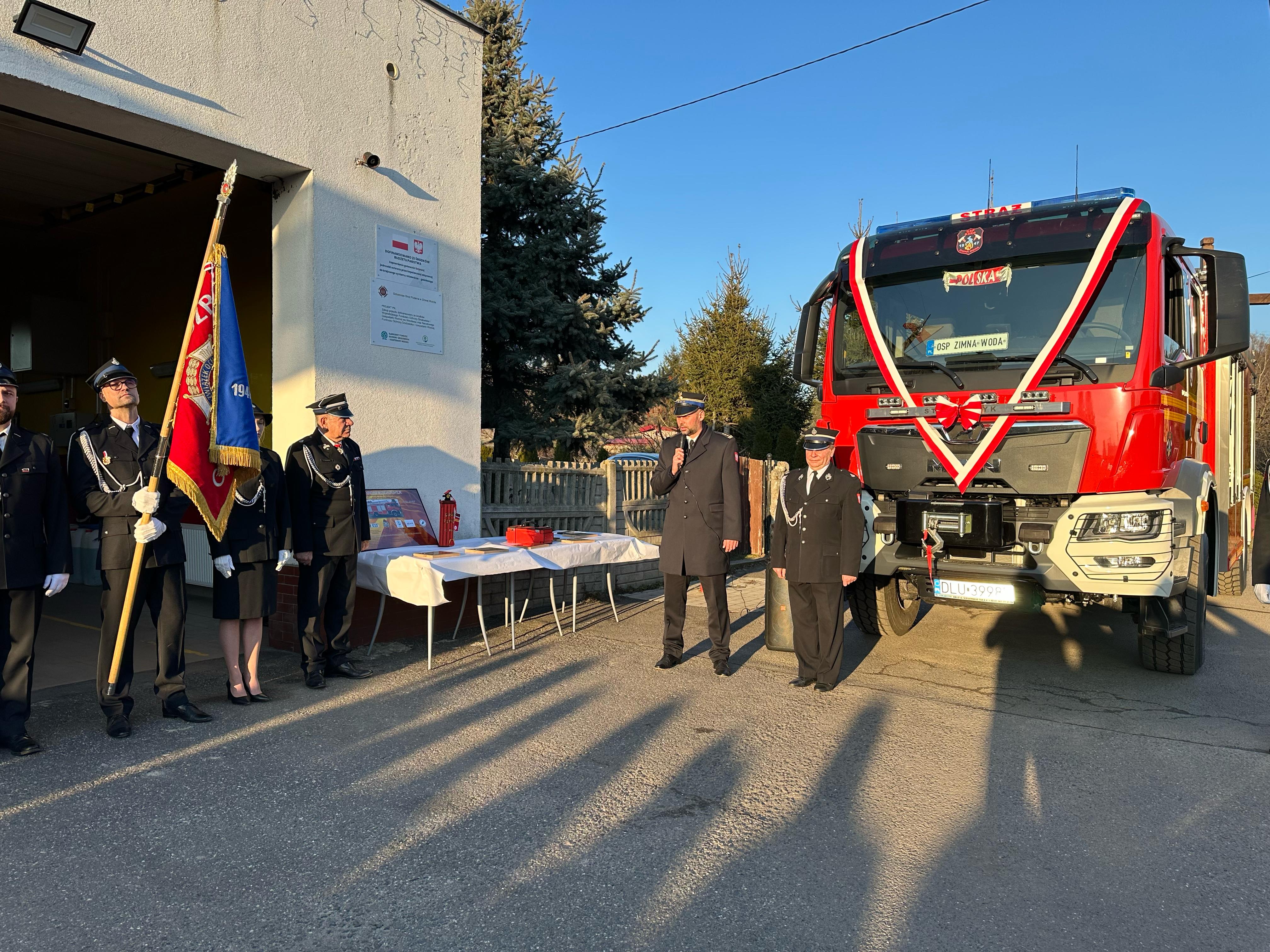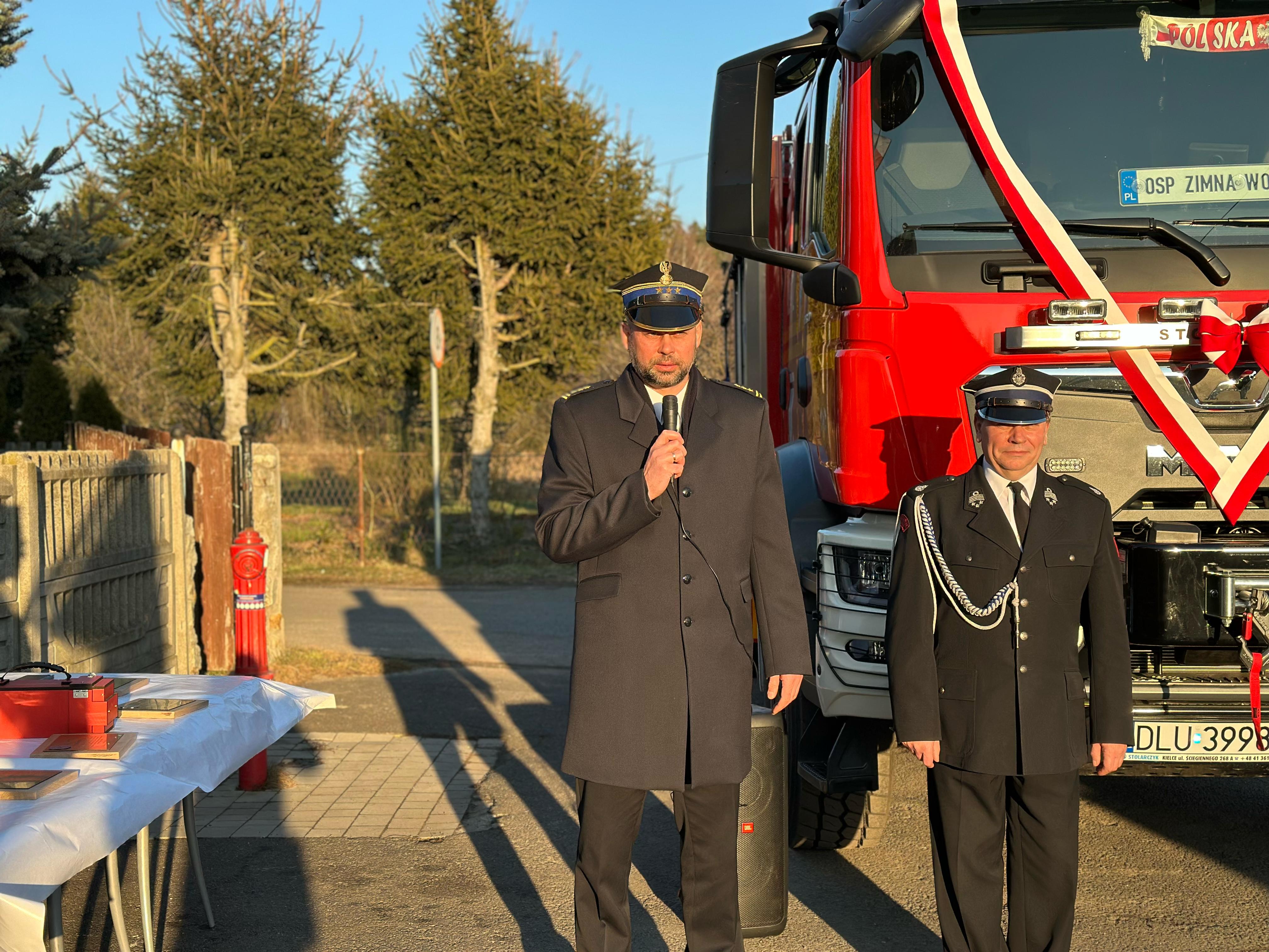 Przekazanie ciężkiego samochodu ratowniczo-gaśniczego GCBA 6/32 marki MAN TGM 18.320 dla Ochotniczej Straży Pożarnej w Zimnej Wodzie. Nowo nabyty pojazd ratowniczo-gaśniczy został zakupiony w ramach ogólnopolskiego programu finansowania służb ratowniczych.