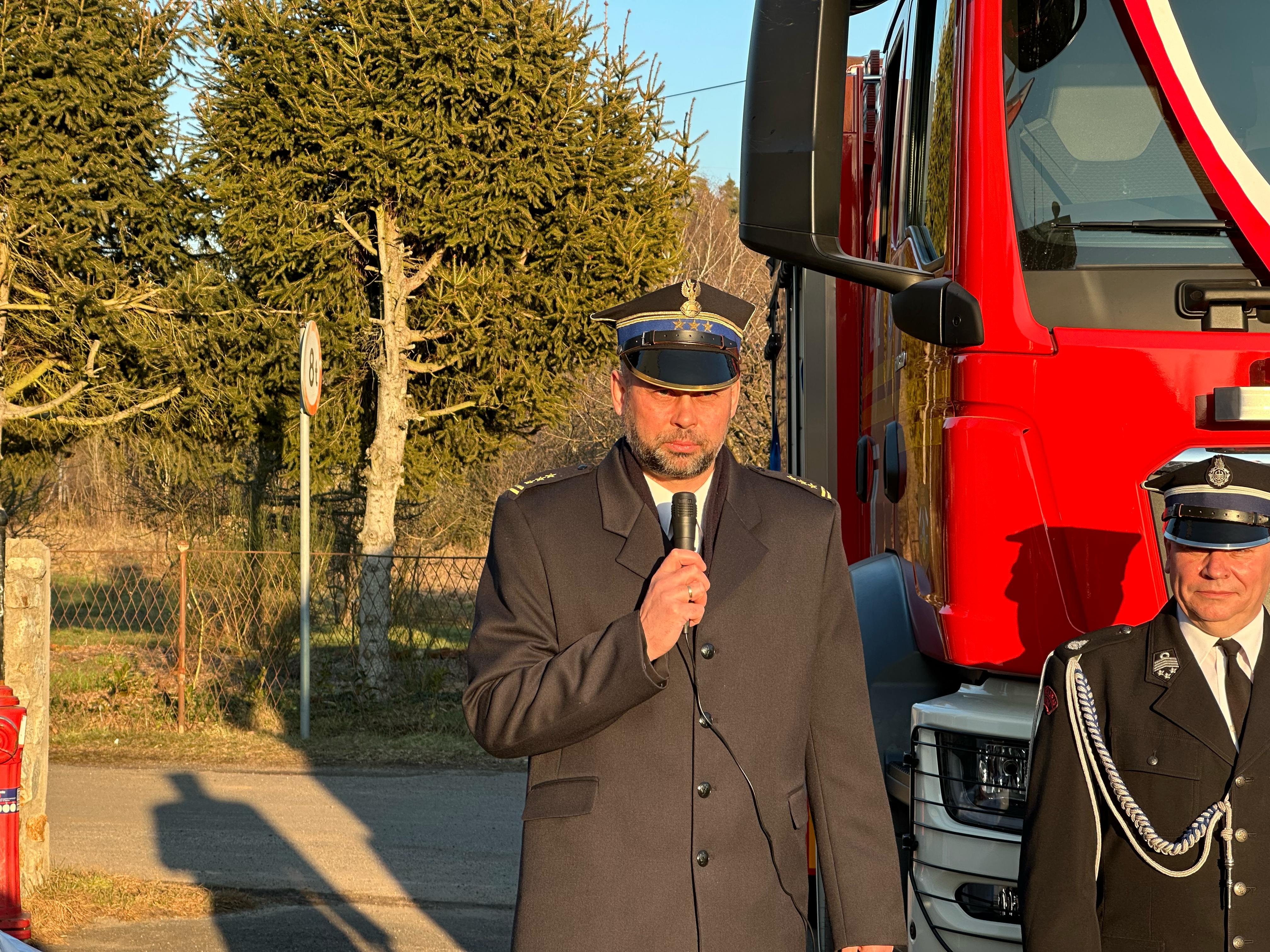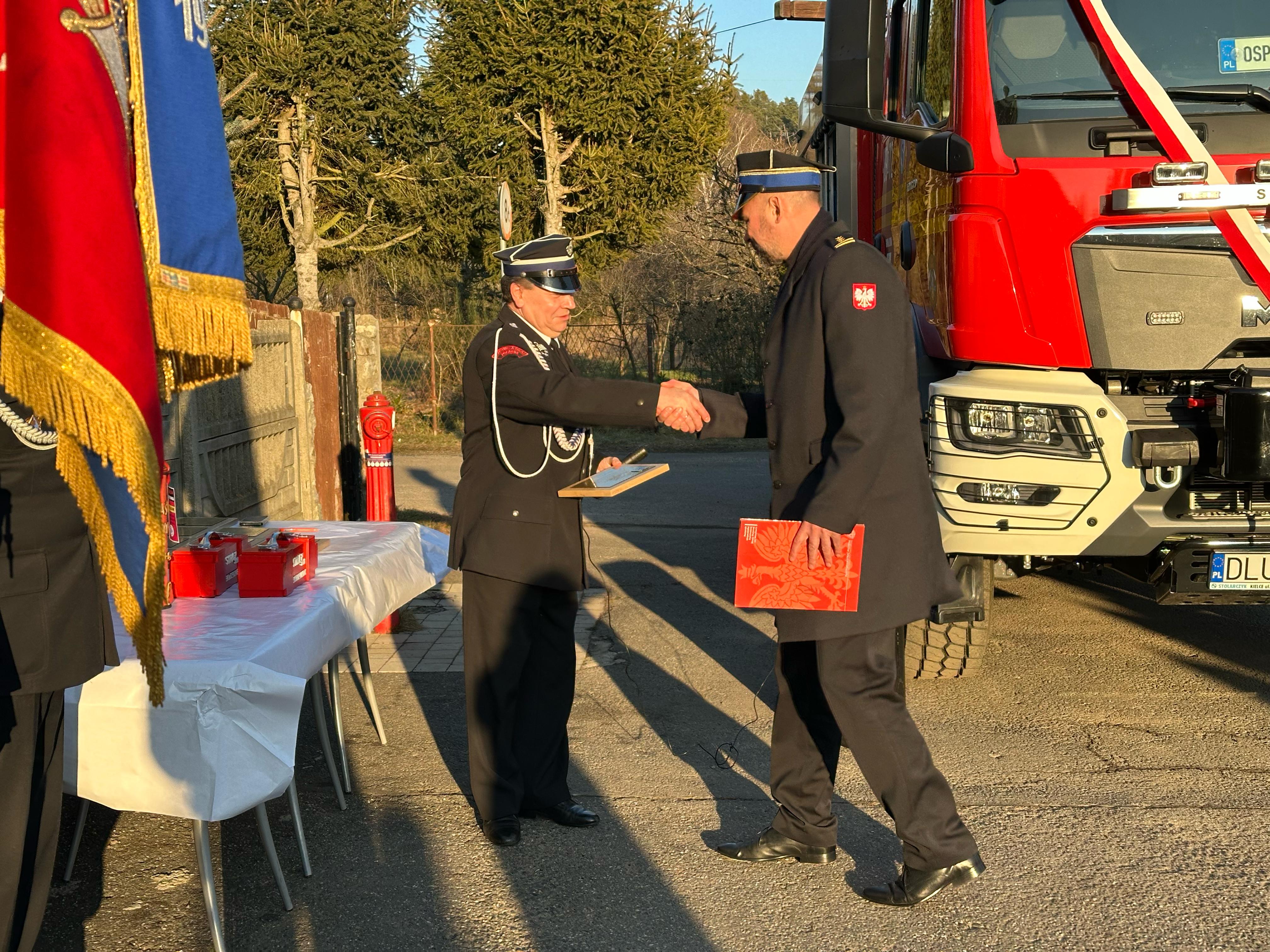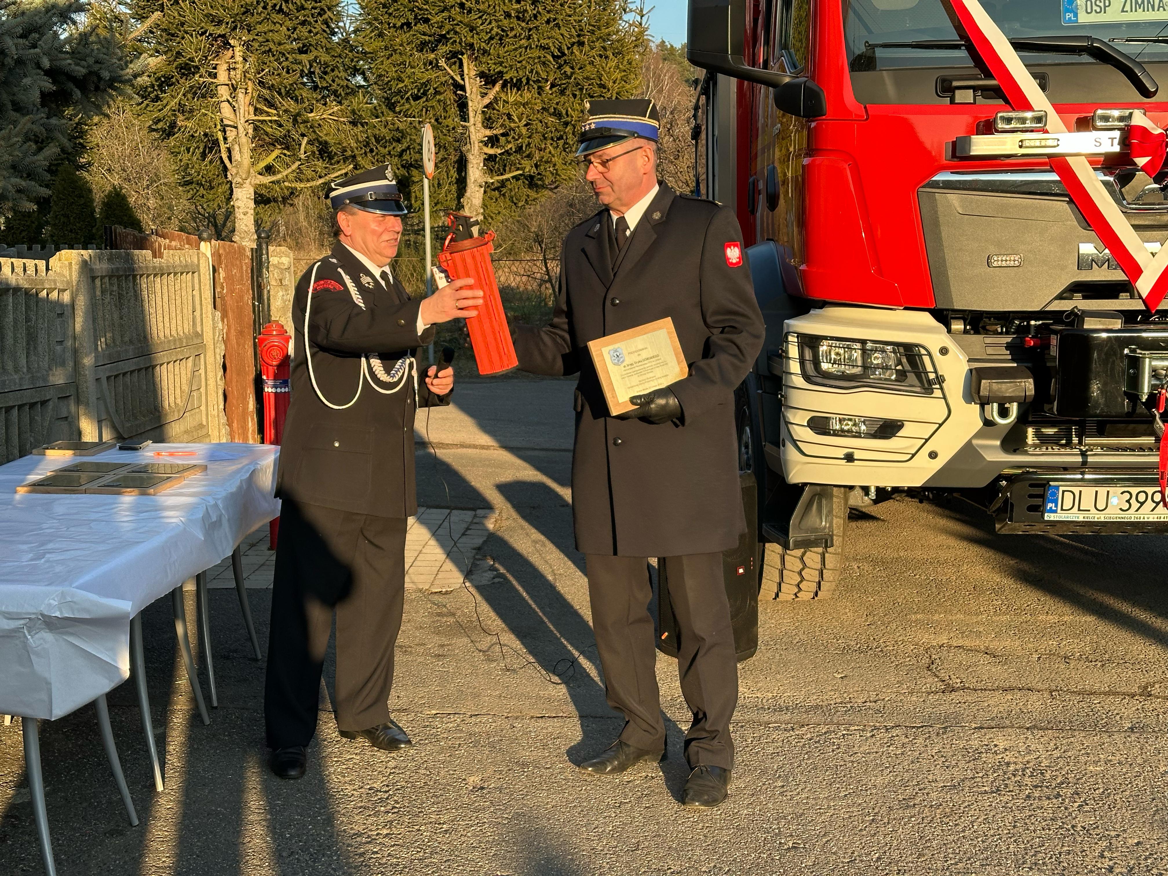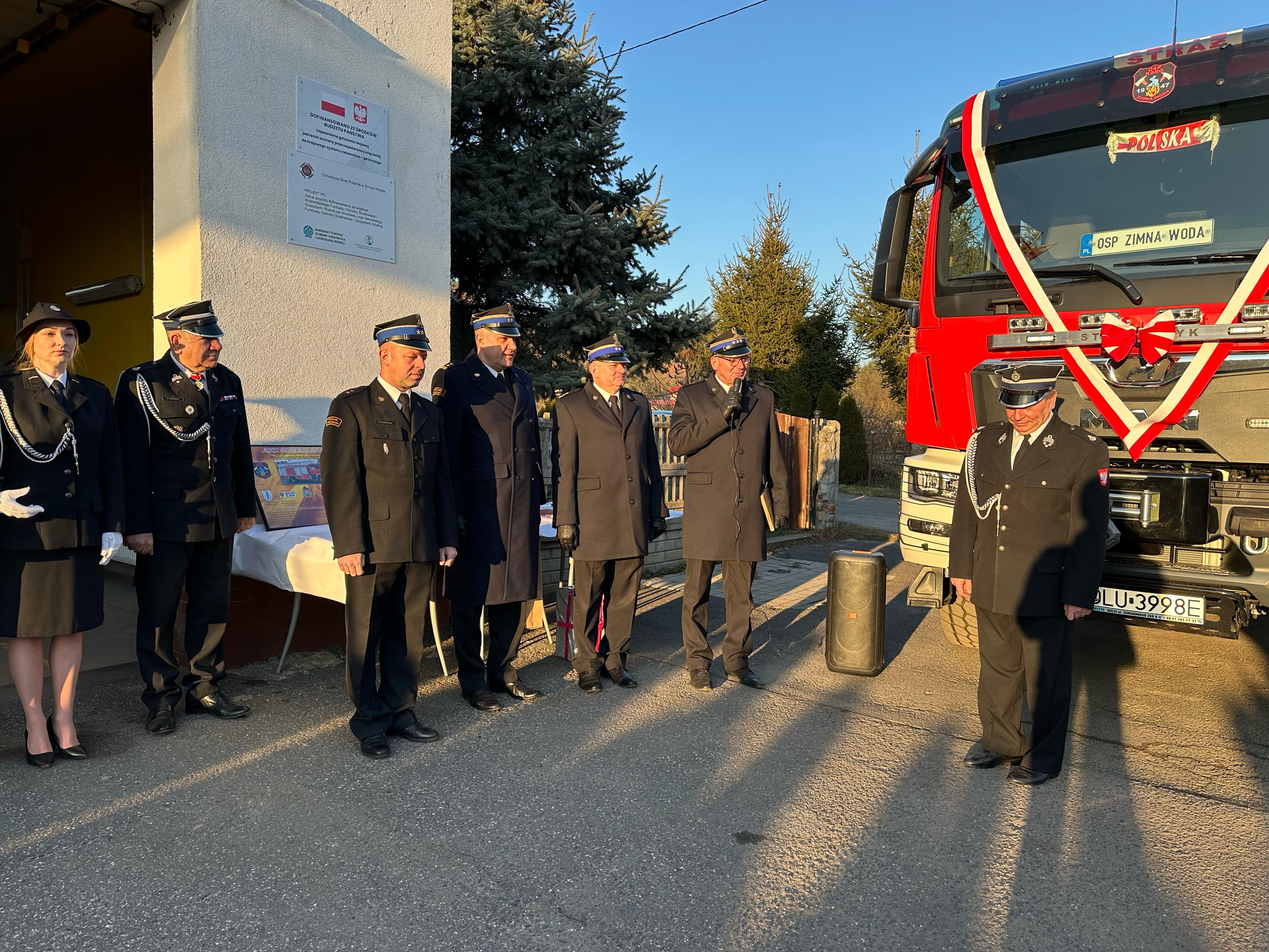 Przekazanie ciężkiego samochodu ratowniczo-gaśniczego GCBA 6/32 marki MAN TGM 18.320 dla Ochotniczej Straży Pożarnej w Zimnej Wodzie. Nowo nabyty pojazd ratowniczo-gaśniczy został zakupiony w ramach ogólnopolskiego programu finansowania służb ratowniczych.