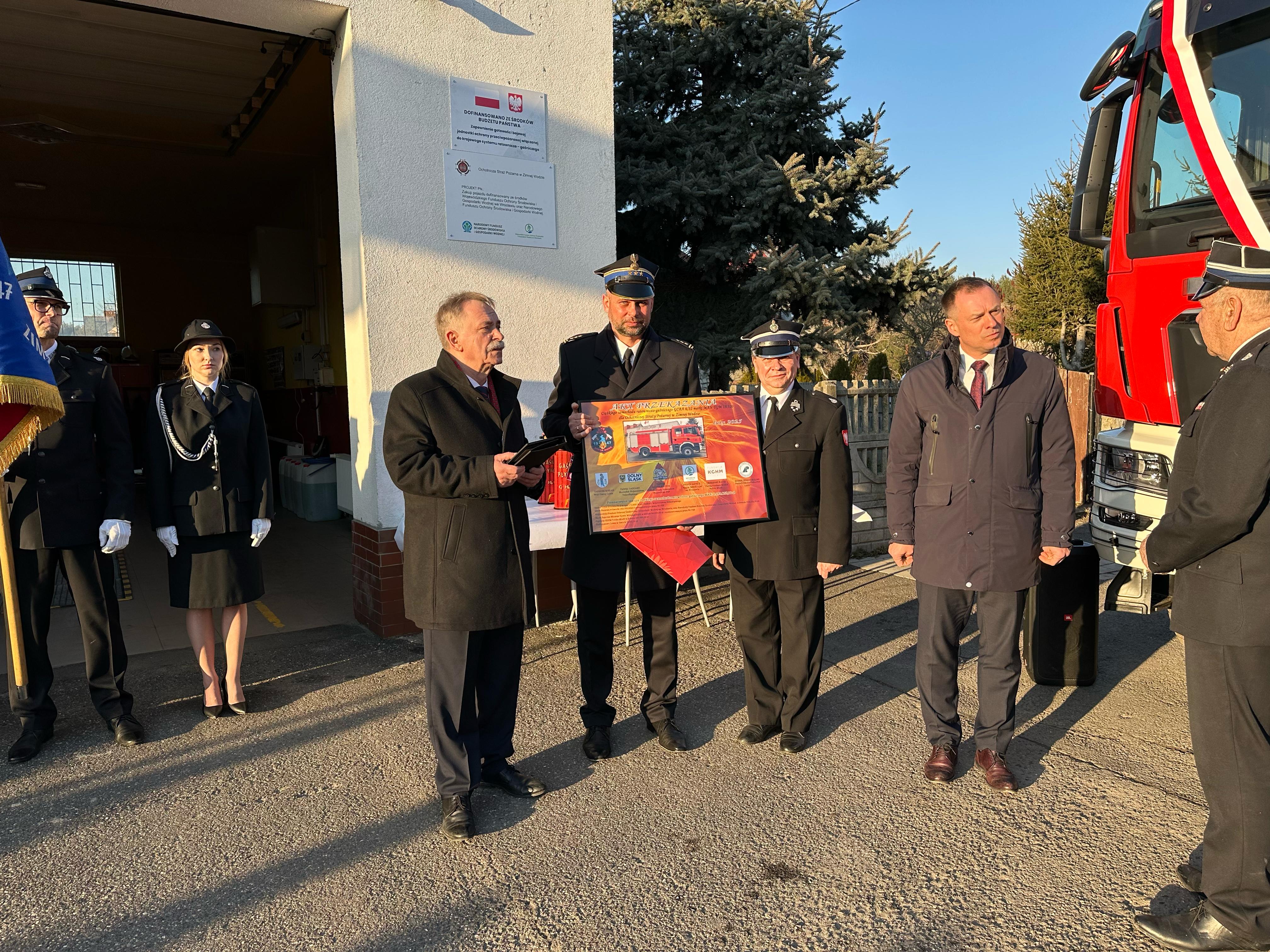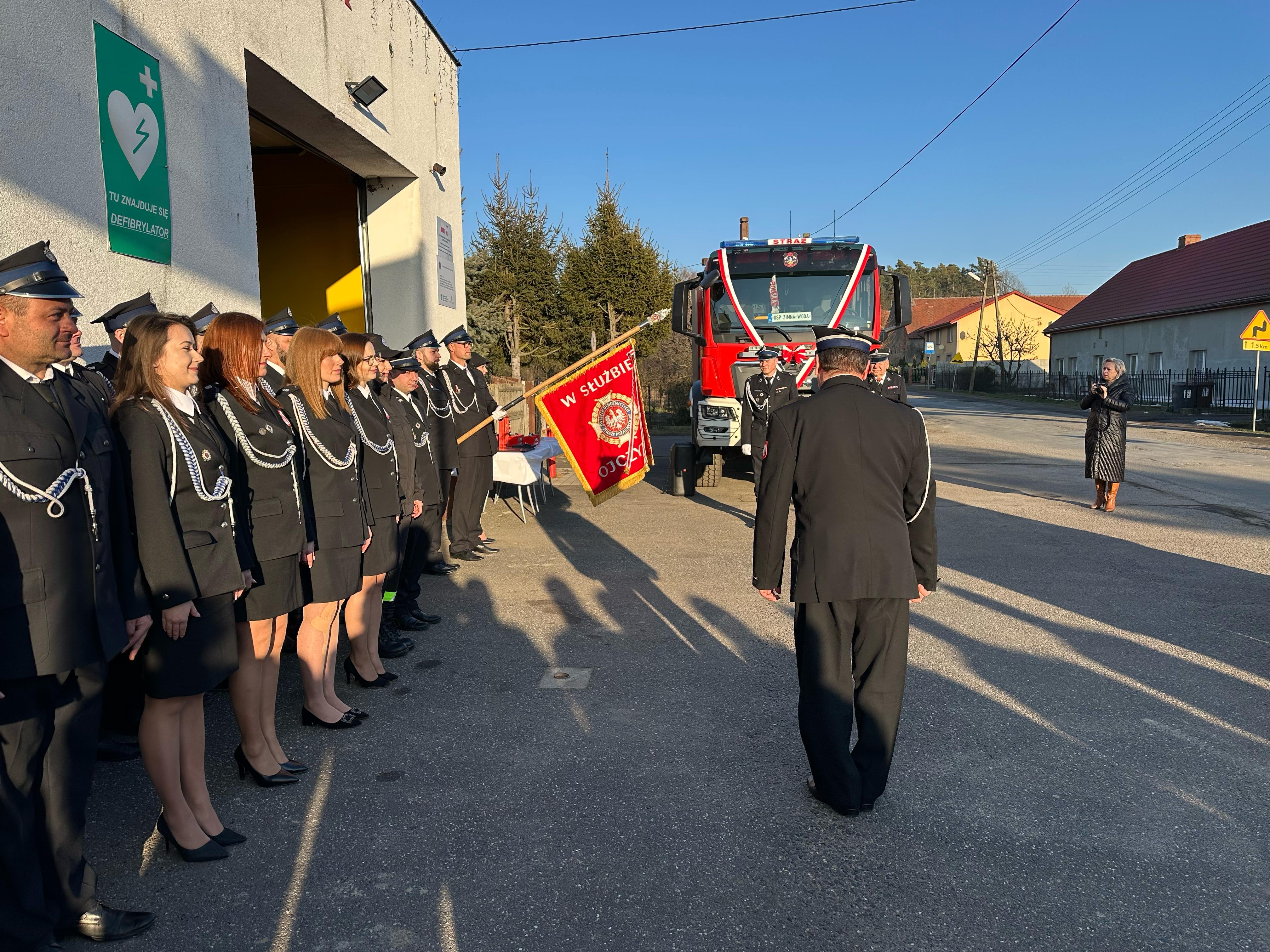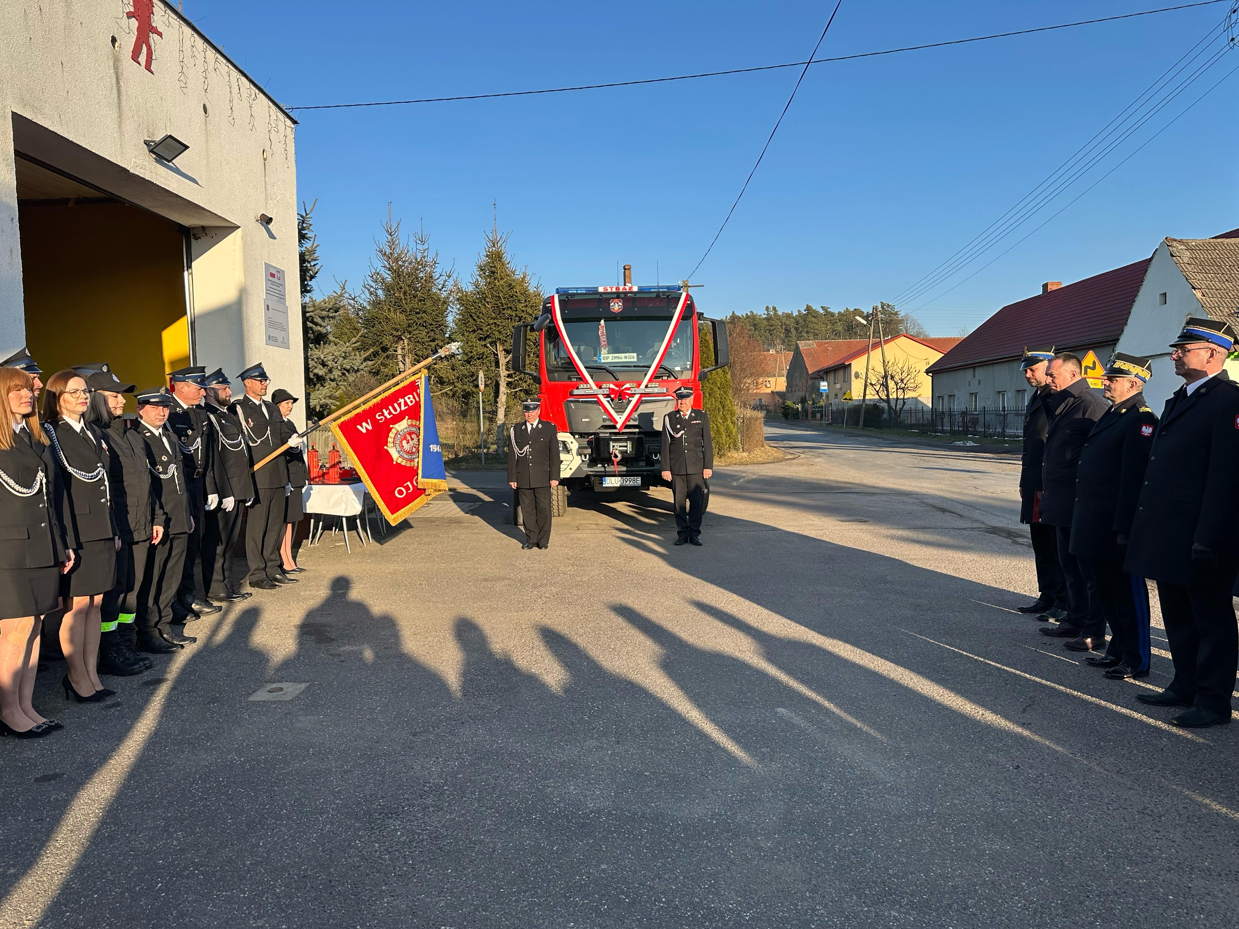Uroczystość przekazania ciężkiego samochodu ratowniczo-gaśniczego GCBA 6/32 marki MAN TGM 18.320 dla Ochotniczej Straży Pożarnej w Zimnej Wodzie.