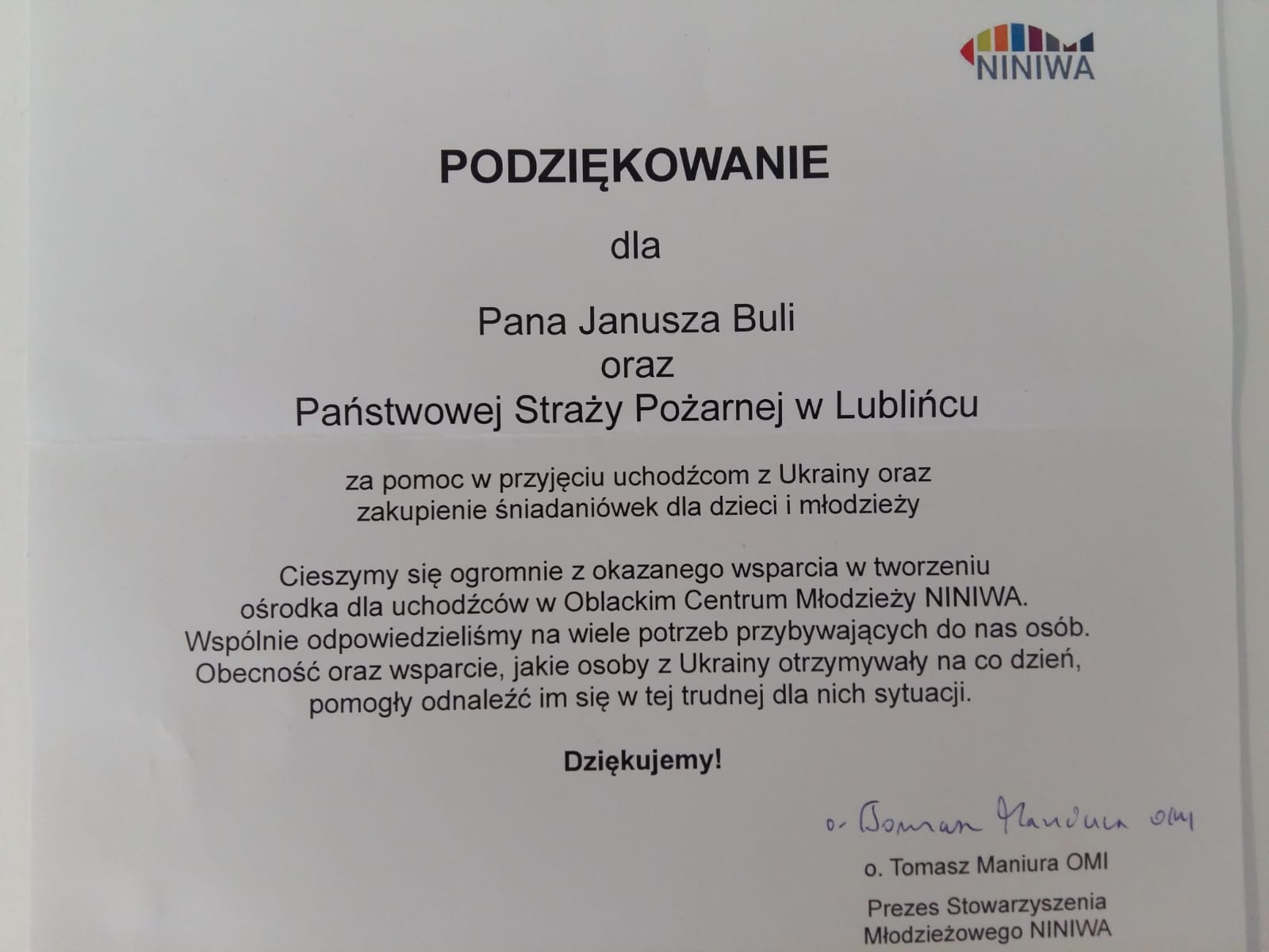 Lublinieccy strażacy otrzymują liczne podziękowania za serce włożone podczas niesienia pomocy uchodźcom z Ukrainy. Oprócz pomocy w przewożeniu uchodźców busami w strefie przygranicznej czy na terenie województwa śląskiego z punktów recepcyjnych do miejsc zakwaterowania, gdzie znaleźli tymczasową pomoc i opiekę, dzieci które przebywały w Oblackim Centrum Młodzieży NINIWA odwiedziły naszą jednostkę, gdzie z ciekawością wysłuchały prelekcji na temat bezpieczeństwa w gospodarstwie domowym, lesie i nad wodą na sali edukacyjnej „Ognik”.