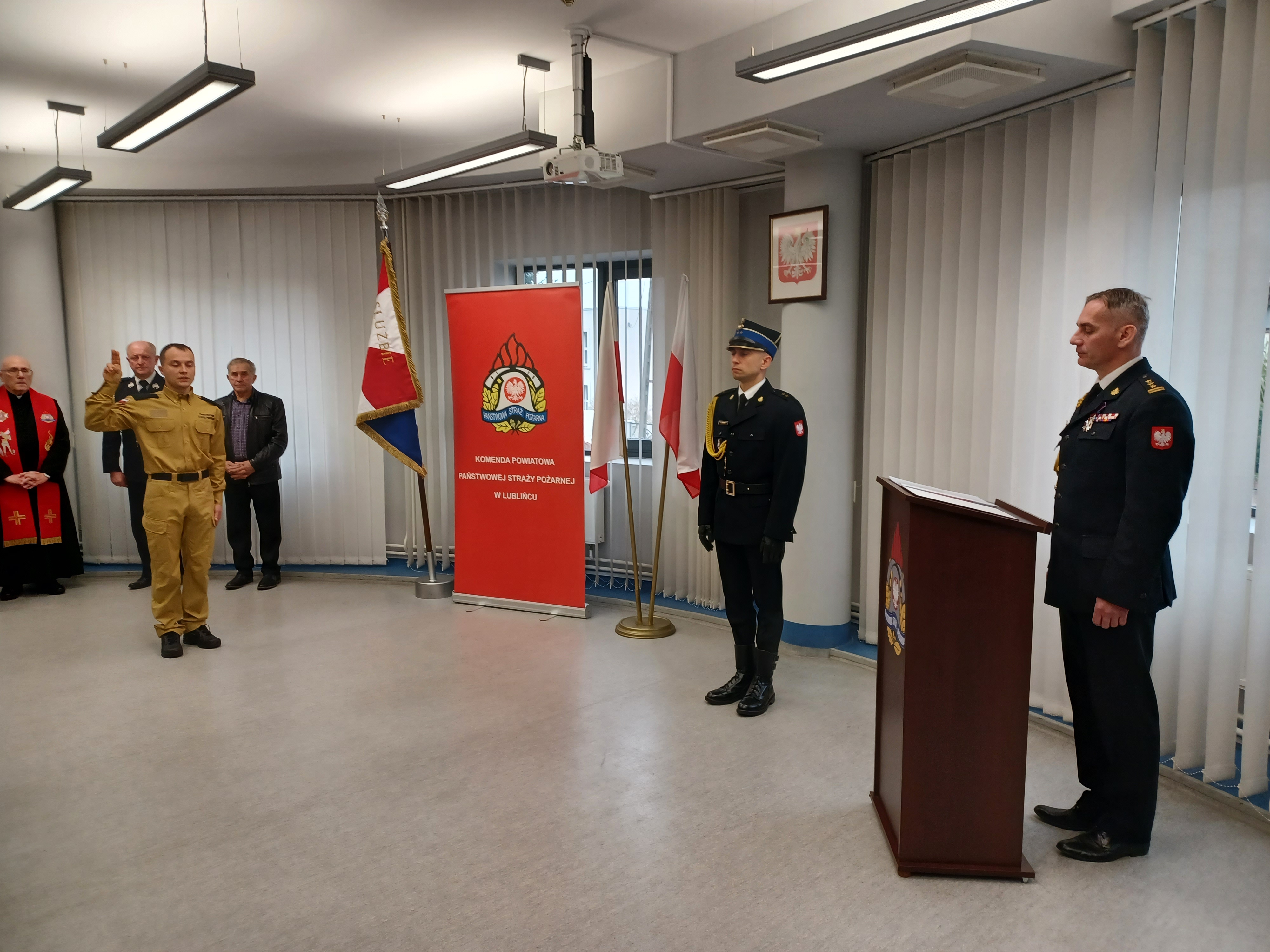 Po rozdaniu awansów nastąpiło uroczyste ślubowanie strażaka przyjętego do służby - jedno z najważniejszych wydarzeń w karierze każdego strażaka Państwowej Straży Pożarnej.