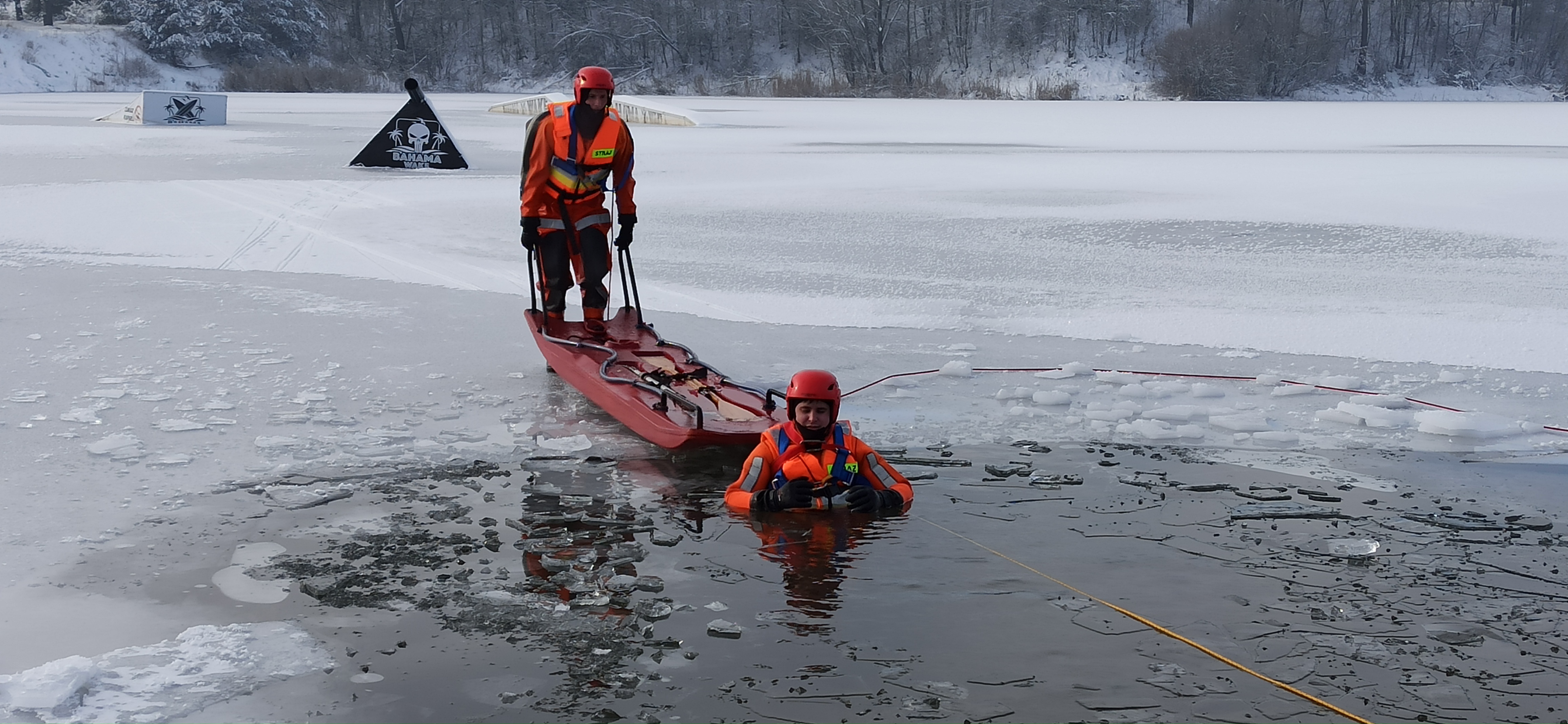 · ewakuacja sań lodowych z ratownikami z miejsca zagrożonego załamaniem się lodu.