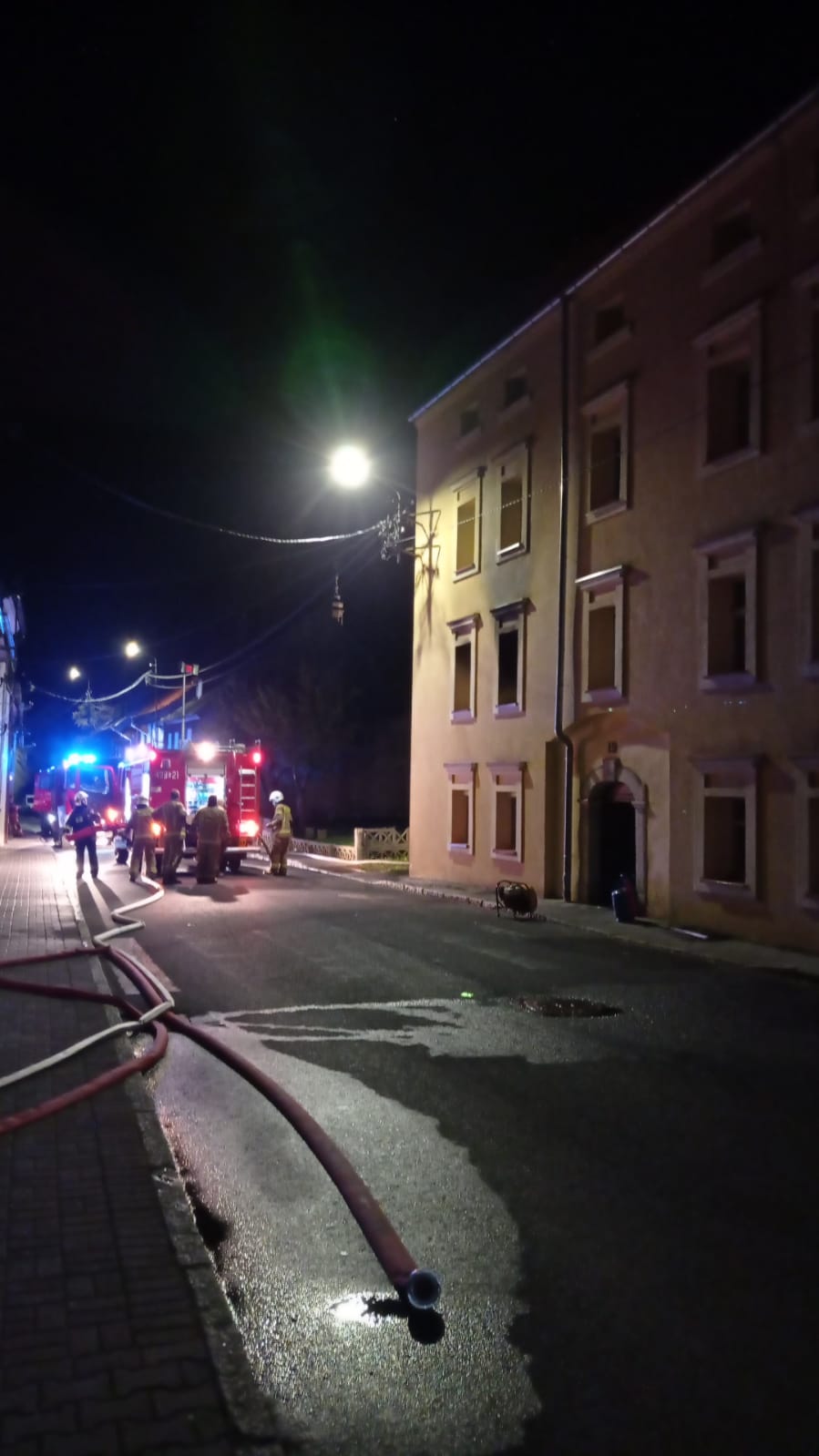 W dniu 06 października 2022 roku o godz. 00:20 na Stanowisko Kierowania Komendanta Powiatowego w Lwówku Śląskim wpłynęło zgłoszenie o pożarze budynku wielorodzinnego w Mirsku. Pożar zauważył przejeżdżający ulicą patrol Policji. Policjanci natychmiast zaalarmowali straż i pogotowie następnie przystąpili do ewakuacji mieszkańców. Przed przybyciem jednostek ochrony przeciwpożarowej udało się ewakuować 10 mieszkańców, kolejnych 4 mieszkańców zostało uwięzionych w mieszkaniach na I i II piętrze. Strażacy ewakuowali 2 osoby z I piętra przy pomocy drabiny przystawnej, kolejne dwie osoby na II piętrze przy pomocy podnośnika hydraulicznego następnie przystąpili do działań gaśniczych. W akcji udział brały trzy zastępy strażaków z JRG PSP w Lwówku Śląskim, plus oficer operacyjny, zastęp z autodrabiną z JRG PSP w Jeleniej Górze, dwa zastępy OSP Mirsk, zastęp OSP Rębiszów i zastęp OSP Krobica – Orłowice. W działaniach uczestniczyło też 5 zespołów ratownictwa medycznego.