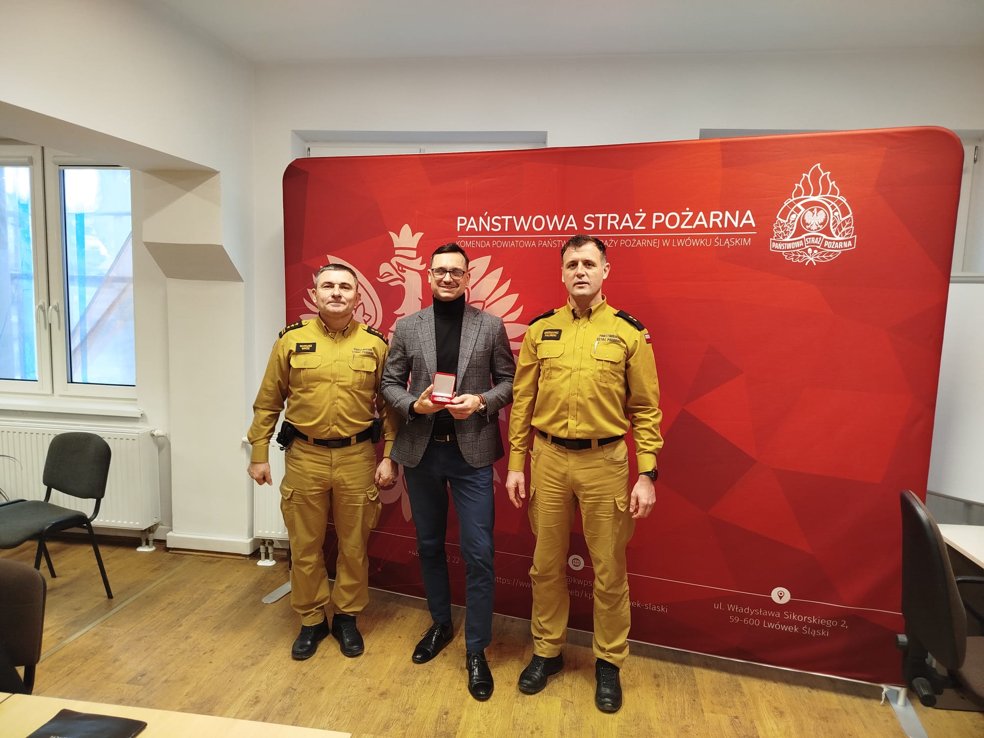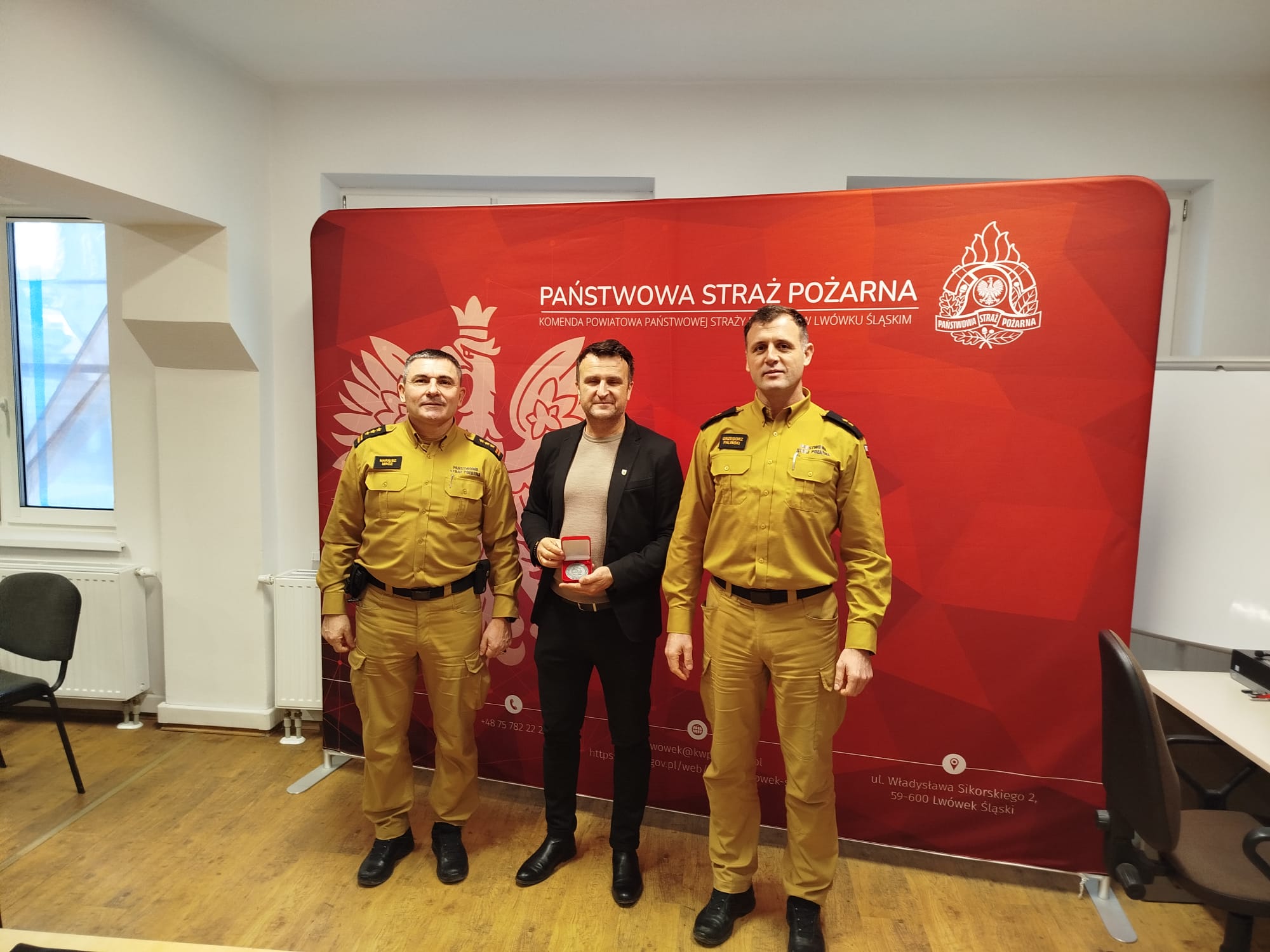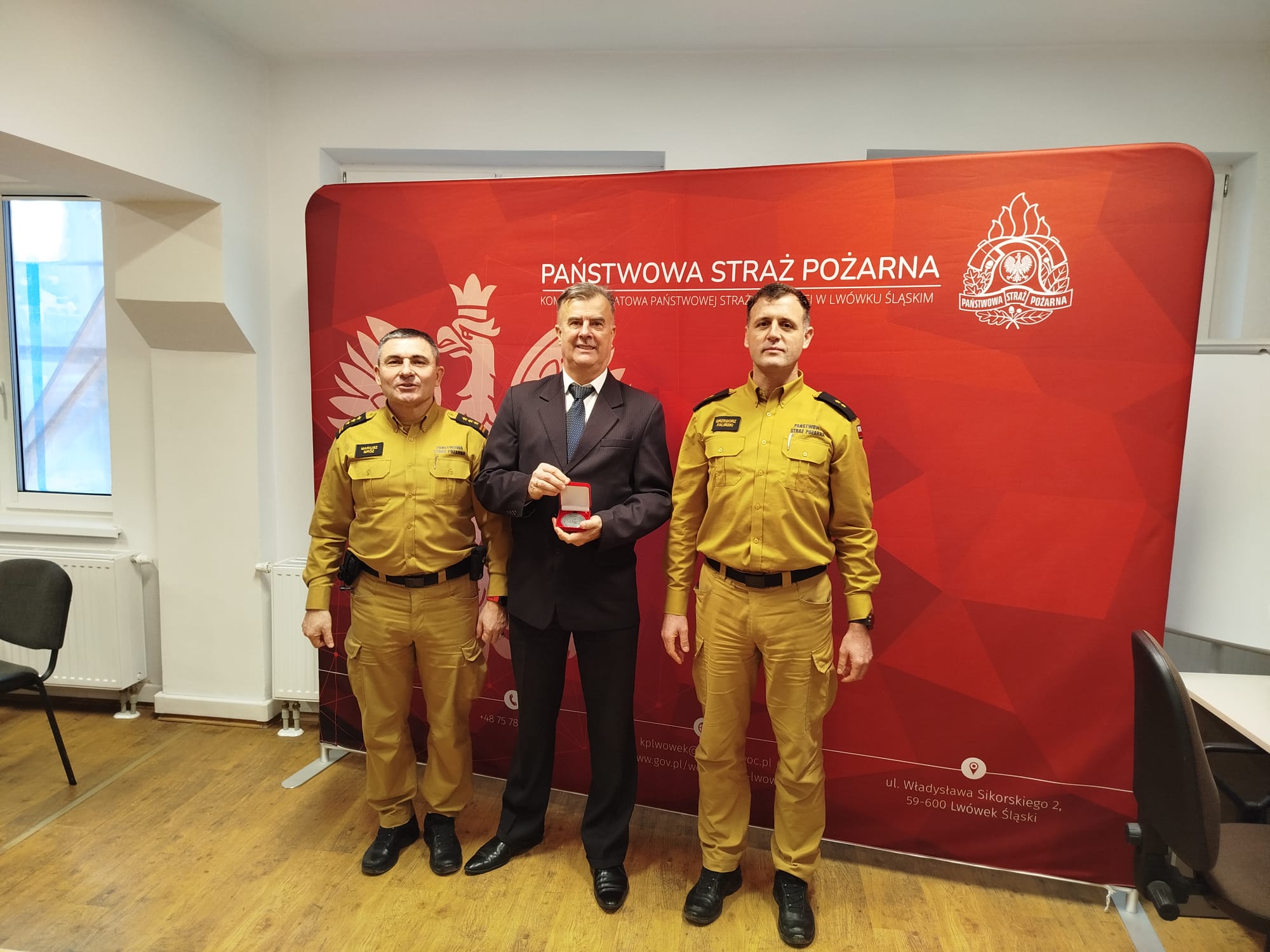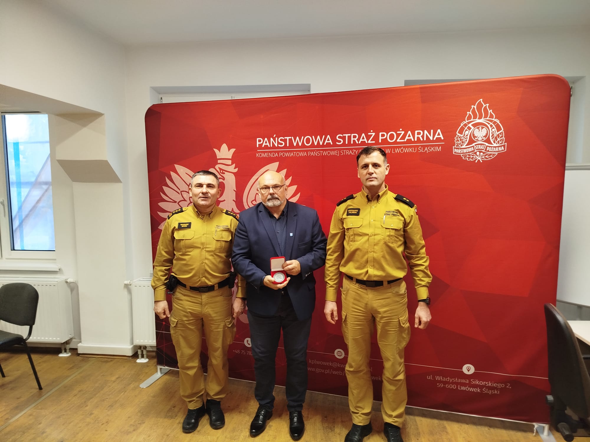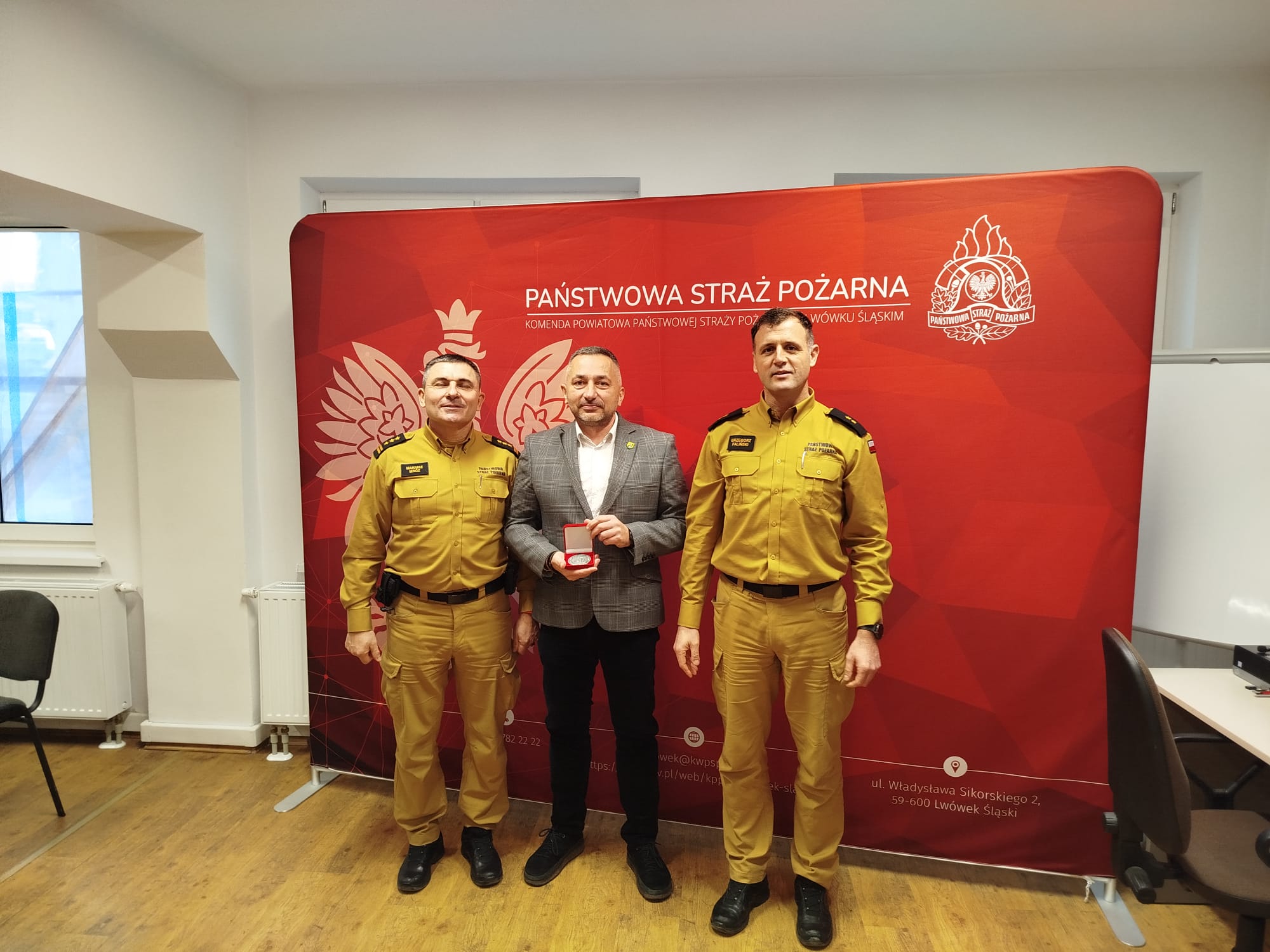 w Lwówku Śląskim, wręczył samorządowcom powiatu lwóweckiego medale z okazji 30-lecia funkcjonowania Krajowego Systemu Ratowniczo-Gaśniczego.