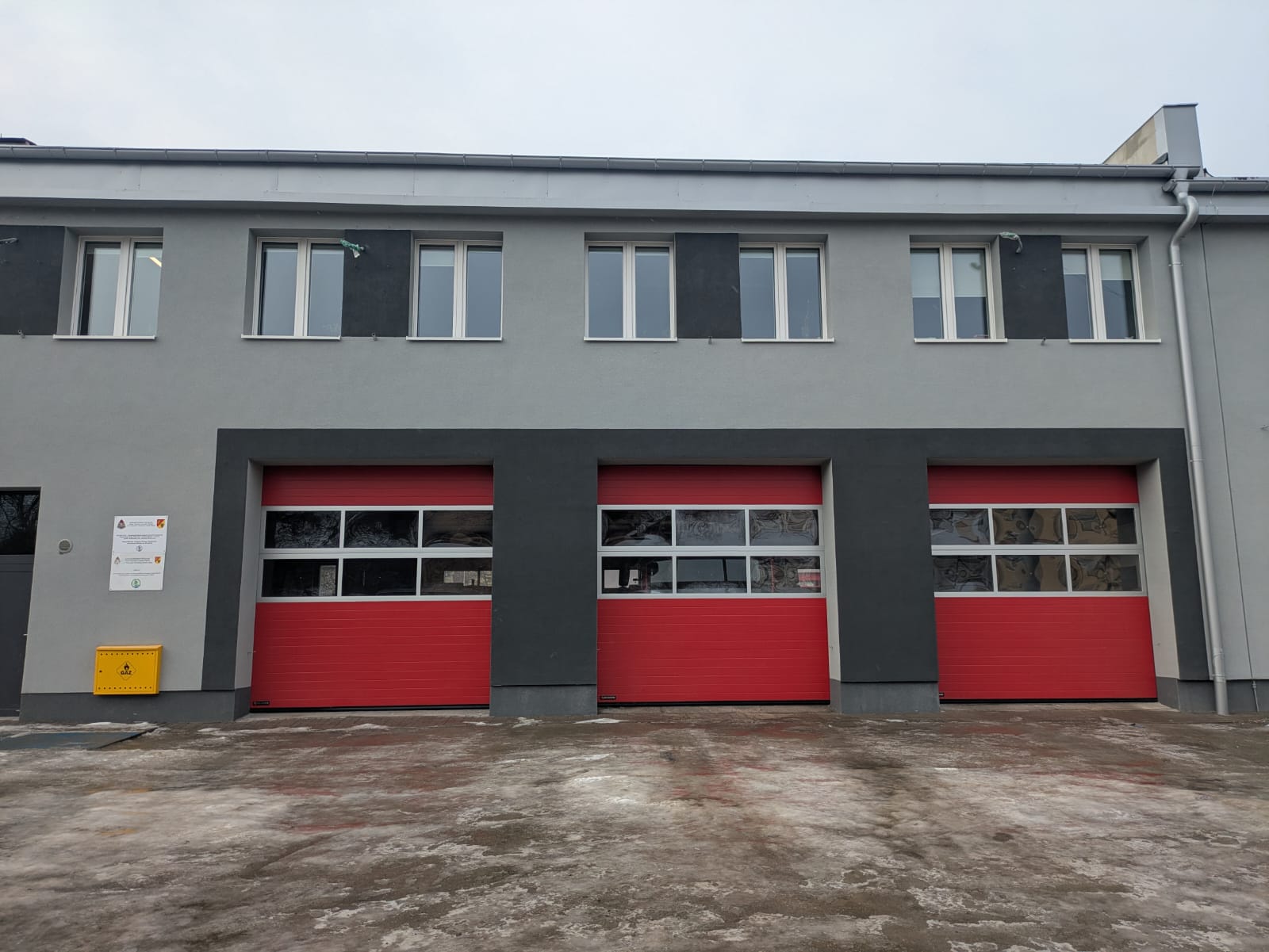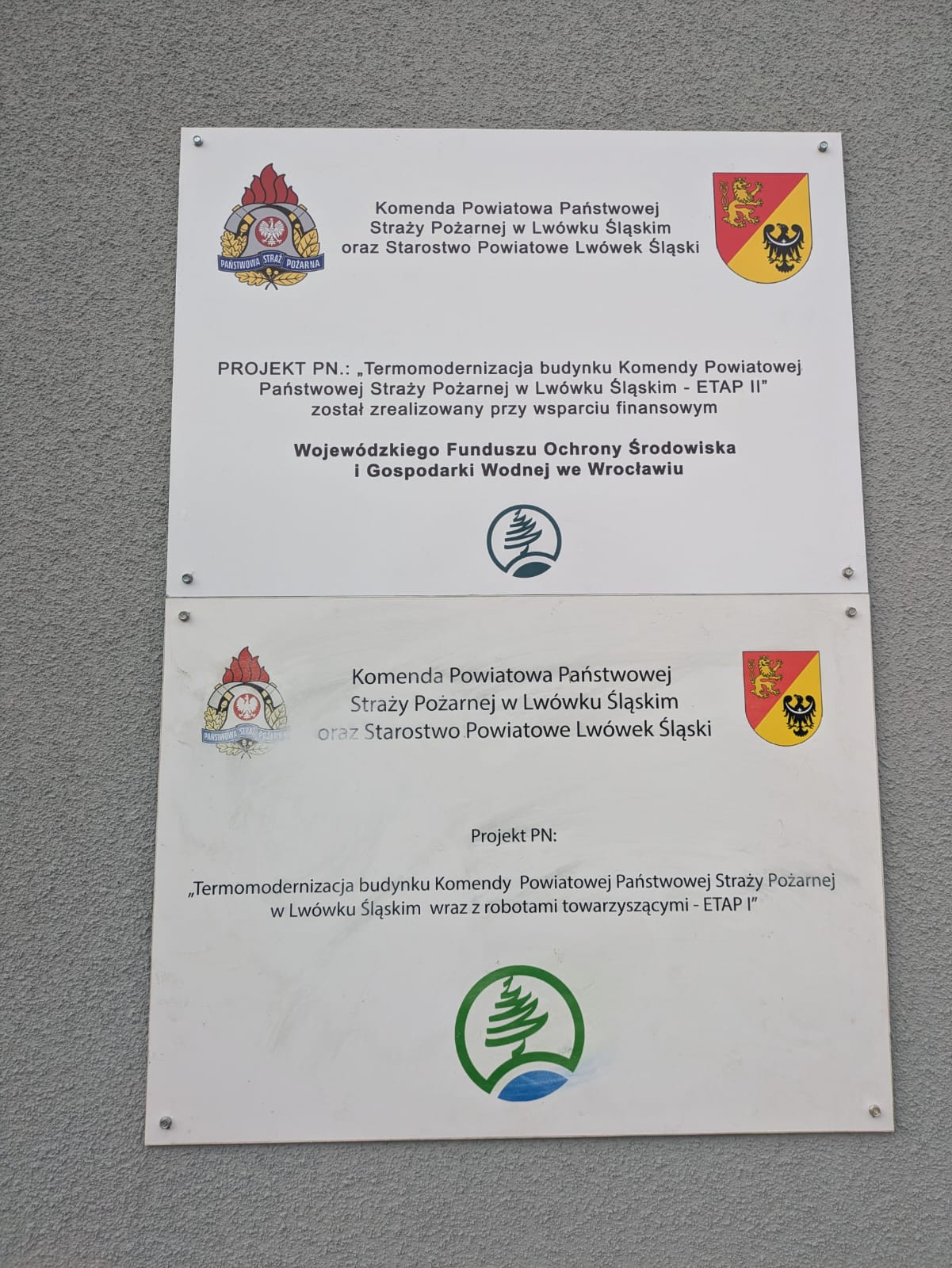 Termomodernizacja budynku Komendy Powiatowej Państwowej Straży Pożarnej w Lwówku Śląskim - ETAP II - inwestycja została zrealizowana przy współfinansowaniu Wojewódzkiego Funduszu Ochrony Środowiska i Gospodarki Wodnej we Wrocławiu, budżetu państwa, samorządów z terenu Powiatu Lwóweckiego (Powiat Lwówecki, Gmina Lwówek Śląski, Gmina Mirsk, Gmina Lubomierz, Gmina Wleń, Gmina Gryfów Śląski) oraz Komendy Głównej Państwowej Straży Pożarnej. Przedsięwzięcie obejmowało kompleksowe działania modernizacyjne, polegające na dociepleniu ścian zewnętrznych, wymianie opraw oświetleniowych na energooszczędne, dociepleniu stropodachu oraz wymianie stolarki zewnętrznej. Celem prowadzonych prac była poprawa efektywności energetycznej obiektu, obniżenie kosztów eksploatacji oraz ograniczenie negatywnego wpływu na środowisko. Realizacja zadania przyczyniła się do podniesienia standardu technicznego budynku oraz poprawy komfortu i bezpieczeństwa jego użytkowników.