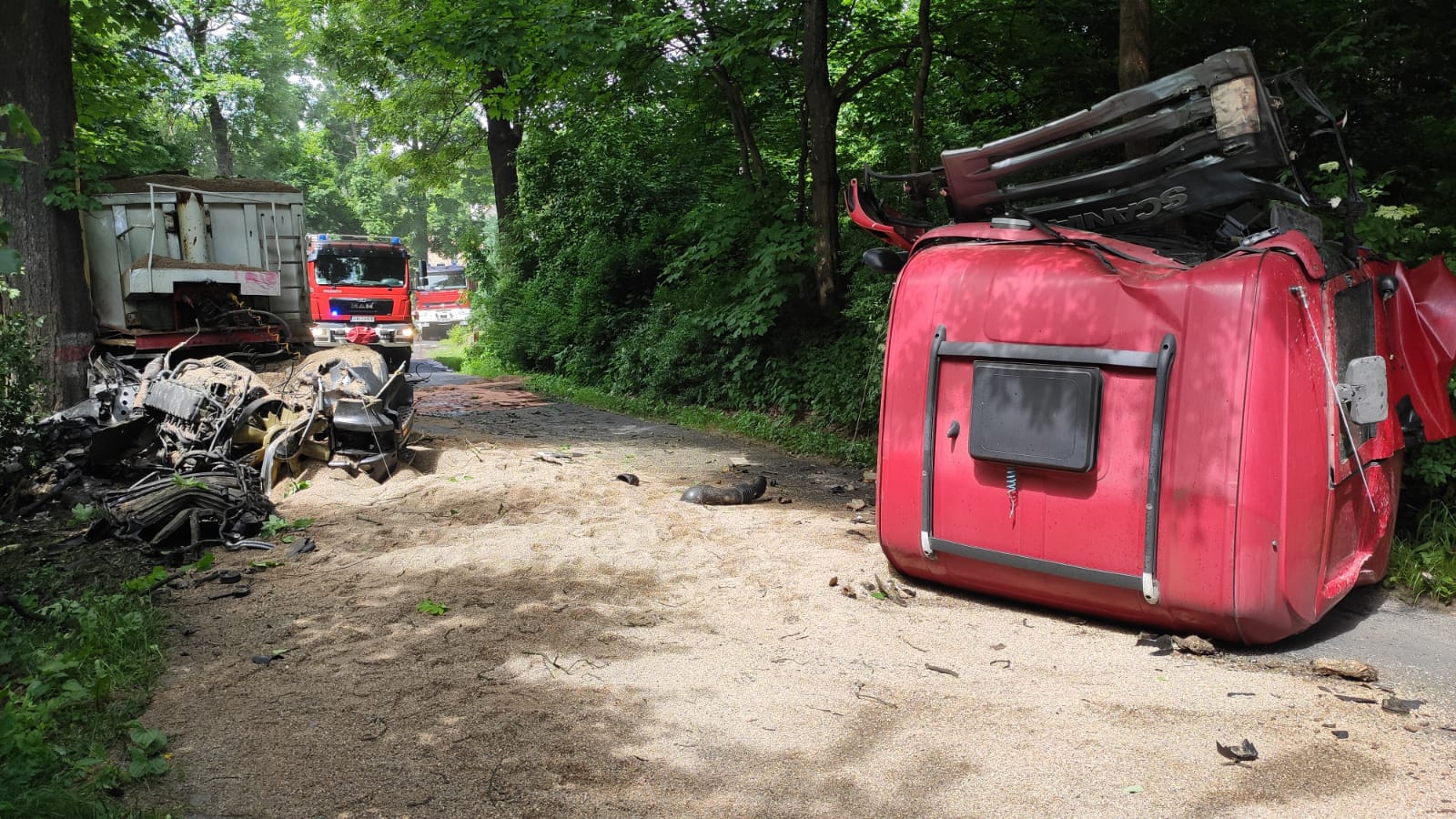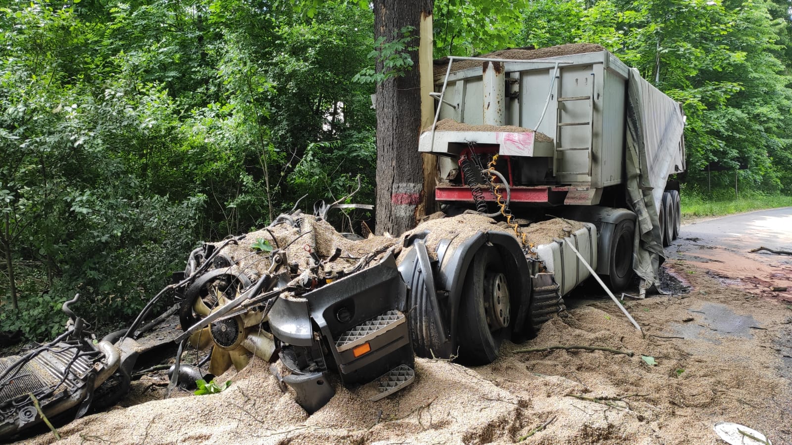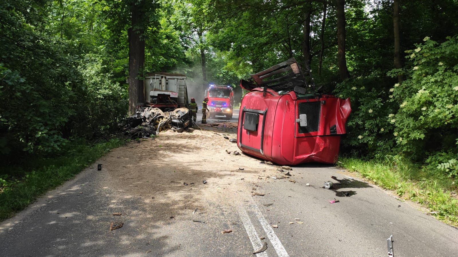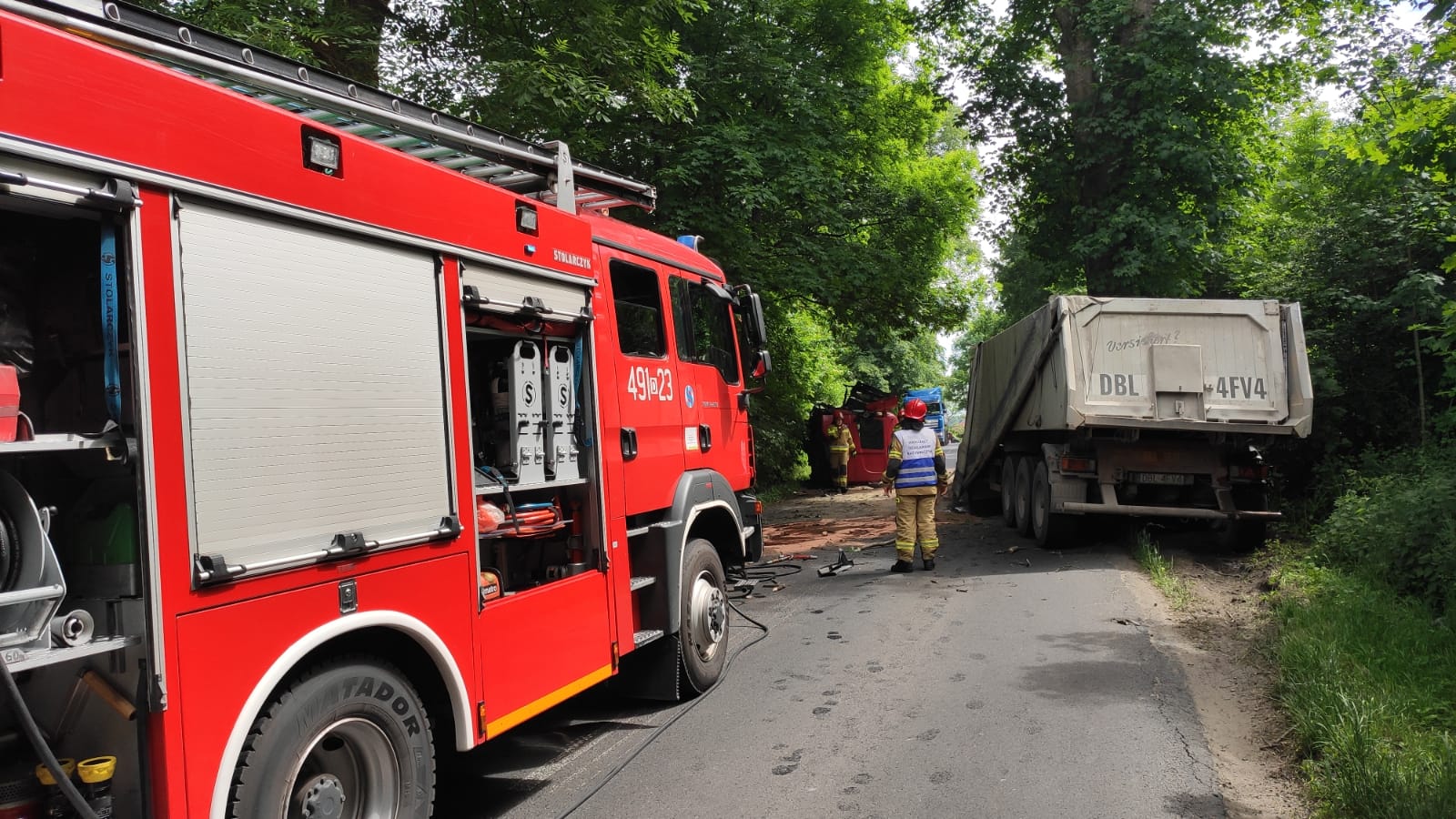 Po przybyciu na miejsce zdarzenia i przeprowadzonym rozpoznaniu okazało się, że samochód uderzył w przydrożne drzewo. Uderzenie było tak silne, że została wyrwana kabina, która znajdowała się kilka metrów przed pojazdem. W wyniku zdarzenia została poszkodowana jedna osoba (kierowca ciężarówki), która została zabrana do szpitala przez Zespół Ratownictwa Medycznego.