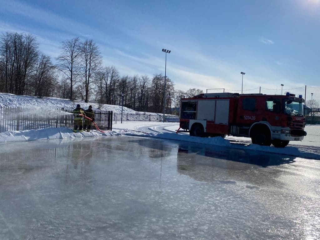 Komenda Powiatowa Państwowej Straży Pożarnej w Makowie Mazowieckim razem OSP Różan pomogła w utworzeniu bezpiecznego lodowiska na terenie boiska sportowego w Różanie.