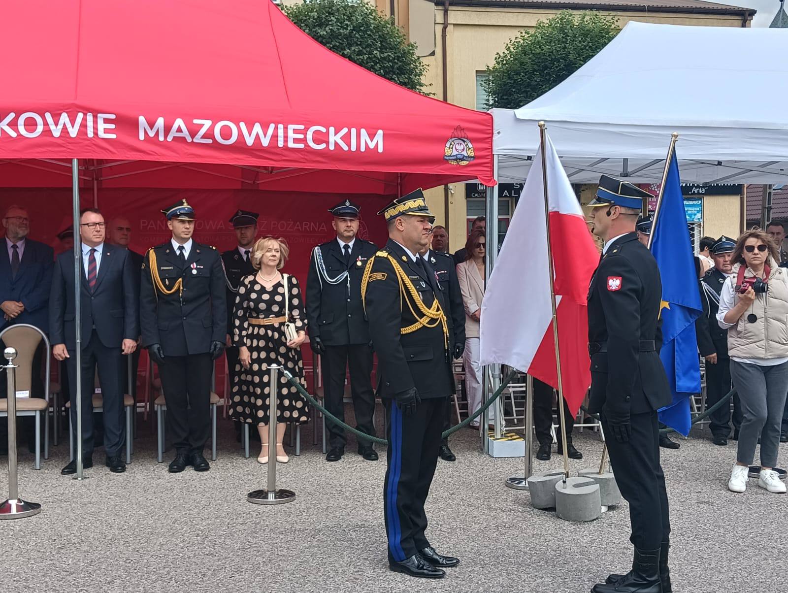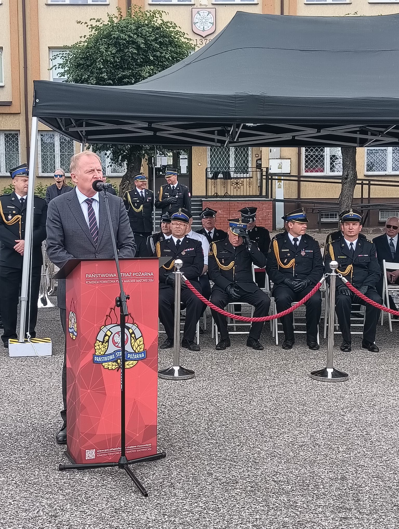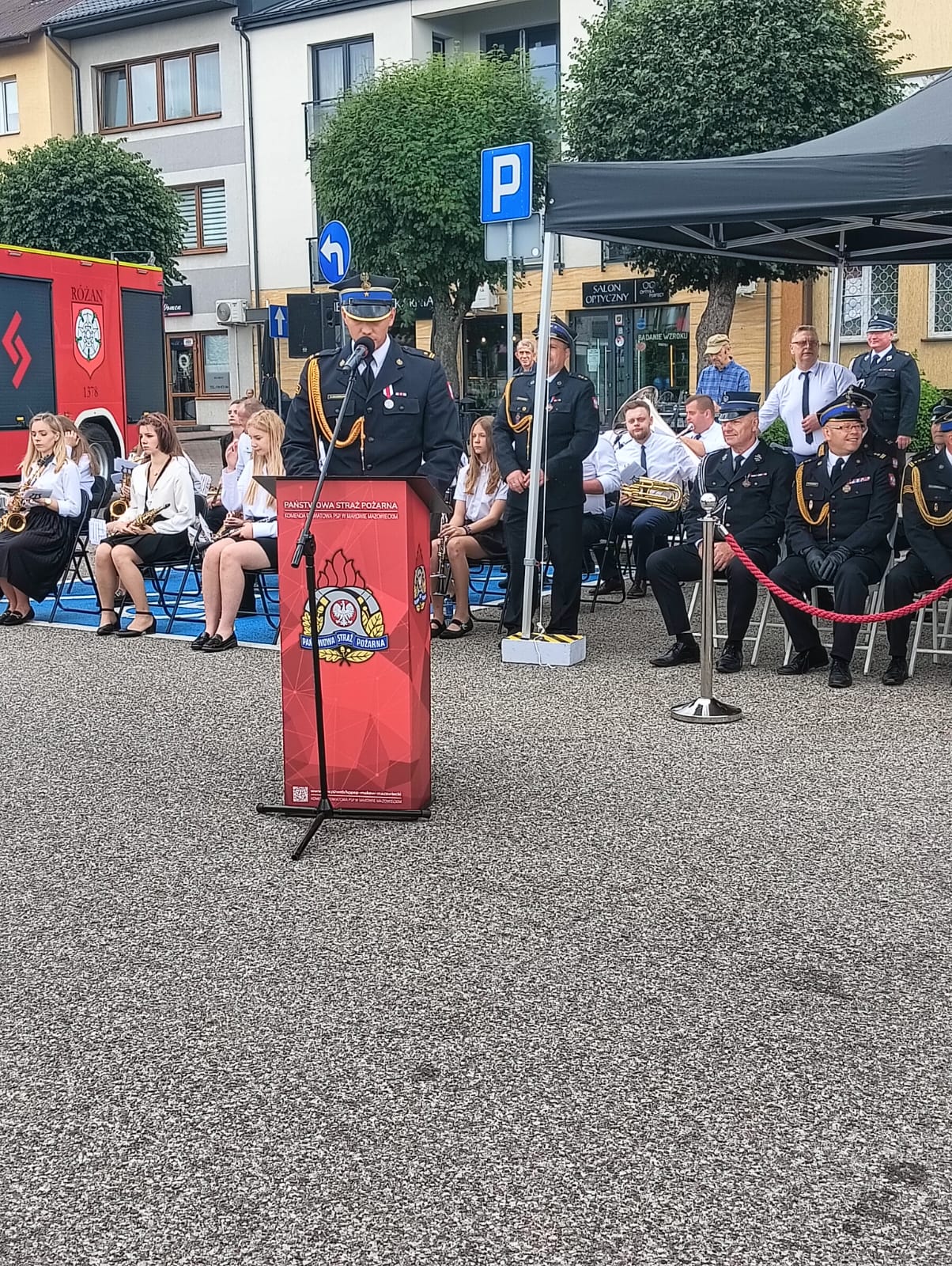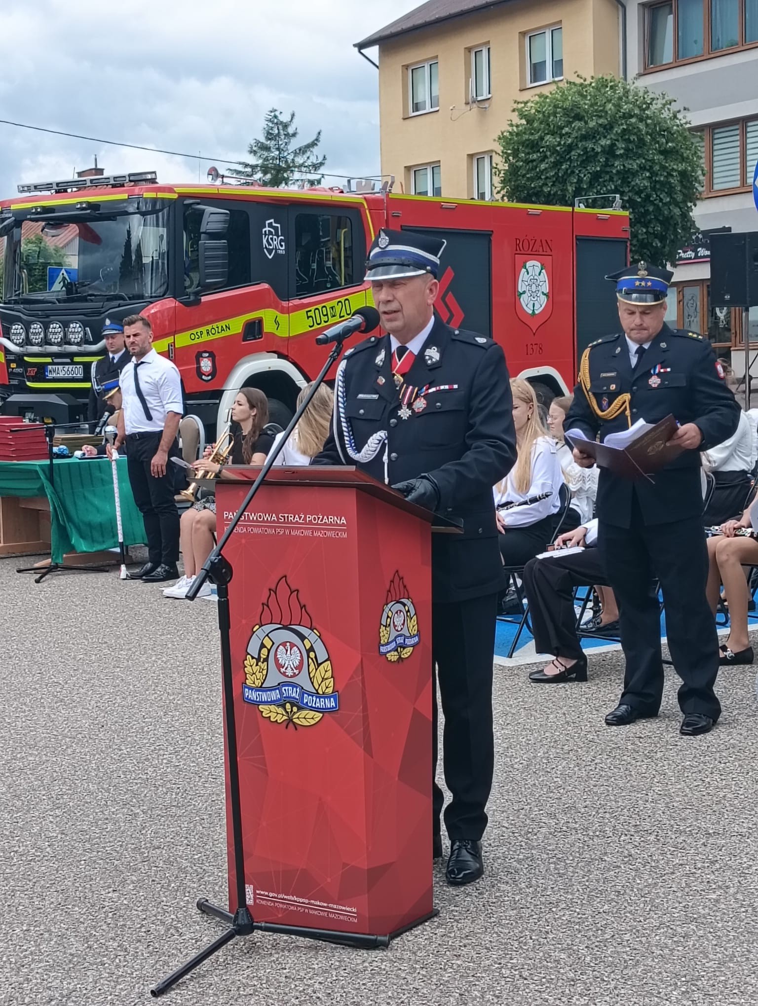 Komendant Powiatowy PSP w Makowie Mazowieckim mł. bryg. Bartosz Kołodziejski przywitał wszystkich uczestników obchodów oraz wygłosił okolicznościowe przemówienie w imieniu współorganizatorów: Pana Piotra Świderskiego - Burmistrza Miasta Różan, Pana Zbigniewa Deptuły – Prezesa Zarządu WFOŚiGW w Warszawie, jednocześnie Prezesa Zarządu Powiatowego ZOSP RP w Makowie Mazowieckim i Prezesa OSP Różan dh. Piotra Krawczyka.