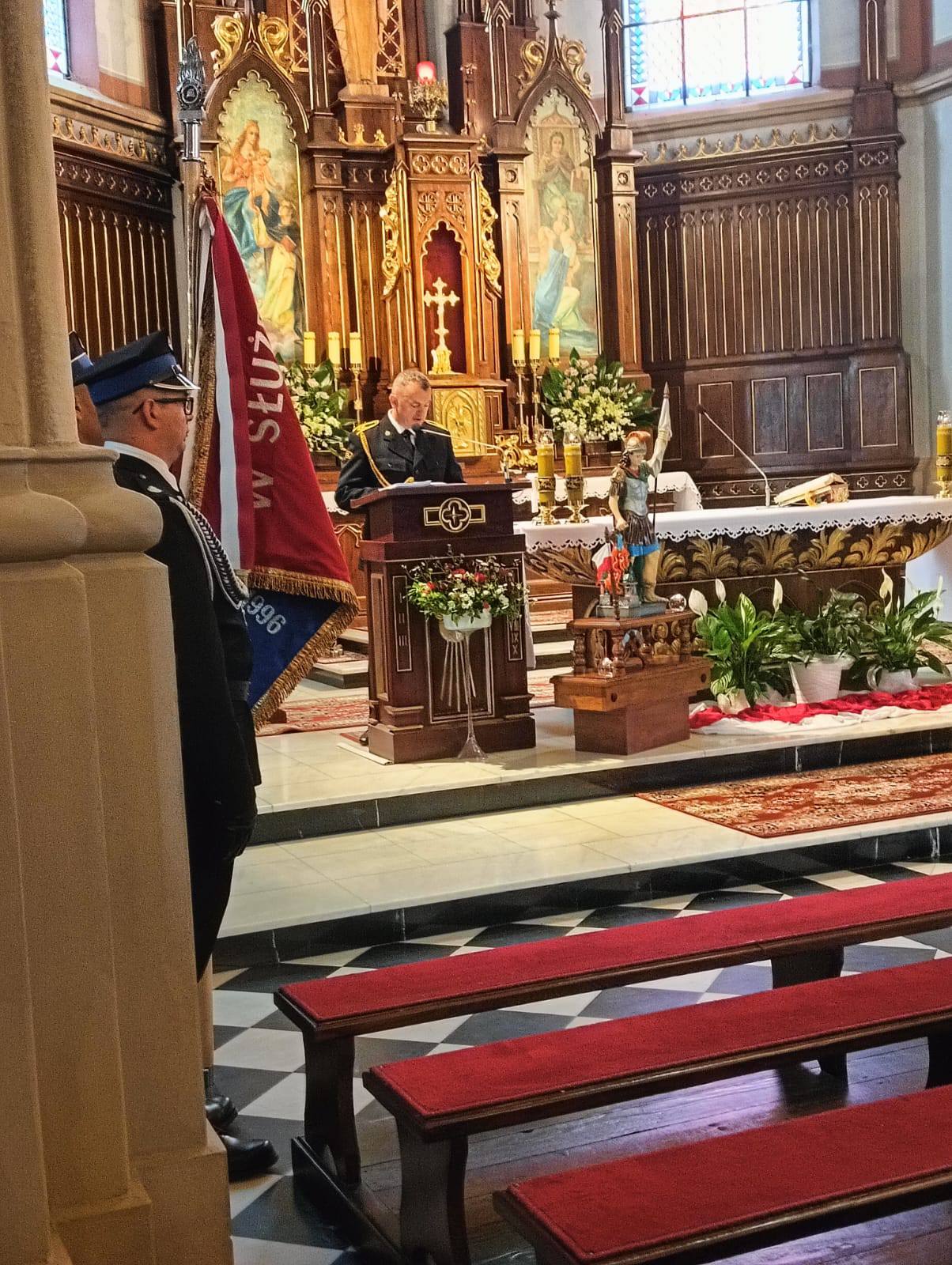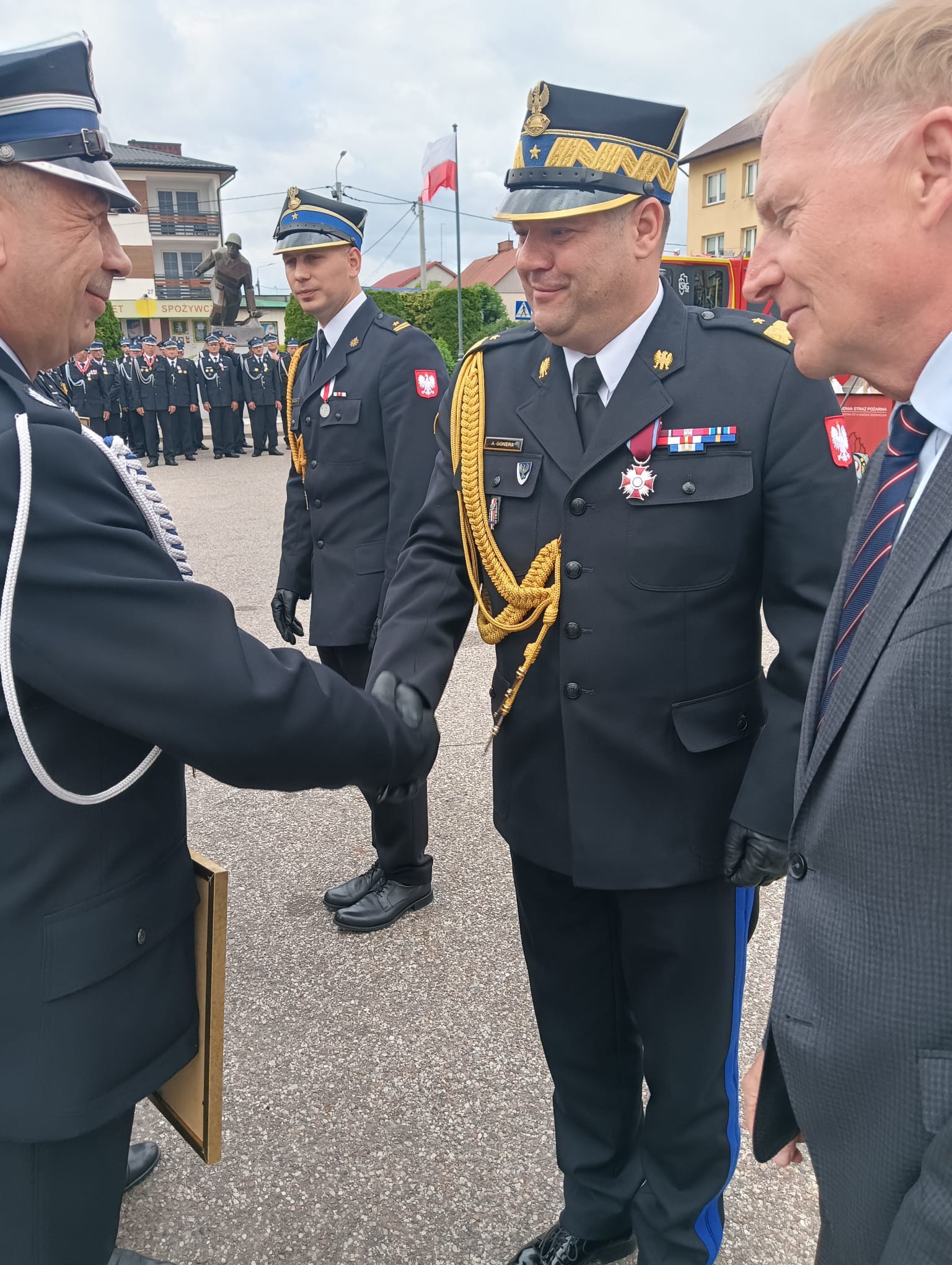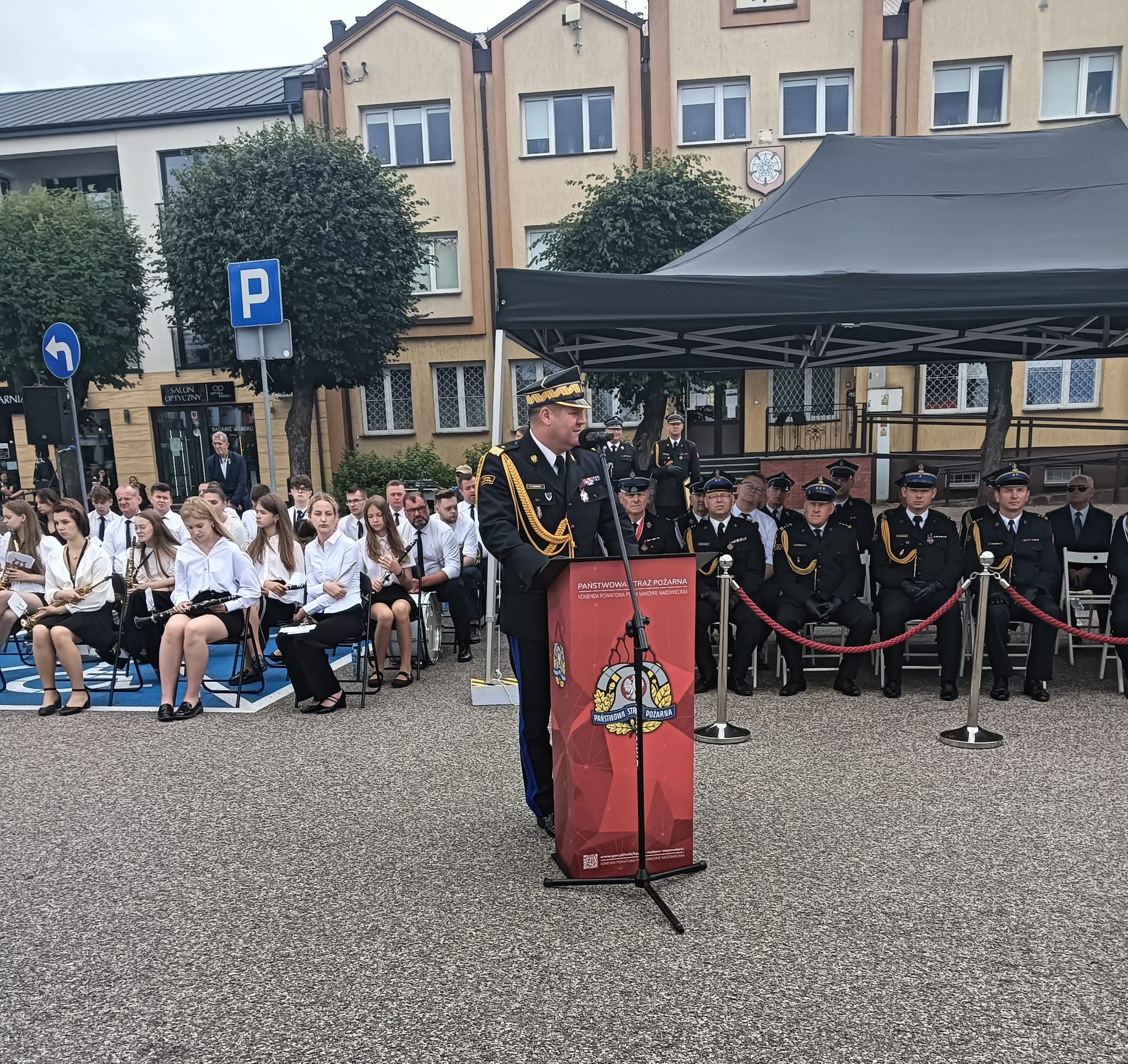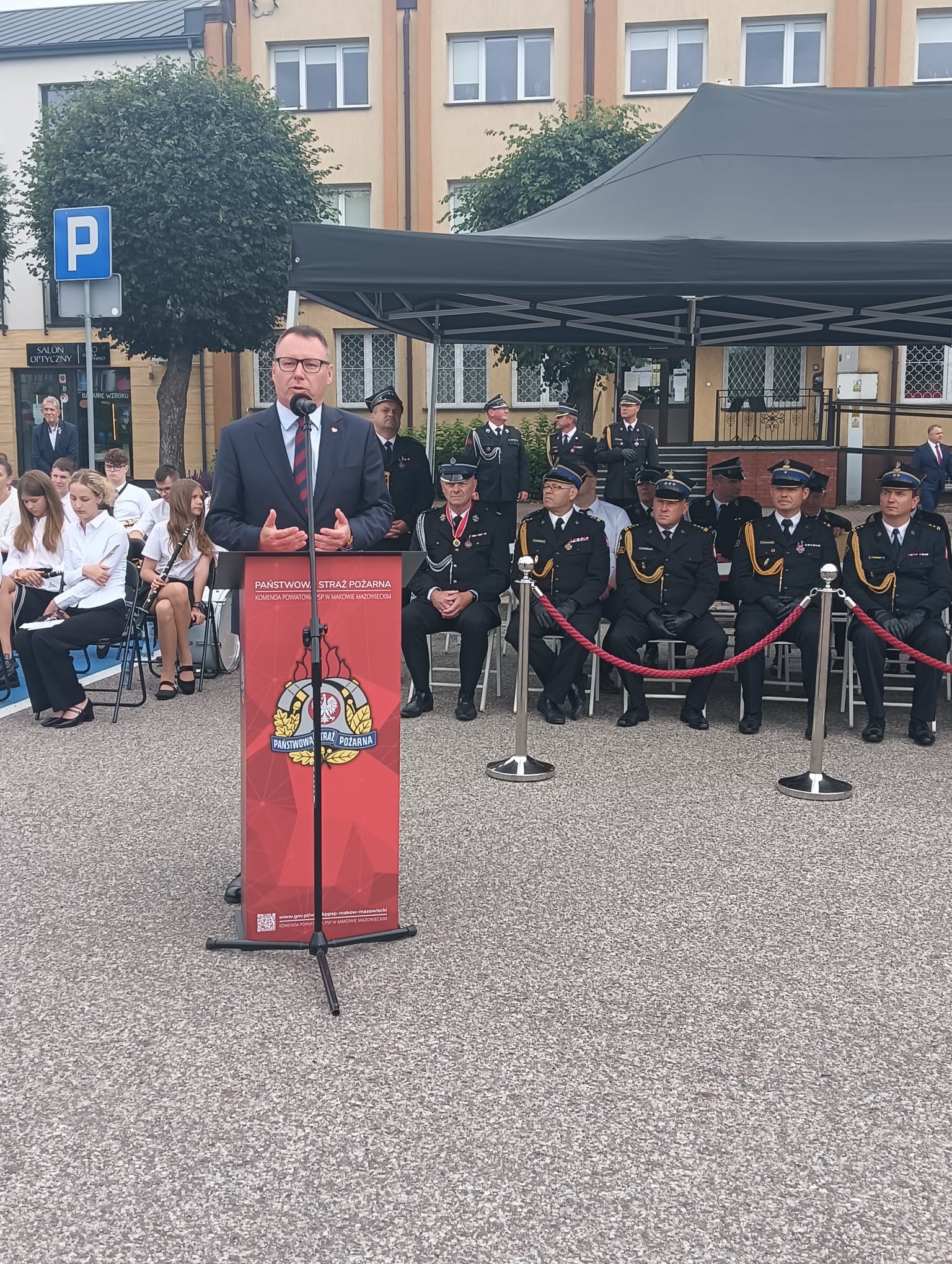 Komendant Powiatowy PSP w Makowie Mazowieckim mł. bryg. Bartosz Kołodziejski przywitał wszystkich uczestników obchodów oraz wygłosił okolicznościowe przemówienie w imieniu współorganizatorów: Pana Piotra Świderskiego - Burmistrza Miasta Różan, Pana Zbigniewa Deptuły – Prezesa Zarządu WFOŚiGW w Warszawie, jednocześnie Prezesa Zarządu Powiatowego ZOSP RP w Makowie Mazowieckim i Prezesa OSP Różan dh. Piotra Krawczyka.
