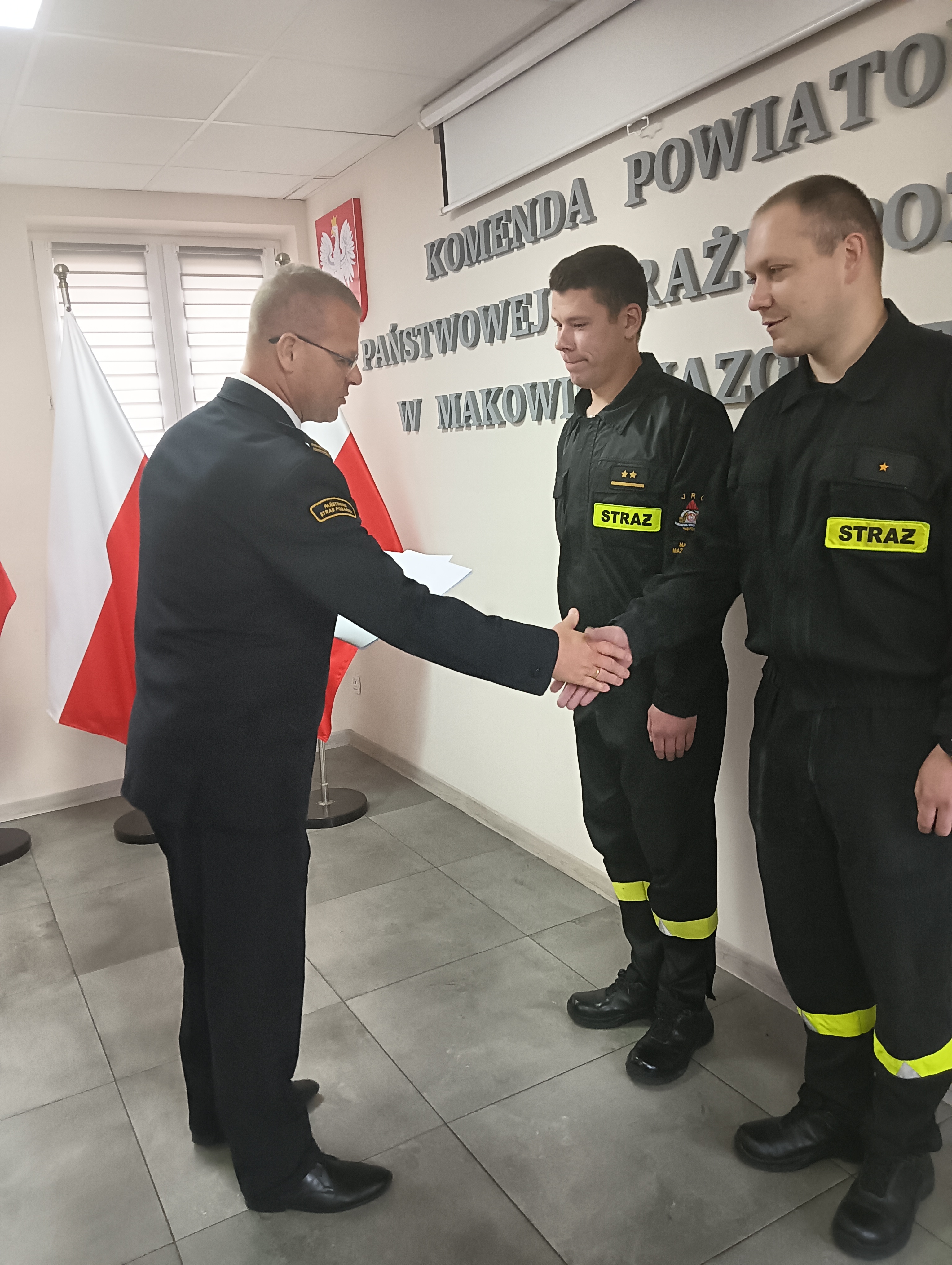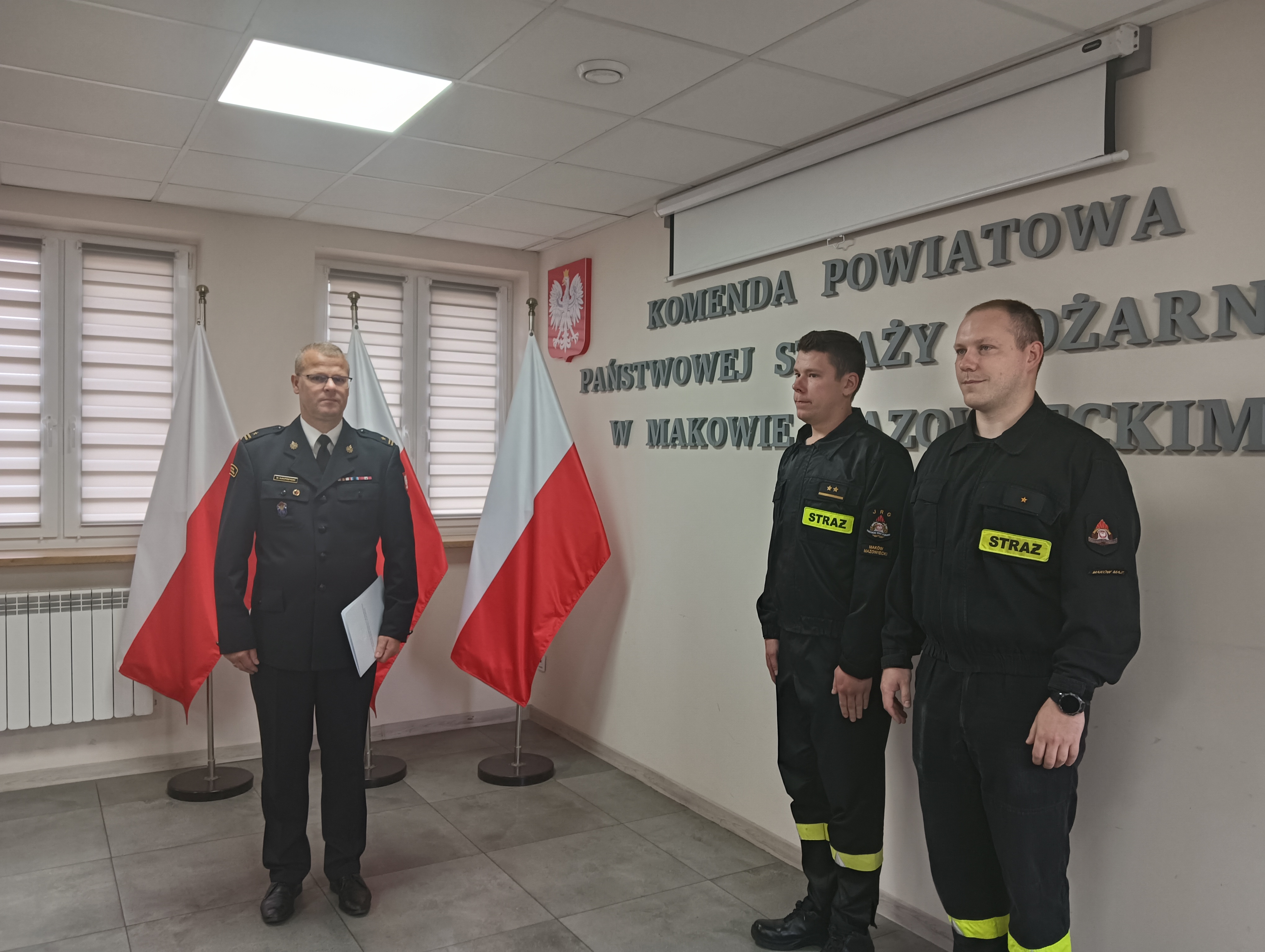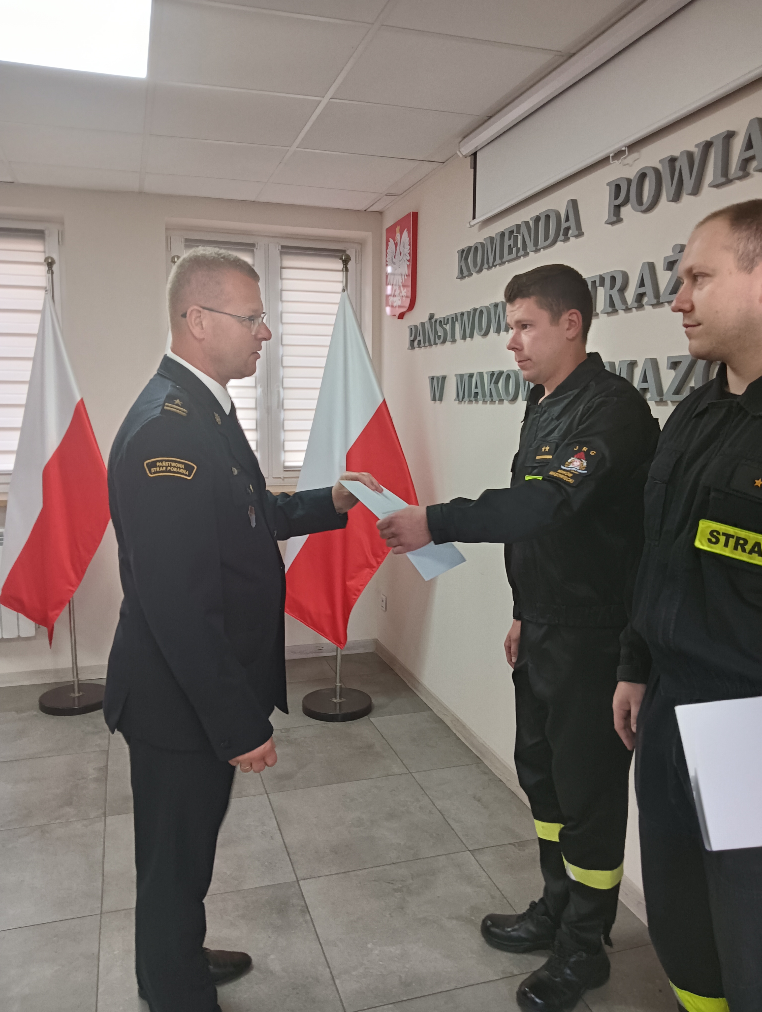 11 lipca 2025 roku Zastępca Komendanta Powiatowego Państwowej Straży Pożarnej w Makowie Mazowieckim mł. bryg. Michał Kacprzycki, w imieniu Mazowieckiego Komendanta Wojewódzkiego PSP, dokonał wręczenia nagród wyróżnionym funkcjonariuszom podczas uroczystej zbiórki.