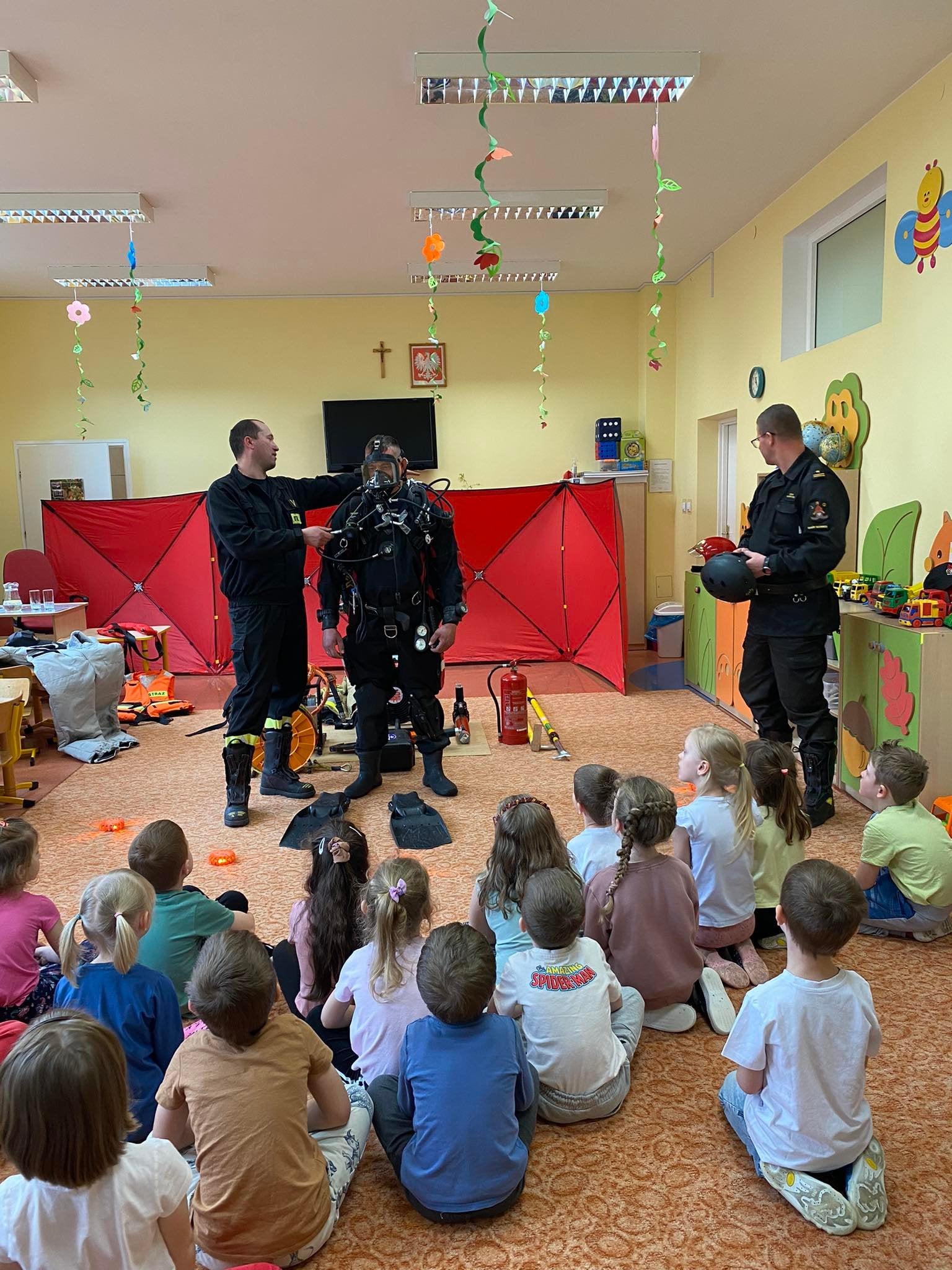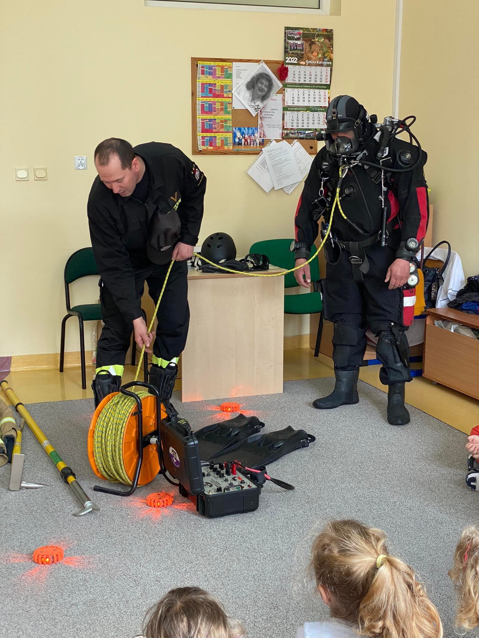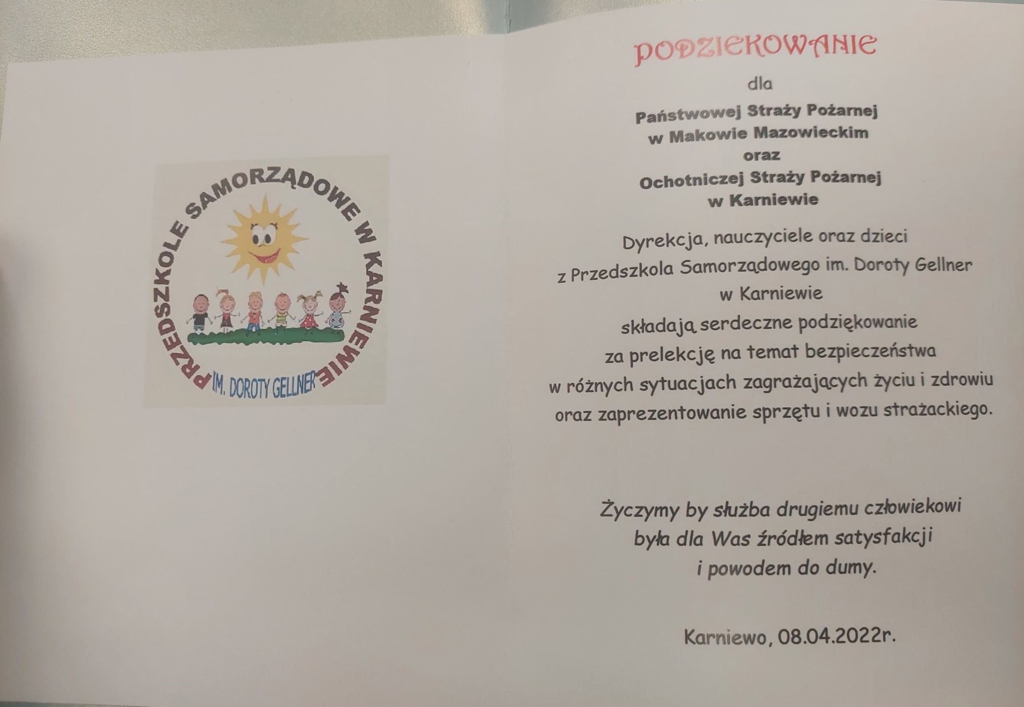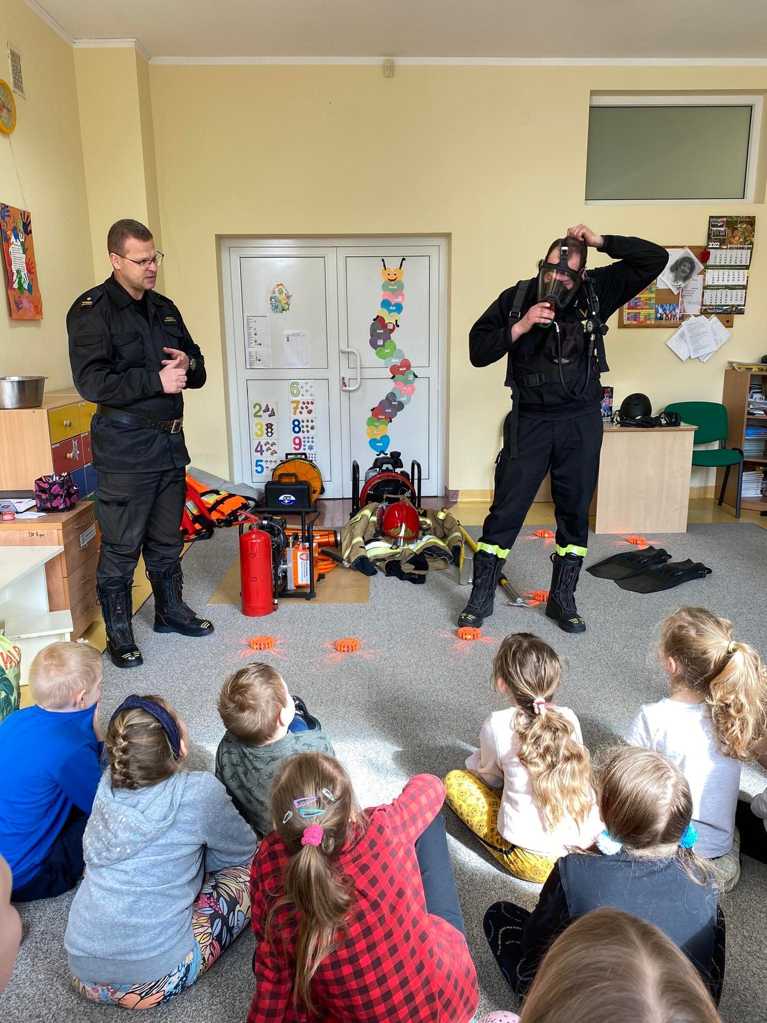 8 kwietnia 2022r. Strażacy z Komendy Powiatowej Państwowej Straży Pożarnej w Makowie Mazowieckim oraz Ochotniczej Straży Pożarnej w Karniewie, przeprowadzili zajęcia z zakresu prewencji społecznej w Przedszkolu Samorządowym im. Doroty Gellner w Karniewie. Podczas spotkania poruszono tematy dot. zasad bezpieczeństwa oraz omówiono i pokazano sprzęt jakim dysponuje Straż Pożarna w tym Specjalistyczna Grupa Ratownictwa Wodno-Nurkowego "Maków 5".