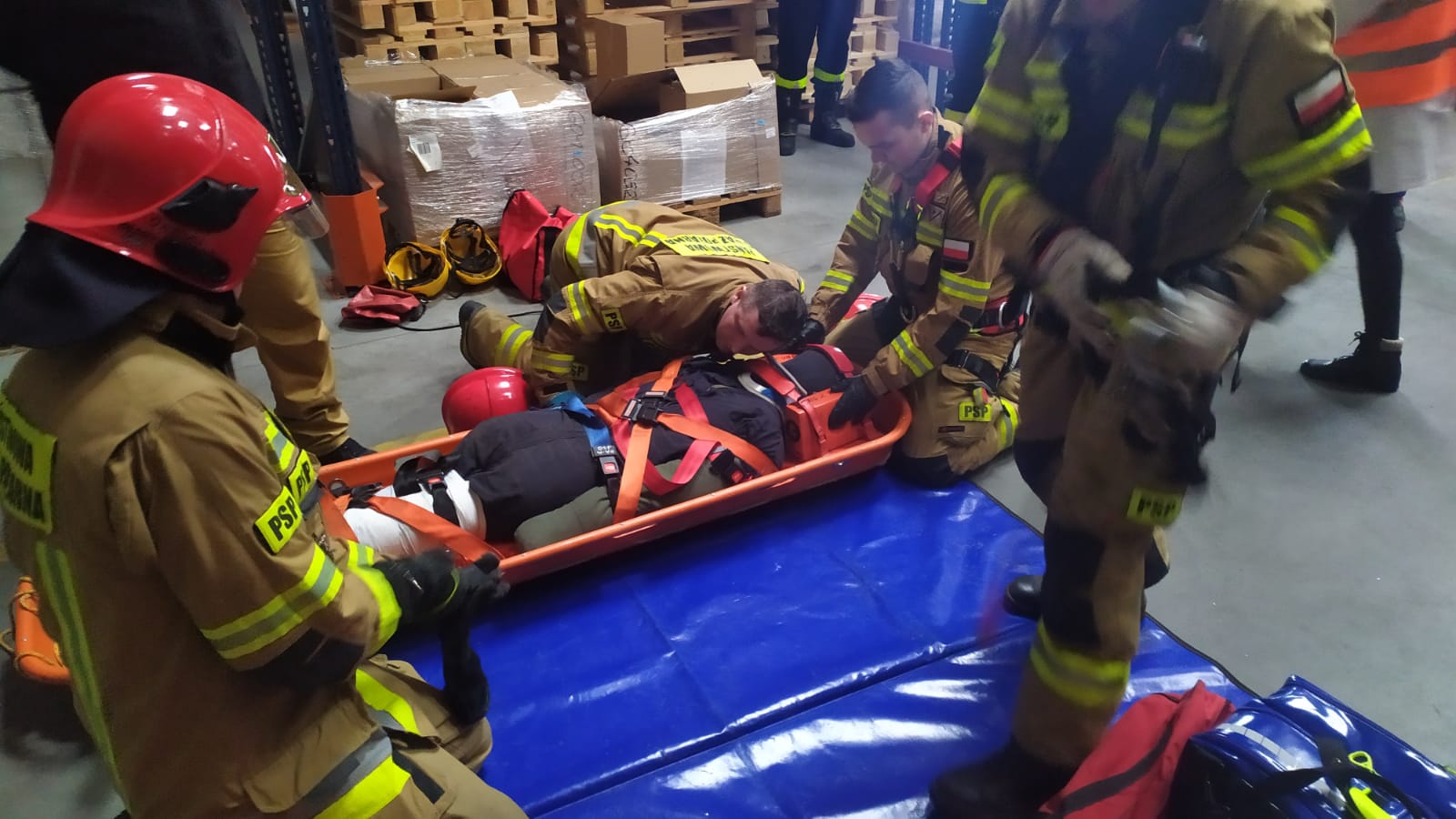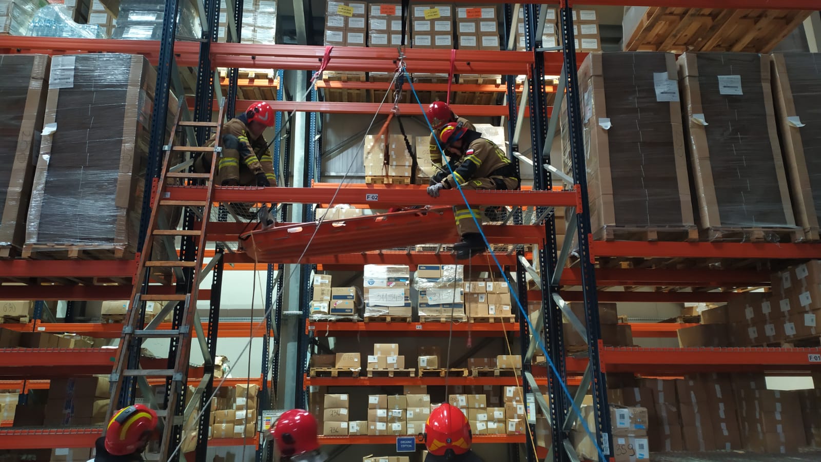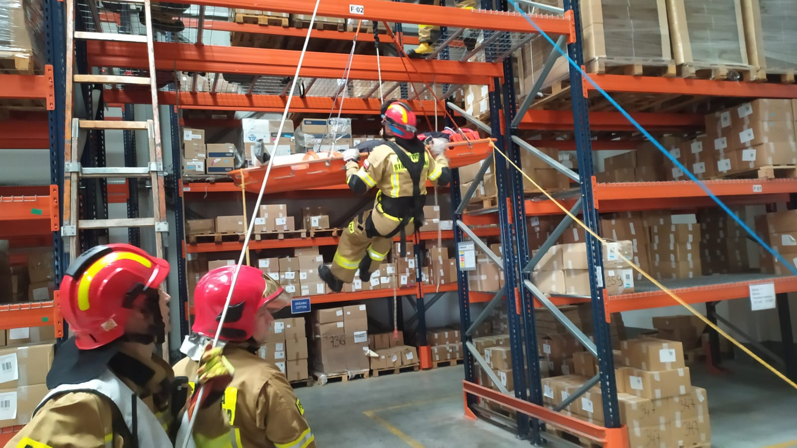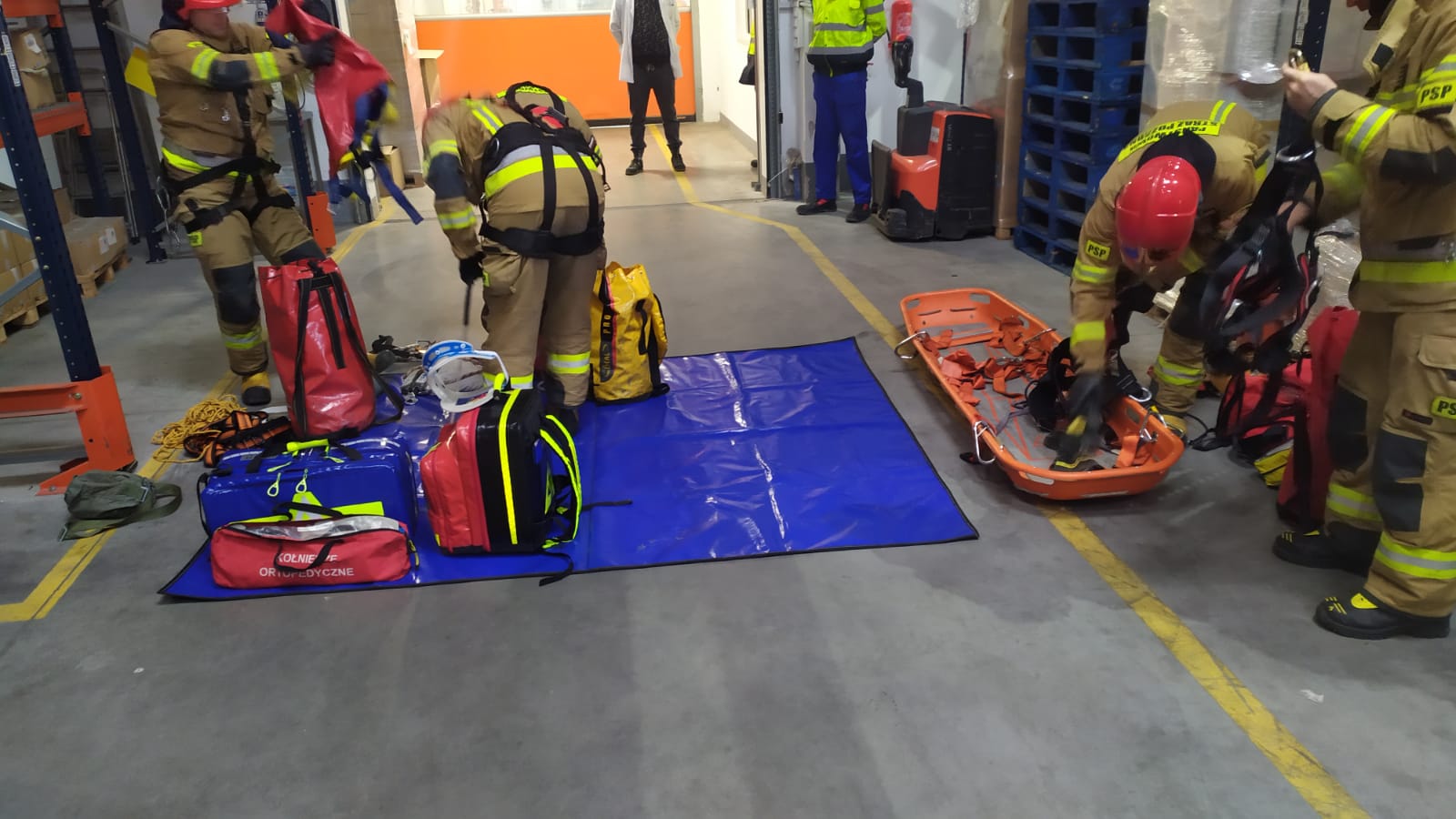 Scenariusz ćwiczeń zakładał upadek z wysokości jednego z pracowników magazynu. Poszkodowany z rozległymi obrażeniami znajdował się na jednym z regałów magazynu na wysokości około 4 metrów.
