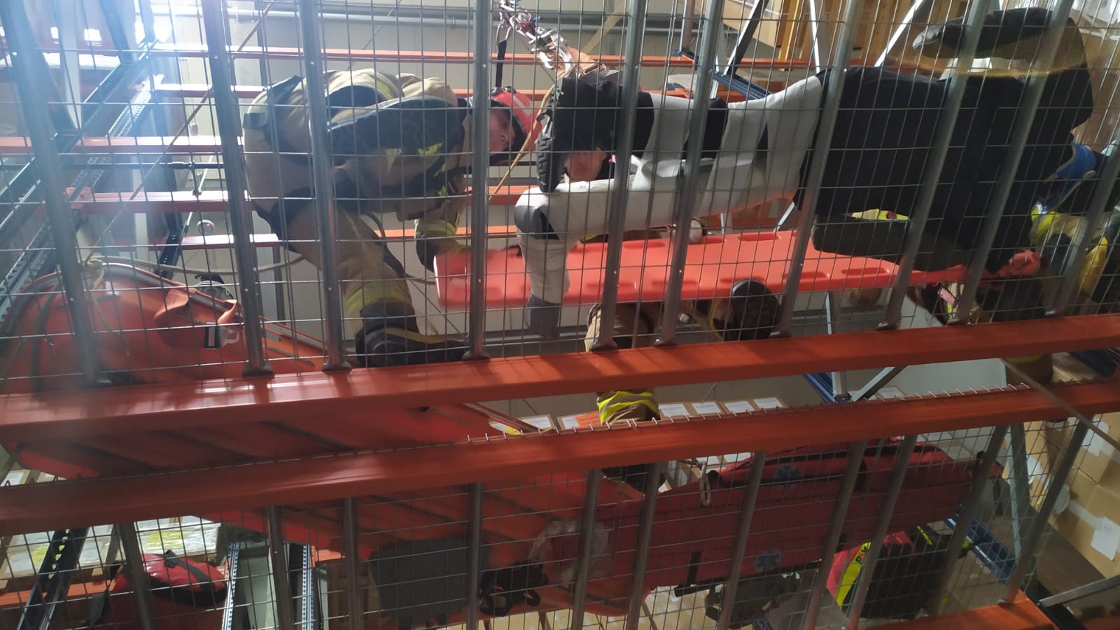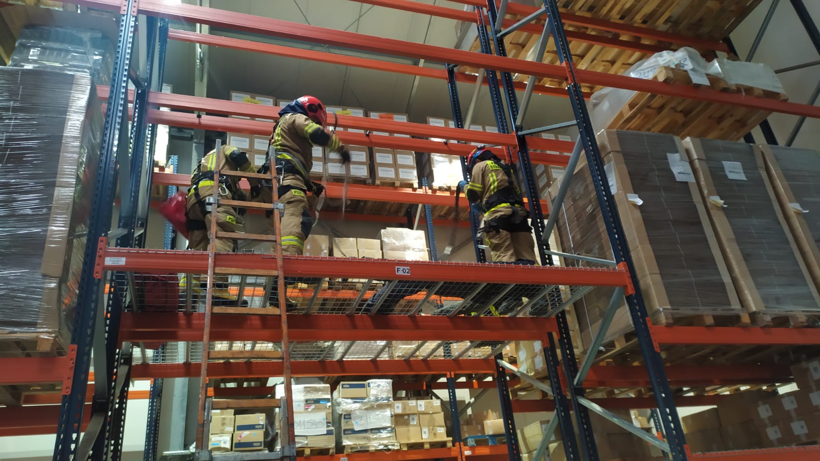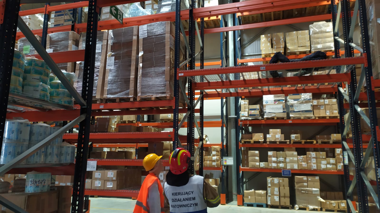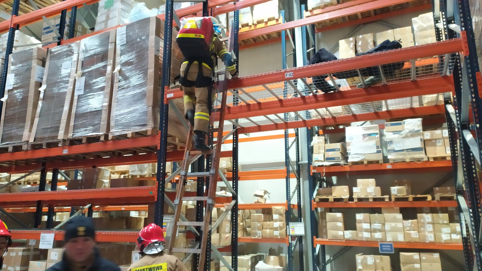 Scenariusz ćwiczeń zakładał upadek z wysokości jednego z pracowników magazynu. Poszkodowany z rozległymi obrażeniami znajdował się na jednym z regałów magazynu na wysokości około 4 metrów.