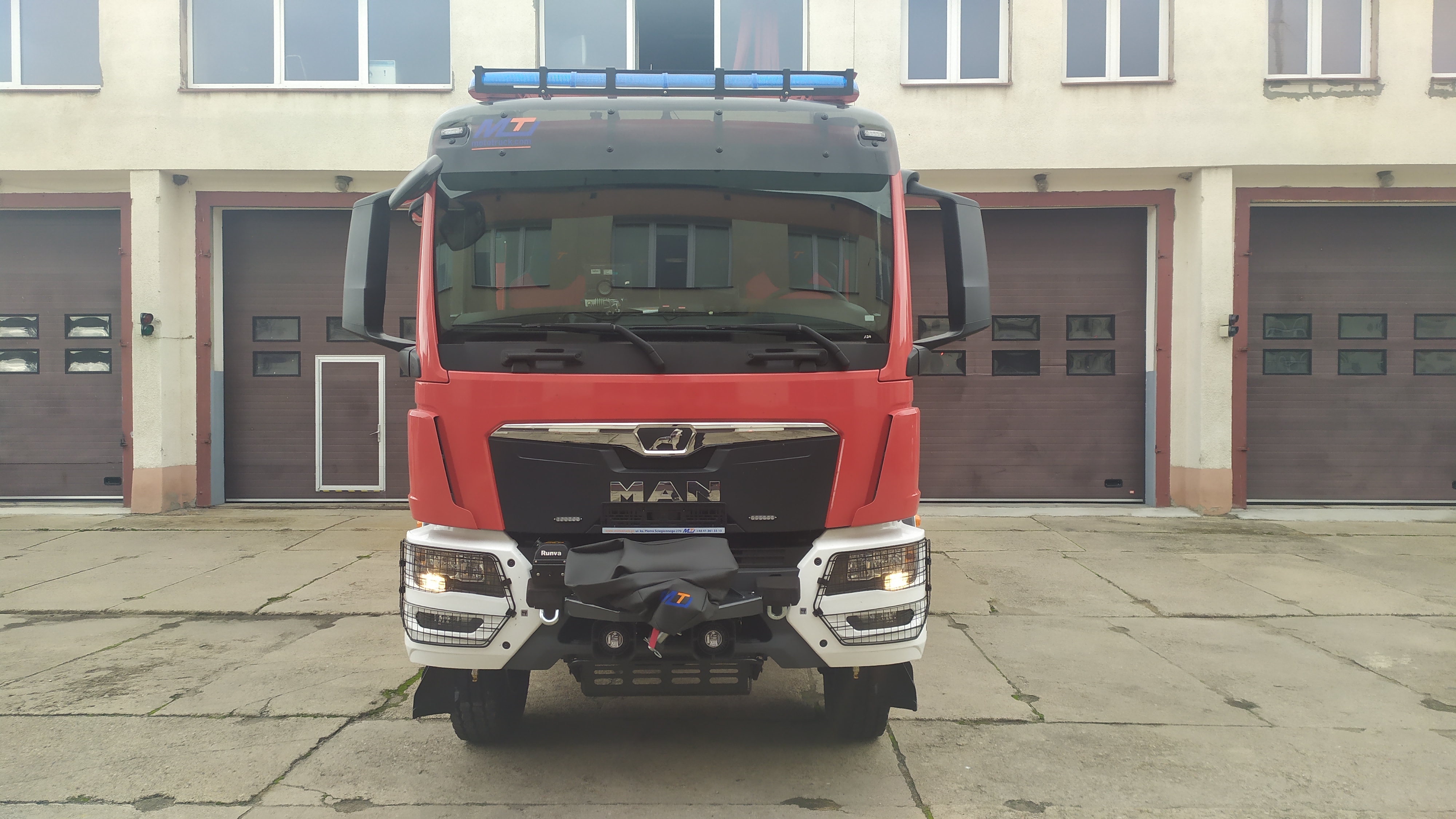 Ciężki samochód ratowniczo-gaśniczy GCBA 5/32 marki MAN 18.320 z napędem 4x4. Na wyposażeniu samochodu znajduje się m.in.: zbiornik wodny o pojemności 5.000 litrów, autopompa pożarnicza, zwijadło szybkiego natarcia, wyciągarka elektryczna, agregat prądotwórczy oraz maszt oświetleniowy pneumatyczny z lampami typu LED, niezależne ogrzewanie kabiny i przedziału autopompy.
