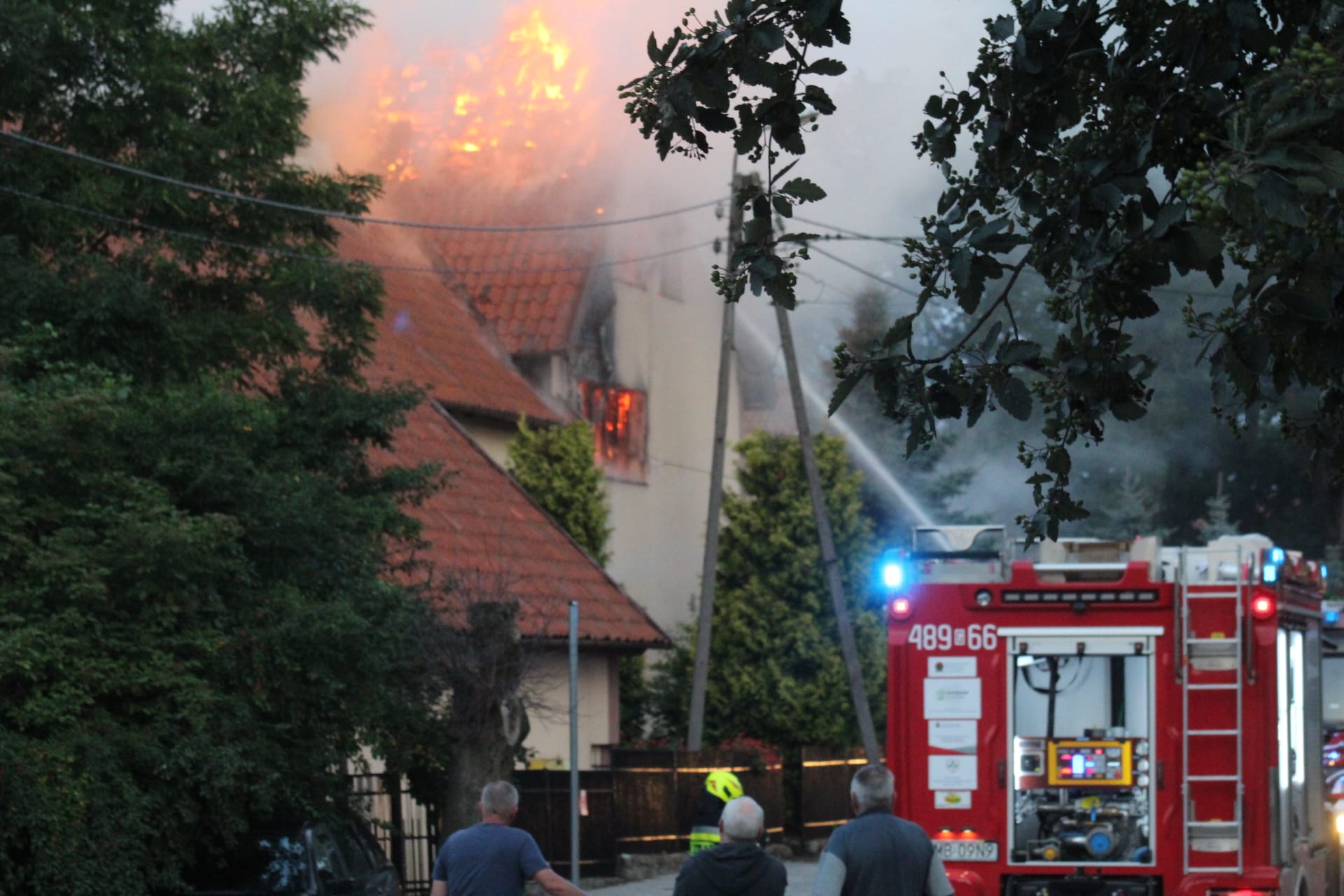 Po dojeździe do miejsca zdarzenia zastano pożar budynku mieszkalnego - plebanii. Obiekt o konstrukcji murowanej, dach pokryty dachówką ceramiczną w całości objęty pożarem. Uzyskano informację o możliwej obecności osoby w budynku. Na miejsce dodatkowo zadysponowano Pogotowie Energetyczne, Pogotowie Gazowe oraz Inspektora Nadzoru Budowlanego i władze samorządowe.