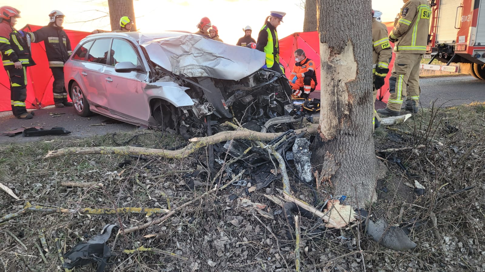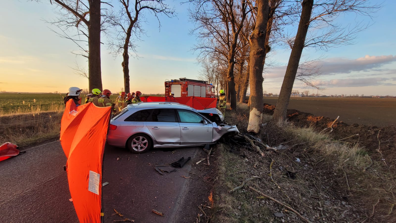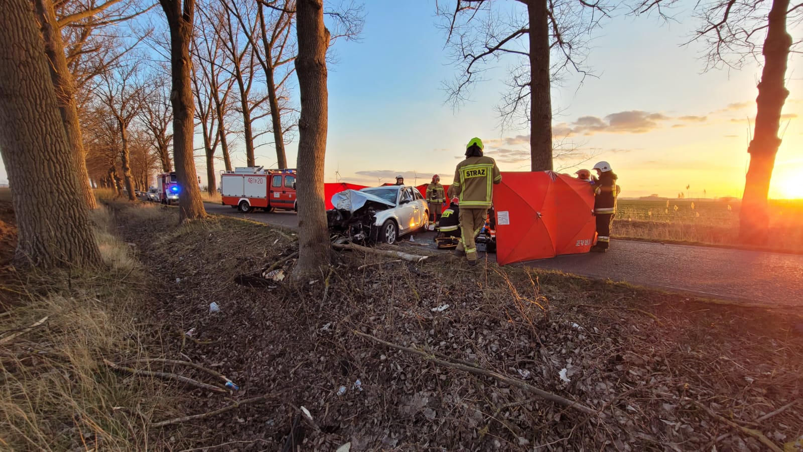 Po dojeździe 2 zastępów z JRG Malbork oraz zastępu OSP Szymankowo i OSP Miłoradz zastano samochód osobowy marki Audi po uderzeniu czołowym w drzewo. W pojeździe najdowała się jedna osoba poszkodowana bez czynności życiowych. Droga powiatowa zablokowana była w obu kierunkach.