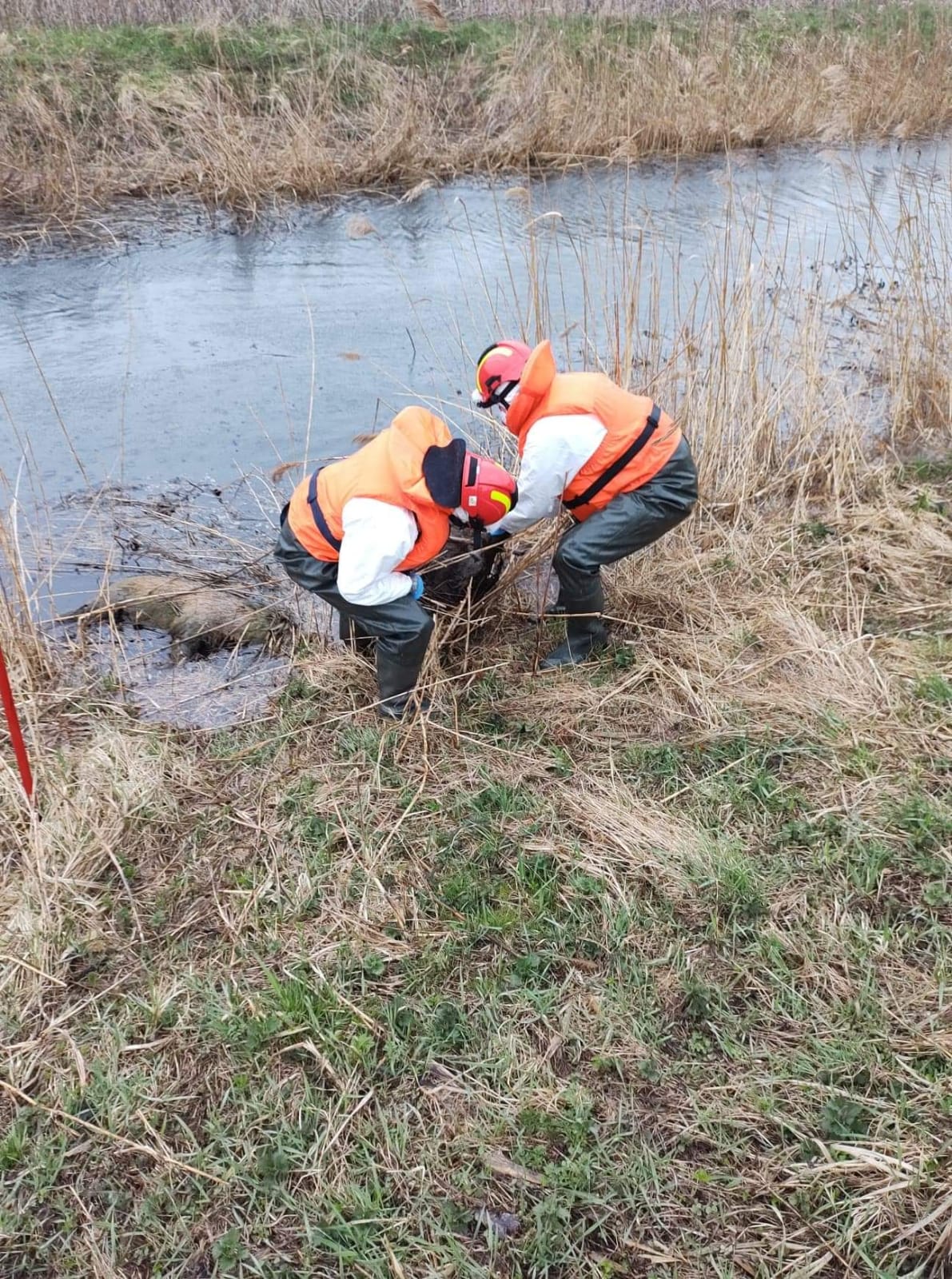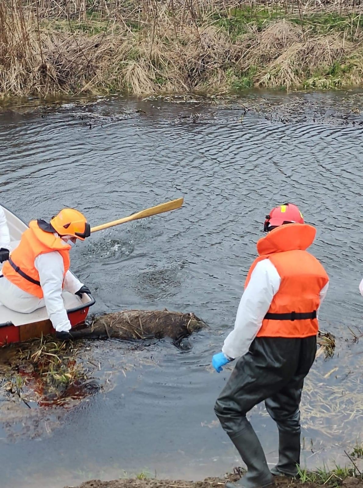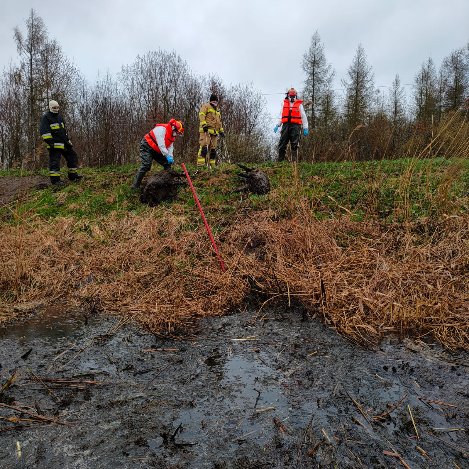 Działania zastępów polegały na: Zabezpieczeniu miejsca zdarzenia. Przeszukaniu brzegu kanału Stary Nogat na odcinku ok. 5 km w kierunku Michałowa celem lokalizacji martwych zwierząt. Lokalizacji dzików rozmieszczonych w różnych częściach kanału i w różnych odległościach od brzegu (4-6m). Do dysponowaniu zastępu OSP Miłoradz z łodzią płaskodenną. Dojazd zastępu OSP Miłoradz i SLRR z JRG Malbork. Zwodowaniu łodzi. Ratownicy w pełnym zabezpieczeniu (ubrania ochronne, rękawice i maski) z łodzi przy użyciu bosaków sprowadzali martwe zwierzęta na brzeg rzeki. Ostateczne wyłowienie 15 martwych dzików i przewiezienie przy pomocy Manitu w wyznaczone miejsce. Dojazd przedstawiciela Wód Polskich i przekazanie miejsca objętego działaniem ratowniczym. Wcześniej poinformowano Powiatowy Inspektorat Weterynarii o zaistniałej sytuacji. Zakończenie działań i powrót do jednostki.