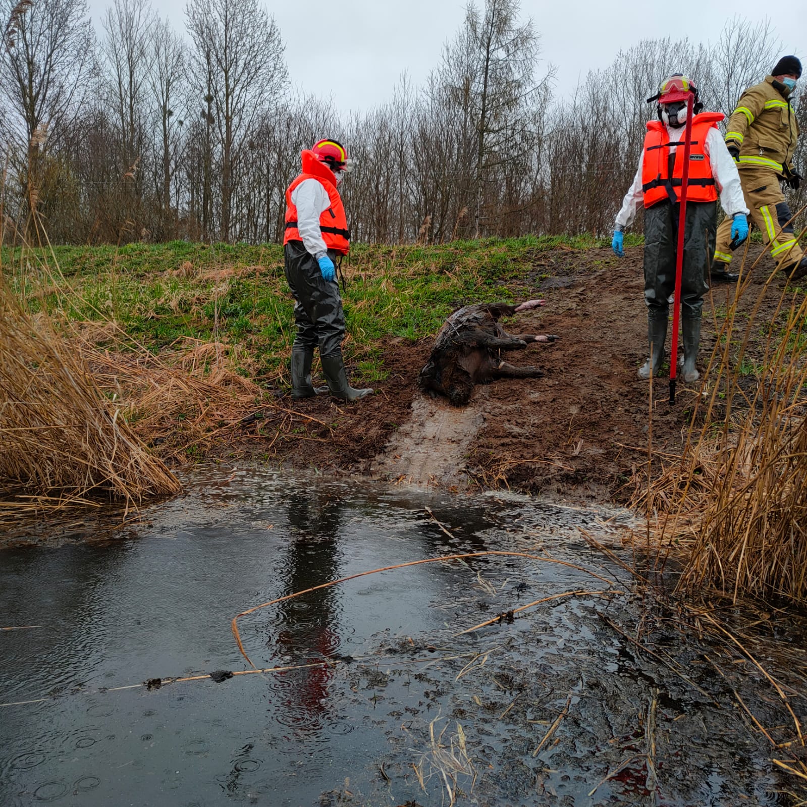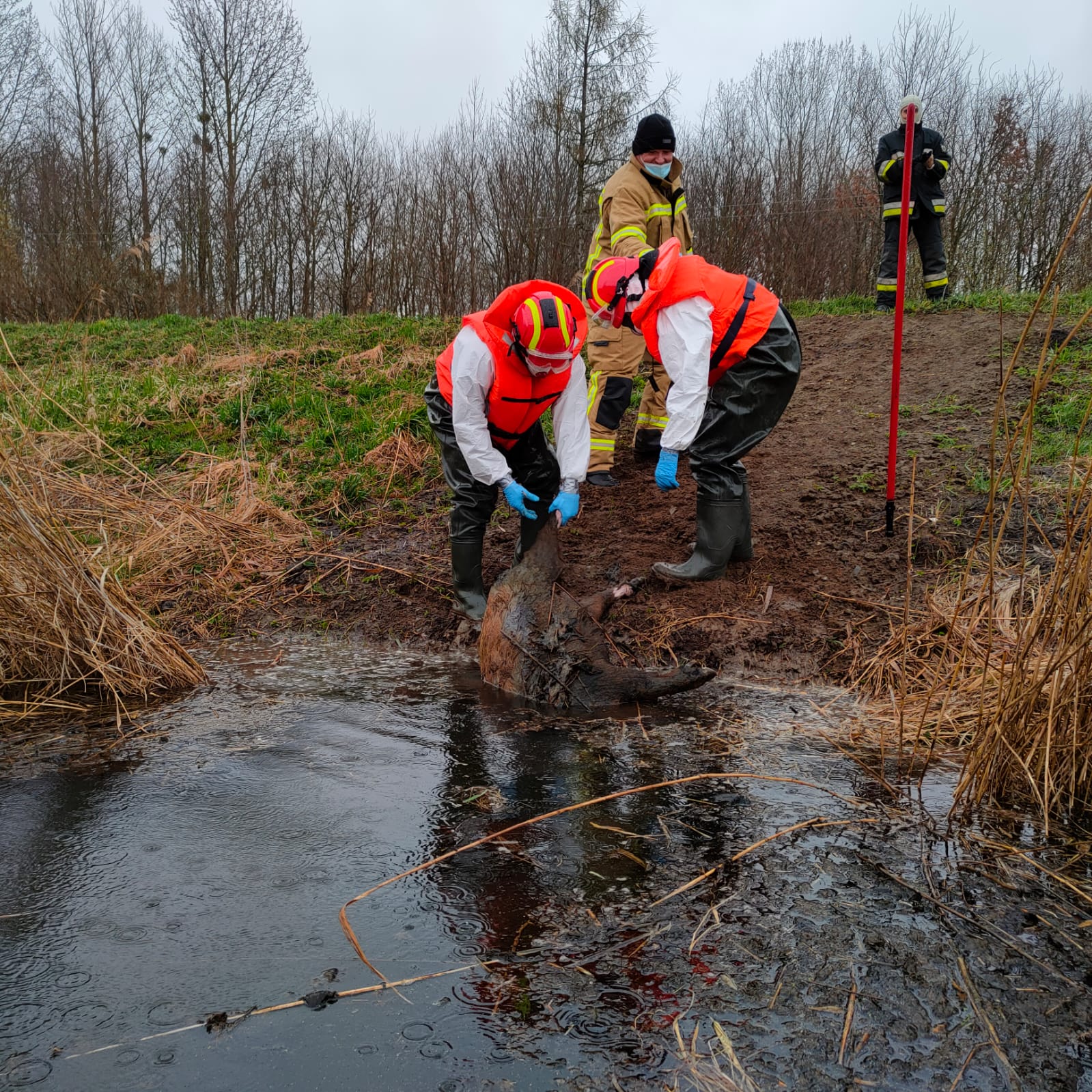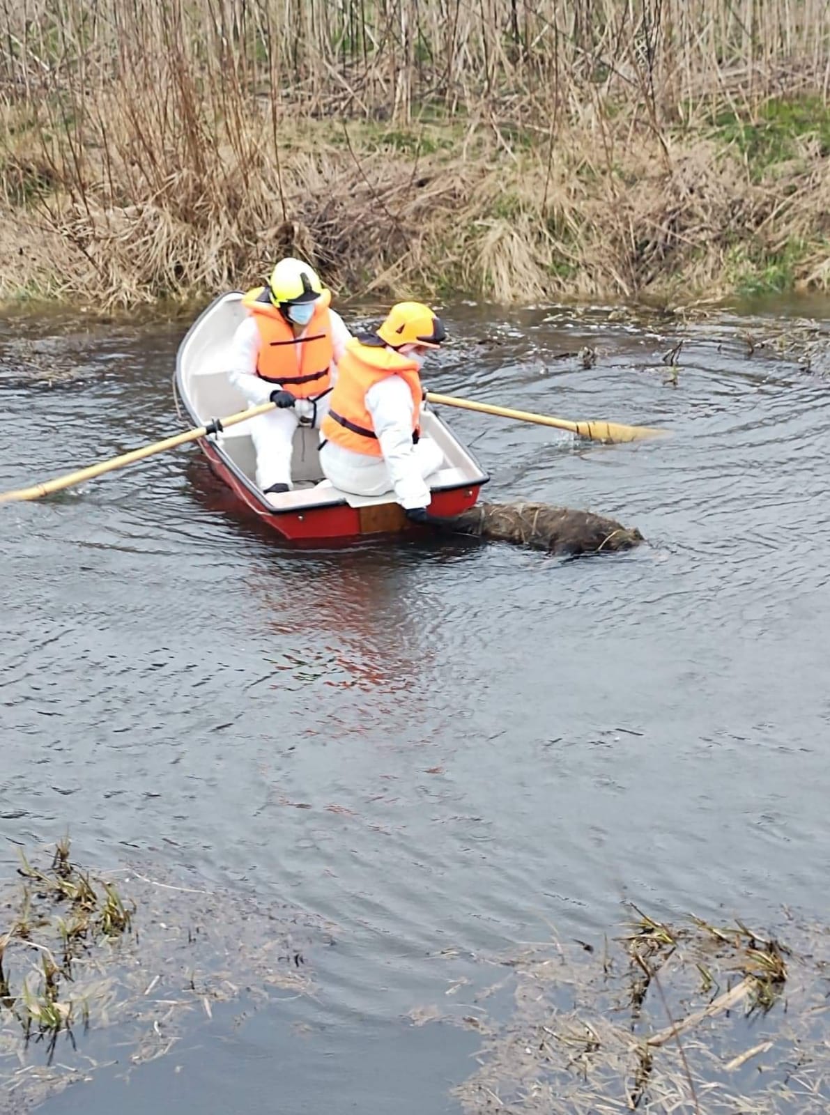 Działania zastępów polegały na: Zabezpieczeniu miejsca zdarzenia. Przeszukaniu brzegu kanału Stary Nogat na odcinku ok. 5 km w kierunku Michałowa celem lokalizacji martwych zwierząt. Lokalizacji dzików rozmieszczonych w różnych częściach kanału i w różnych odległościach od brzegu (4-6m). Do dysponowaniu zastępu OSP Miłoradz z łodzią płaskodenną. Dojazd zastępu OSP Miłoradz i SLRR z JRG Malbork. Zwodowaniu łodzi. Ratownicy w pełnym zabezpieczeniu (ubrania ochronne, rękawice i maski) z łodzi przy użyciu bosaków sprowadzali martwe zwierzęta na brzeg rzeki. Ostateczne wyłowienie 15 martwych dzików i przewiezienie przy pomocy Manitu w wyznaczone miejsce. Dojazd przedstawiciela Wód Polskich i przekazanie miejsca objętego działaniem ratowniczym. Wcześniej poinformowano Powiatowy Inspektorat Weterynarii o zaistniałej sytuacji. Zakończenie działań i powrót do jednostki.
