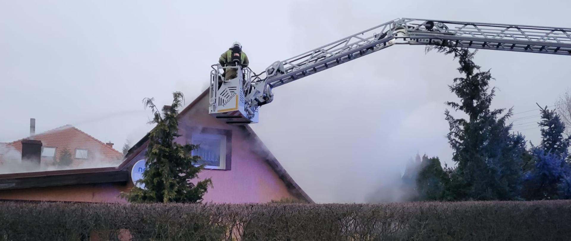 Zabezpieczeniu miejsca zdarzenia poprzez właściwe ustawienie pojazdów z włączoną sygnalizacją świetlną. Odłączeniu zasilania elektrycznego oraz instalacji gazu ziemnego. Podaniu prądu wody na palący się szczyt budynku. Podaniu drugiego prądu wody na drugi szczyt budynku. Rozstawieniu drabiny mechanicznej i schładzaniu dachu oraz instalacji PV. Ugaszeniu pożaru oraz pracach rozbiórkowych przy opierzeniu dachu.