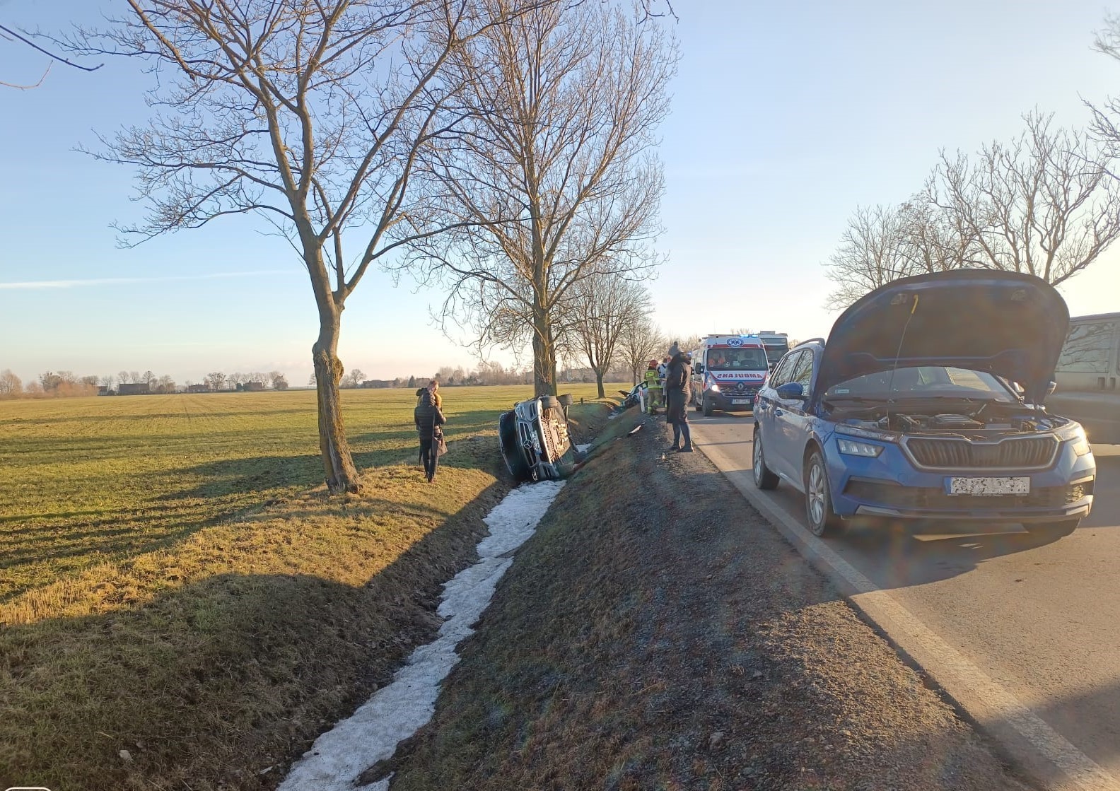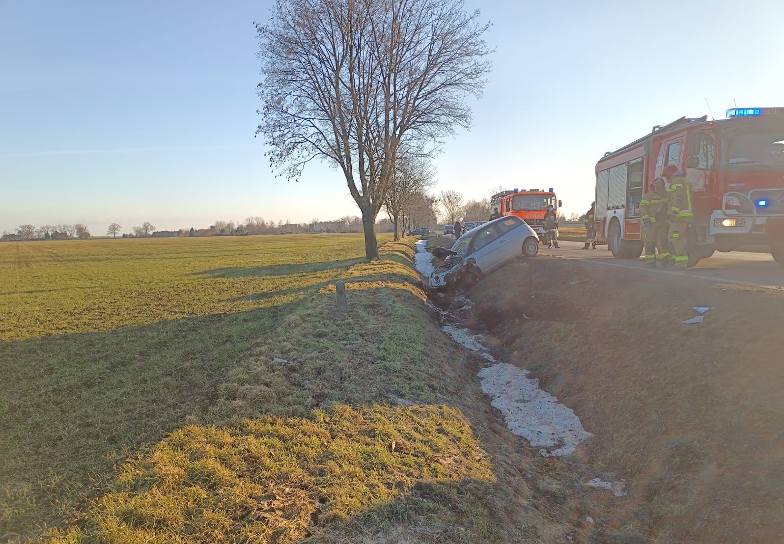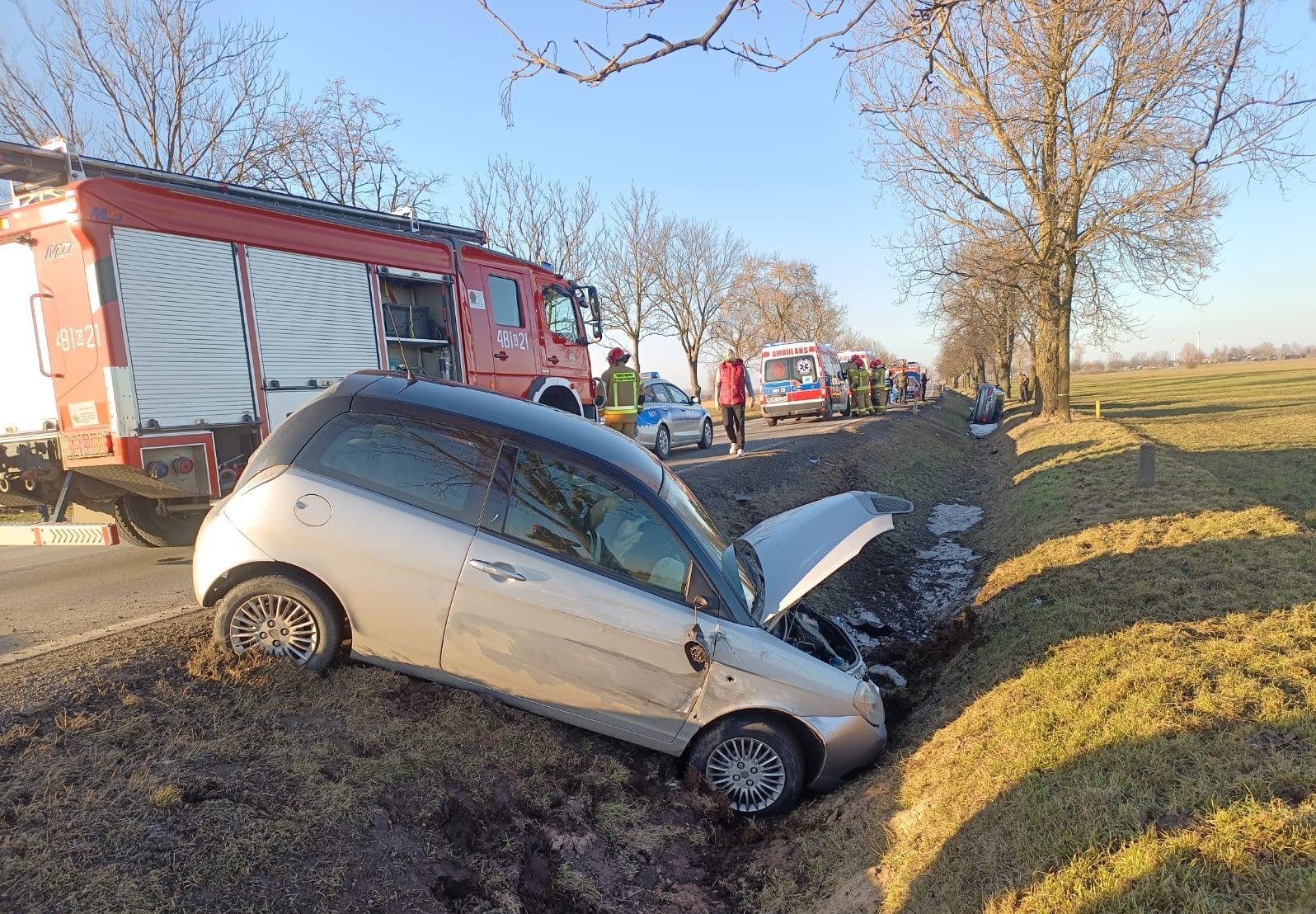Zadysponowano 3 zastępy straży pożarnej. Na miejscu kierujący działaniami zastał 3 auta po zderzeniu. 1 sam. na pasie jezdni (Skoda), 2 sam. na boku w rowie (Mercedes), 3 sam. w rowie na kołach (Lancia). Na miejscu Policja. Wszystkie osoby opuściły uszkodzone pojazdy o własnych siłach.