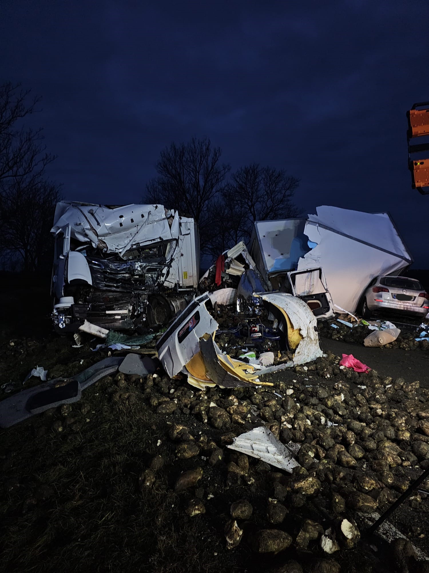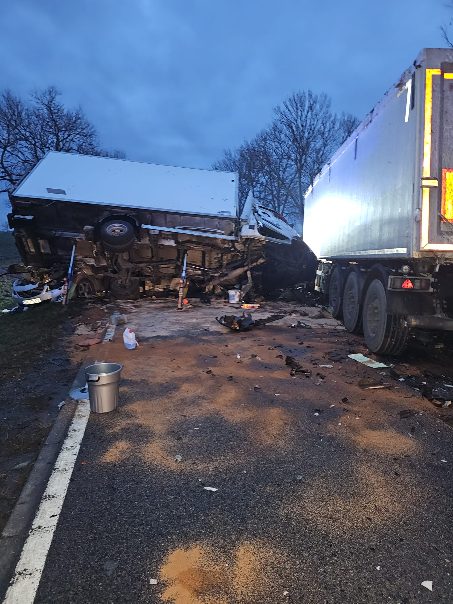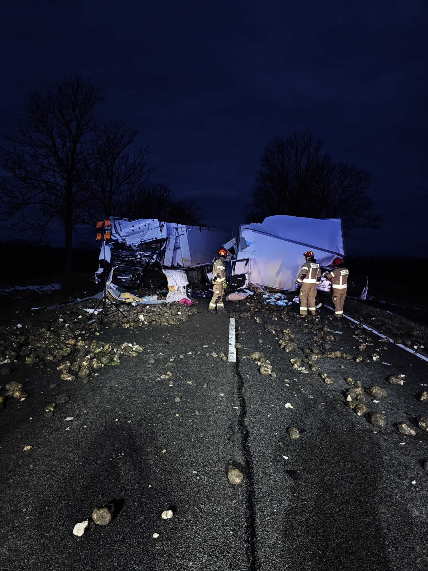Po dojeździe zastępów z JRG Malbork do miejsca zdarzenia zastano zderzenie 4 aut (pojazd ciężarowy do przewozu buraków cukrowych, pojazd z chłodnią do przewozu art. spożywczych, Bus do przewozu osób oraz auto osobowe). Droga zablokowana w obu kierunkach. 2 pojazdy ciężarowe na drodze po zderzeniu czołowym. Podczas prowadzonych działań ratowniczych ZRM stwierdził zgon obu kierowców pojazdów ciężarowych. Mężczyzna kierujący pojazdem osobowym została zabrana przez ZRM a 16 osób podróżujących pojazdem typu Bus, nie odniosło obrażeń.